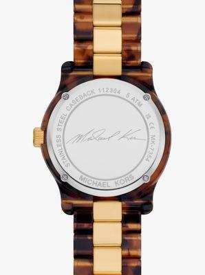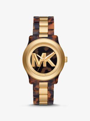From Michael Kors, this watch features: Acetate and gold tone stainless steel bracelet watch Gold logo dial Deployant buckle closureThree hand movementBand width approx. 20 mmCase size approx. 38mmCase thickness approx. 13.7mmInner circumference approx. : 175 /- 5mmWater resistance: 5 ATMImported.