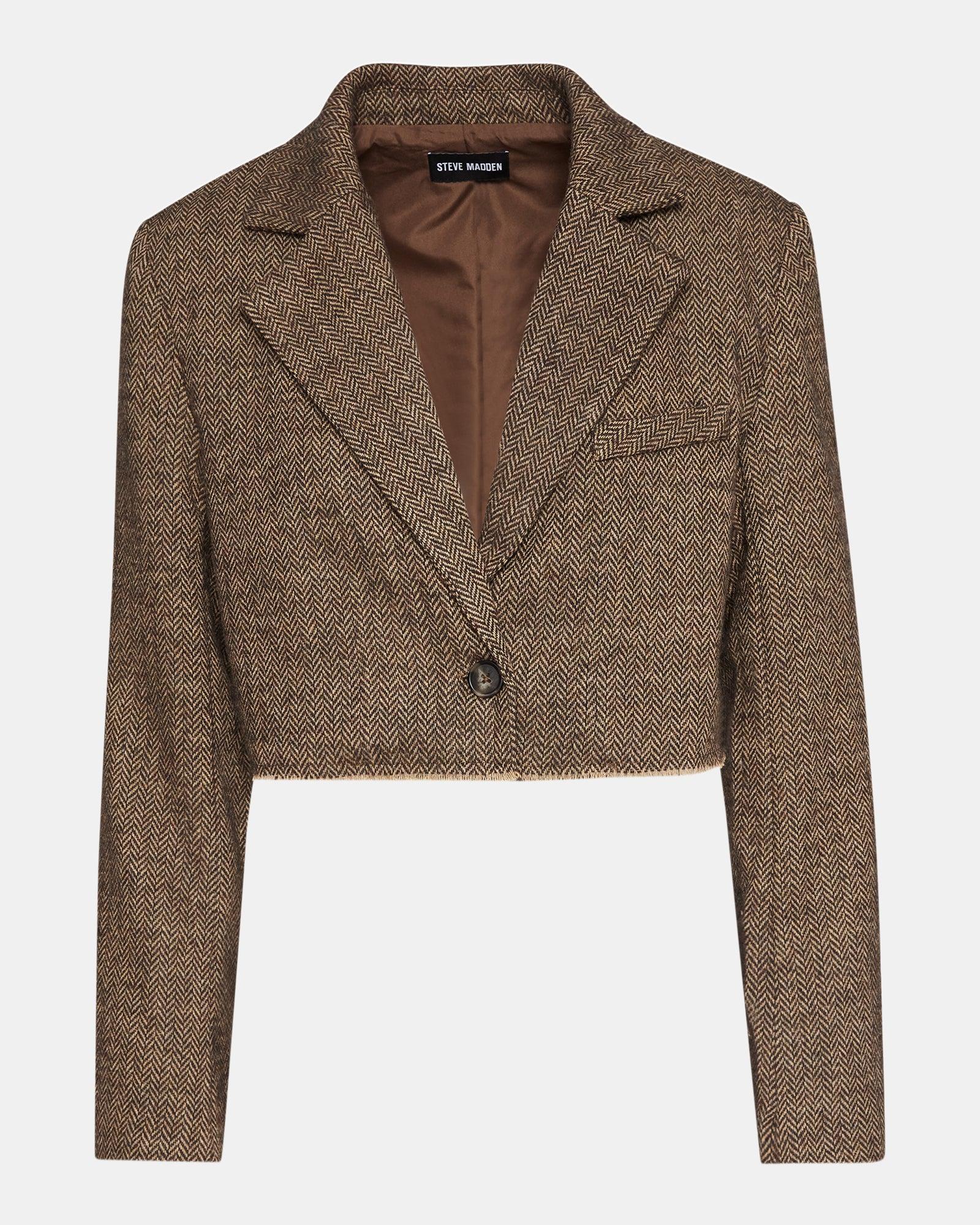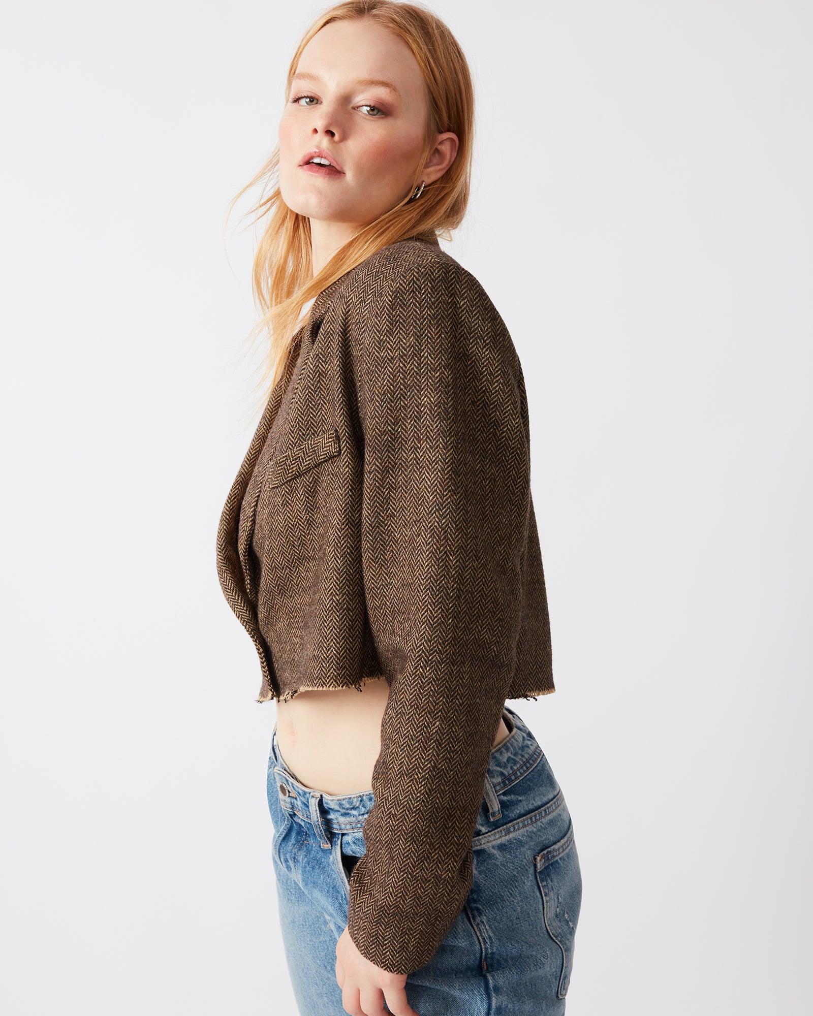 Elevate your wardrobe with the RUPI blazer. The menswear-inspired herringbone suiting offers a fashionable and professional look. The cropped design adds a modern touch. This blazer is perfect for pairing with shorts for a stylish and casual ensemble. Deconstructed cropped blazer One button front closure Nonfunctional chest welt pocket Raw hem Length: 17.5" 70% polyester 30% wool Care instructions: dry clean only Complete the look with the ADARE top Elynn is 5ft 9in and is wearing a size large Amy is 5ft 11in and is wearing a size small Imported