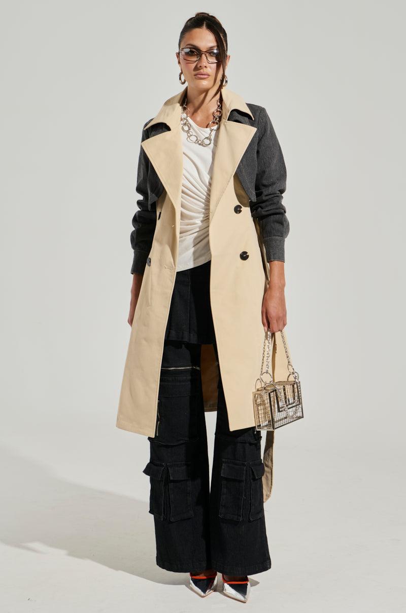 City slicker vibes in The AKIRA Label Rush Street Denim Overlay Trench. This stylish outerwear piece is crafted from a non-stretch, smooth weighted base fabrication and features a notch lapel collar, a double breasted buttoned front, welted side slant pockets, belt loops with a coordinating buckle waist belt, and a cropped dark wash denim overlay with a pointed collar, contrast stitching, and long sleeves with buttoned cuffs. Complete with a sleek inner lining, a paneled construction, and a longline silhouette. Pair over flared jeans and leather booties for a chic ensemble. - Shell: 100% Polyester, Shell 2: 80% Cotton 20% Polyester, Lining: 100% Polyester- Hand Wash Only- Little to No Stretch- Imported (all measurements approximate from size small)- 40” Shoulder to Hem- 25” Sleeves- 15” Shoulder to Shoulder- Model is 5’9” and is wearing size small (all measurements approximate from size 1X)- 42” Shoulder to Hem- 26” Sleeves- 18” Shoulder to Shoulder Product ID: 426457