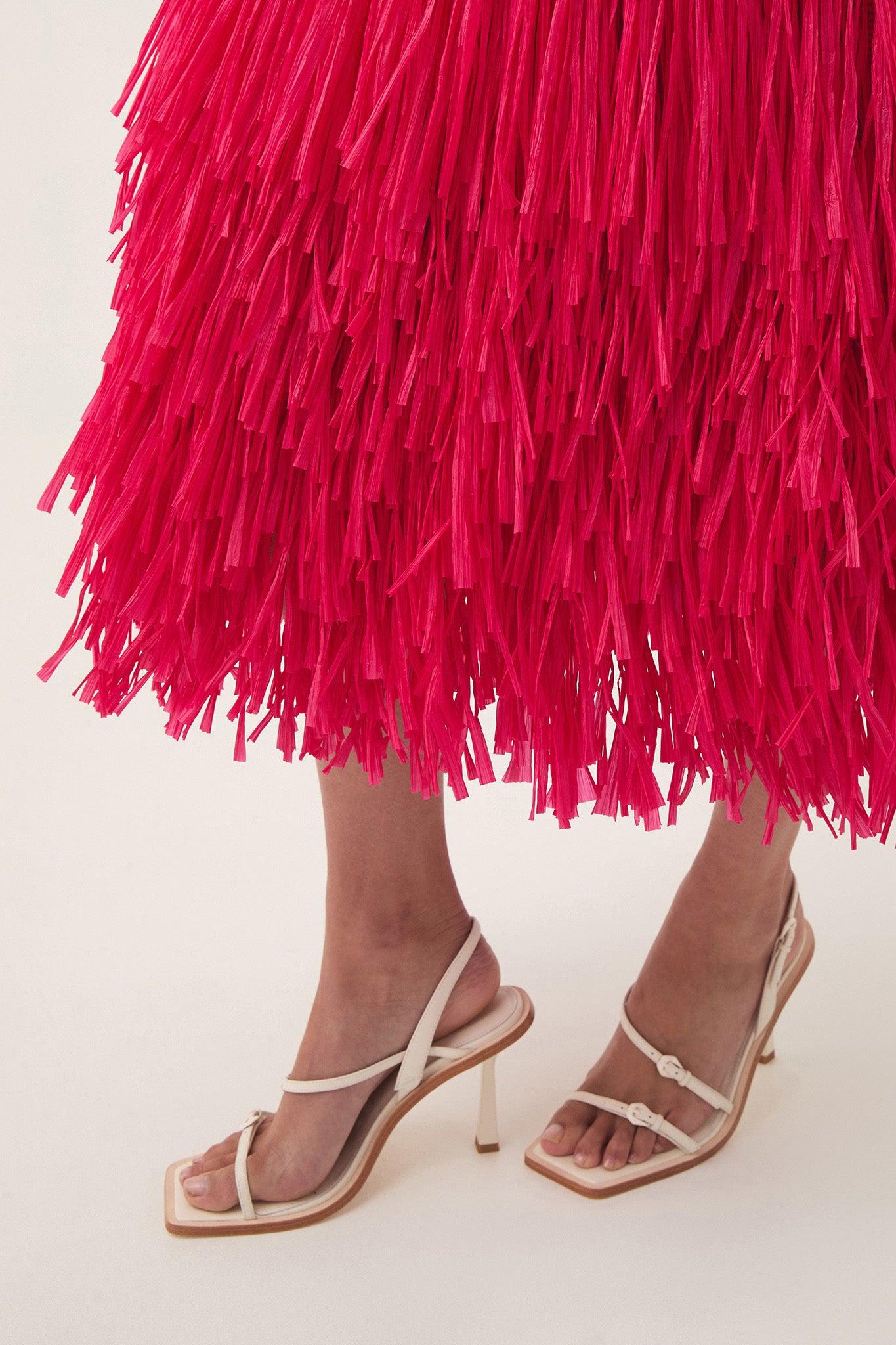PRODUCT DETAILS Knitted midi dress Encased shoulder padding Open back detail Bell-shaped skirt Sculptural zipper at centre back Raffia tiers at hem Shop All Dresses SIZE AND FIT Model wears a size AU 8/S Model: 178cm/5’10 Bust: 78cm Waist: 59cm Hips: 86cm FABRICATION 60% Viscose, 32% Nylon, 8% Elastane