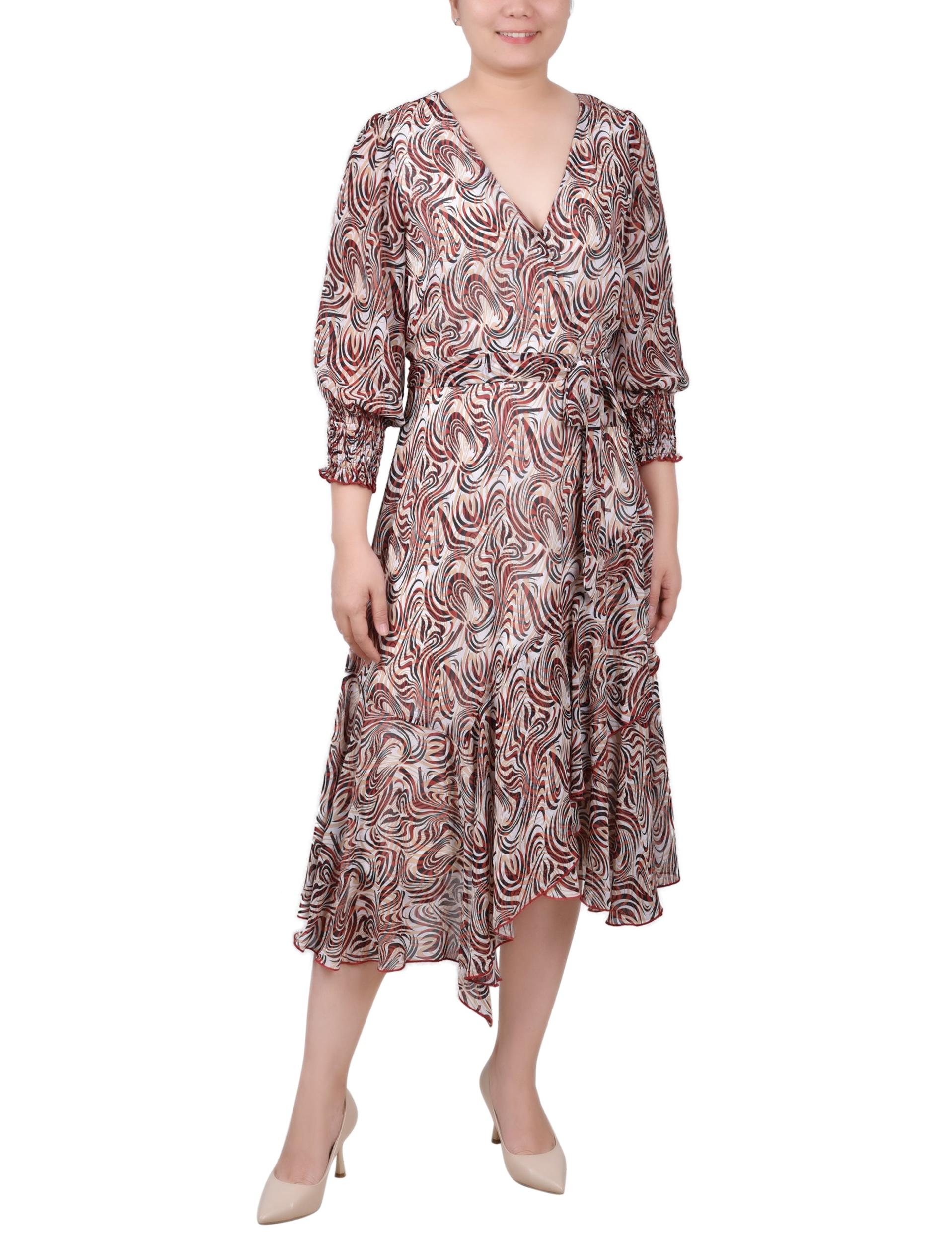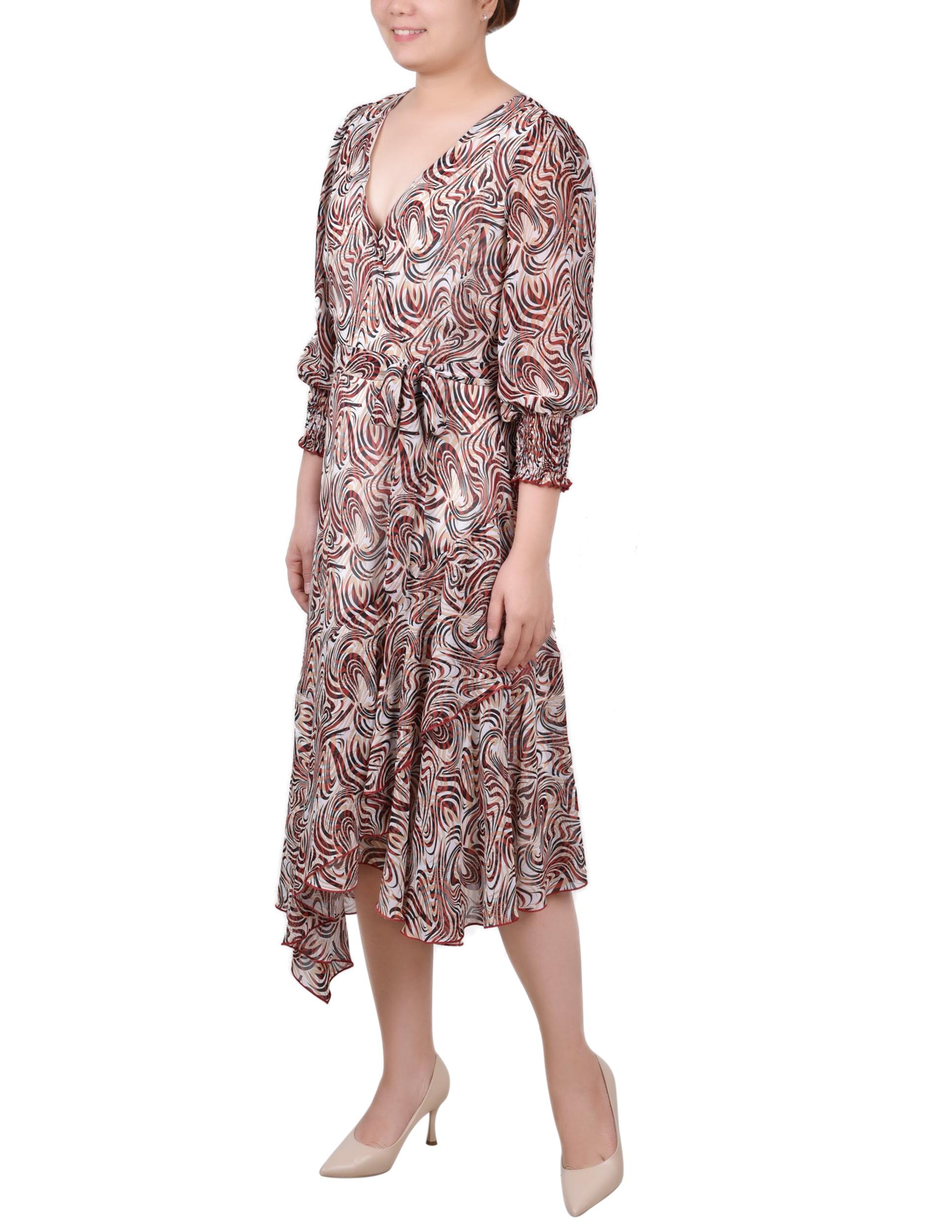 Rust Groovy Waves 3/4 Sleeve Belted Chiffon Hankerchief Hem Dress