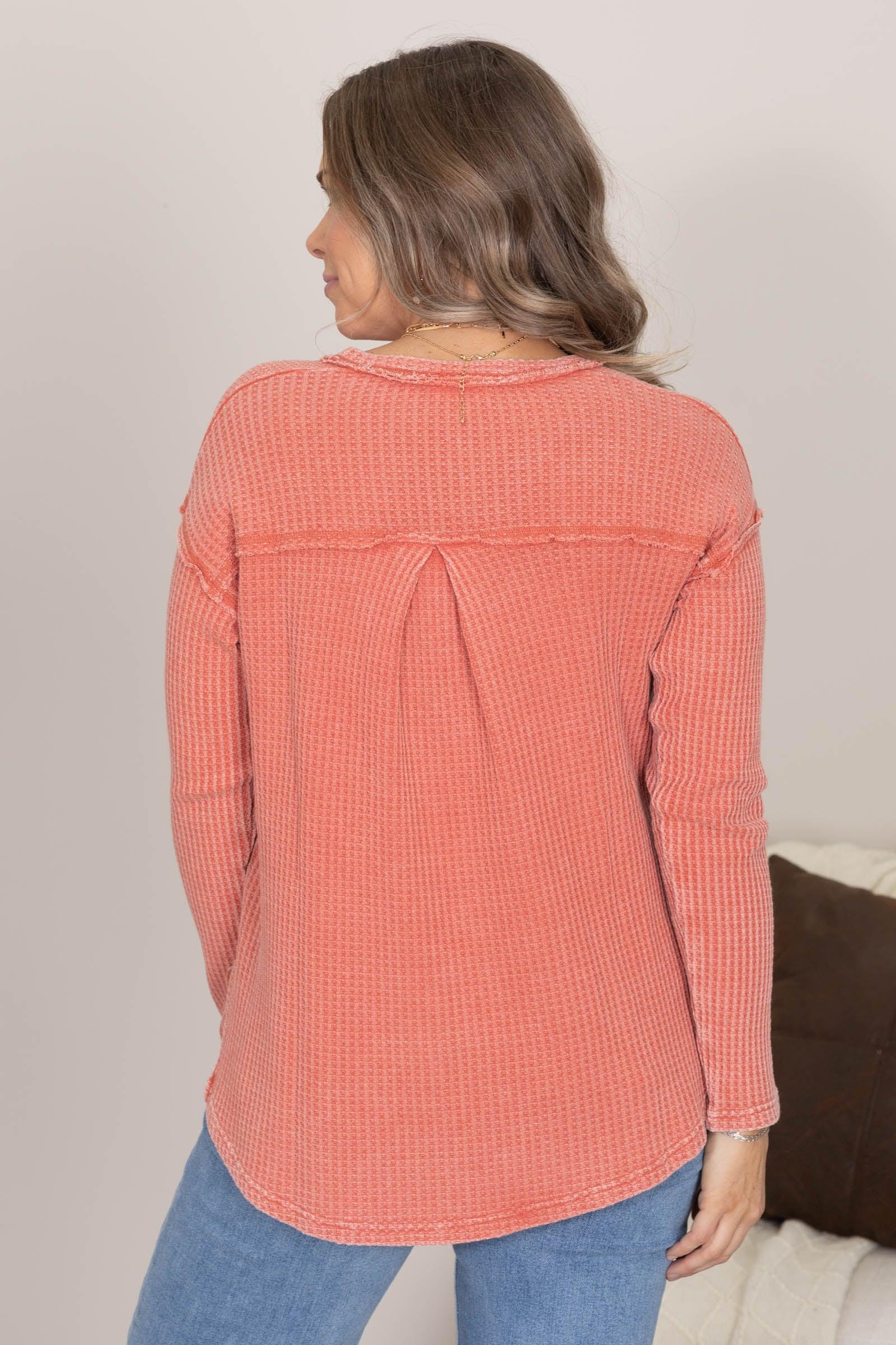 Product Details Colors: Rust Print: Textured Solid/Waffle Knit Neckline: V-Neck Sleeve: Long Sleeve Hemline: Straight Front, Round Back Brand: Mittoshop Material and Care 53% Cotton 42% Polyester 5% Spandex Hand Wash Cold Hang/Line Dry Size and Fit Small: Bust 42" Waist 40" Length 26" Medium: Bust 45" Waist 43" Length 27" Large: Bust 48" Waist 46" Length 28" Erica is wearing a size small