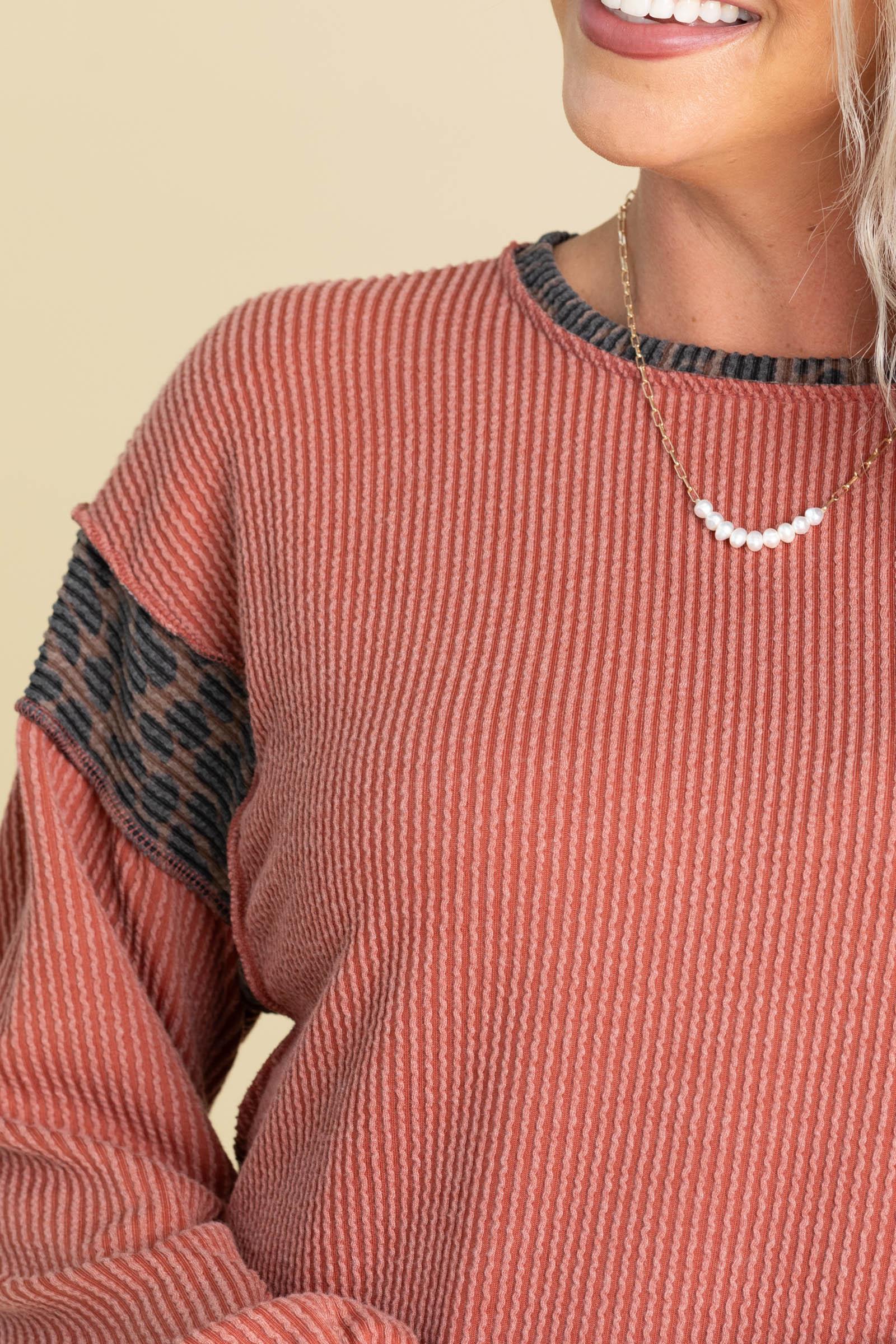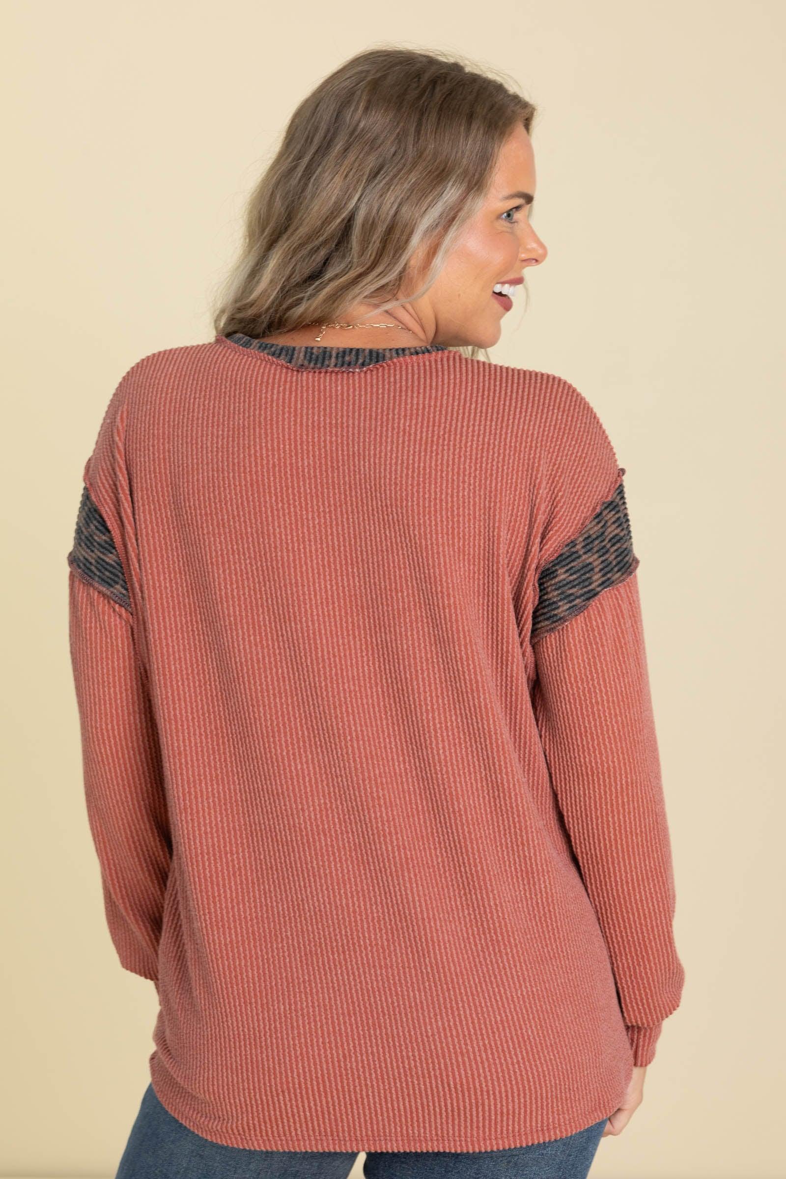 Product Details Colors: Rust, Brown, Charcoal Print: Ribbed/ Animal Print Neckline: Round Sleeve: Long Sleeve Hemline: Straight Brand: Heimish Material and Care 95% Polyester 5% Spandex Hand Wash Cold Hang/Line Dry Size and Fit Small: Bust 44" Waist 42" Length 25.5" Medium: Bust 46" Waist 44" Length 26" Large: Bust 48" Waist 46" Length 26.5" Erica is 5’7” and wearing her true size small
