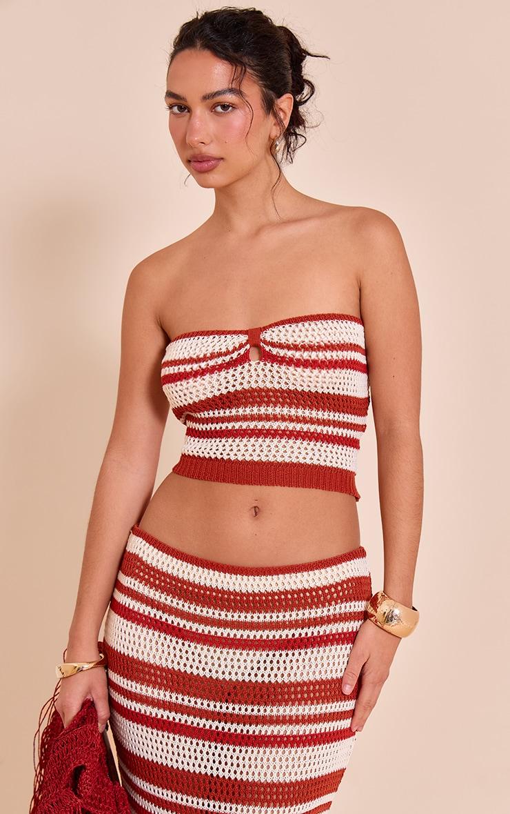Add texture to your look with the rust stripe crochet knitted maxi skirt. Featuring a rust material with a stripe crochet design in a flattering maxi length, this skirt is perfect for sunny days. Complete the two piece set with the matching bandeau top and slip-on sandals. Length may vary due to crochet knitLength approx 114.5cm/45inch (Based on sample size S)Model wears size SModel Height - 5ft 7inchp]:!mb-4inch>Category: KnitwearProduct type: SkirtColor: RustMaterial: KnitOccasion: Evening