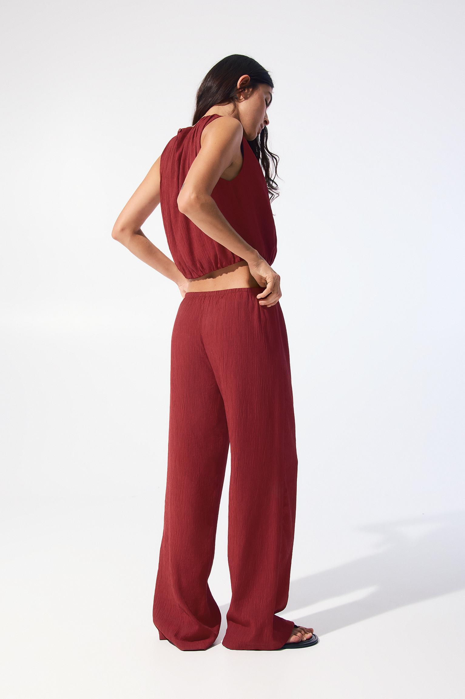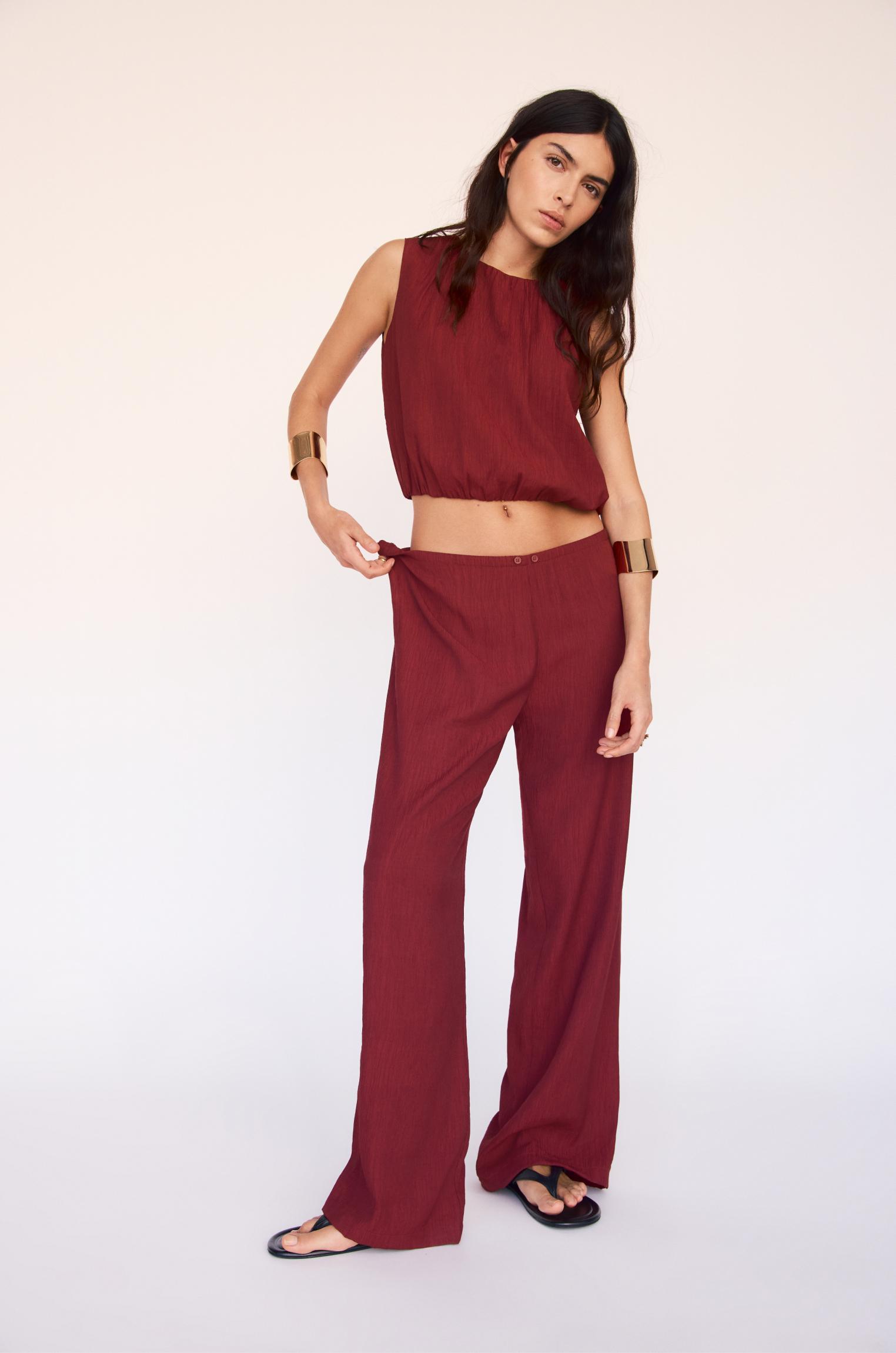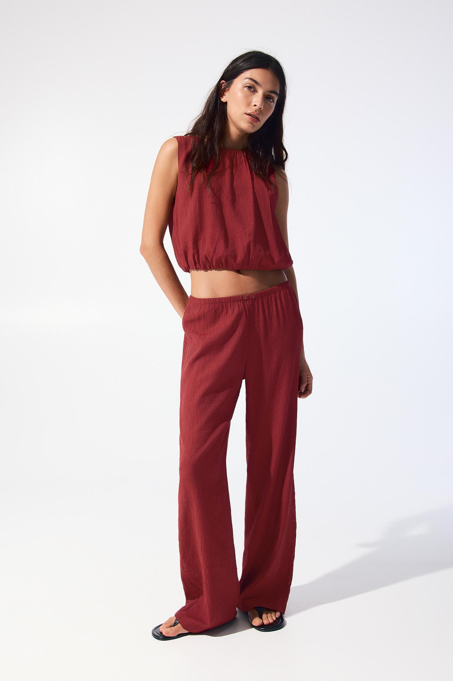 Sleeveless balloon-fit rustic top with a round neck. Total look.