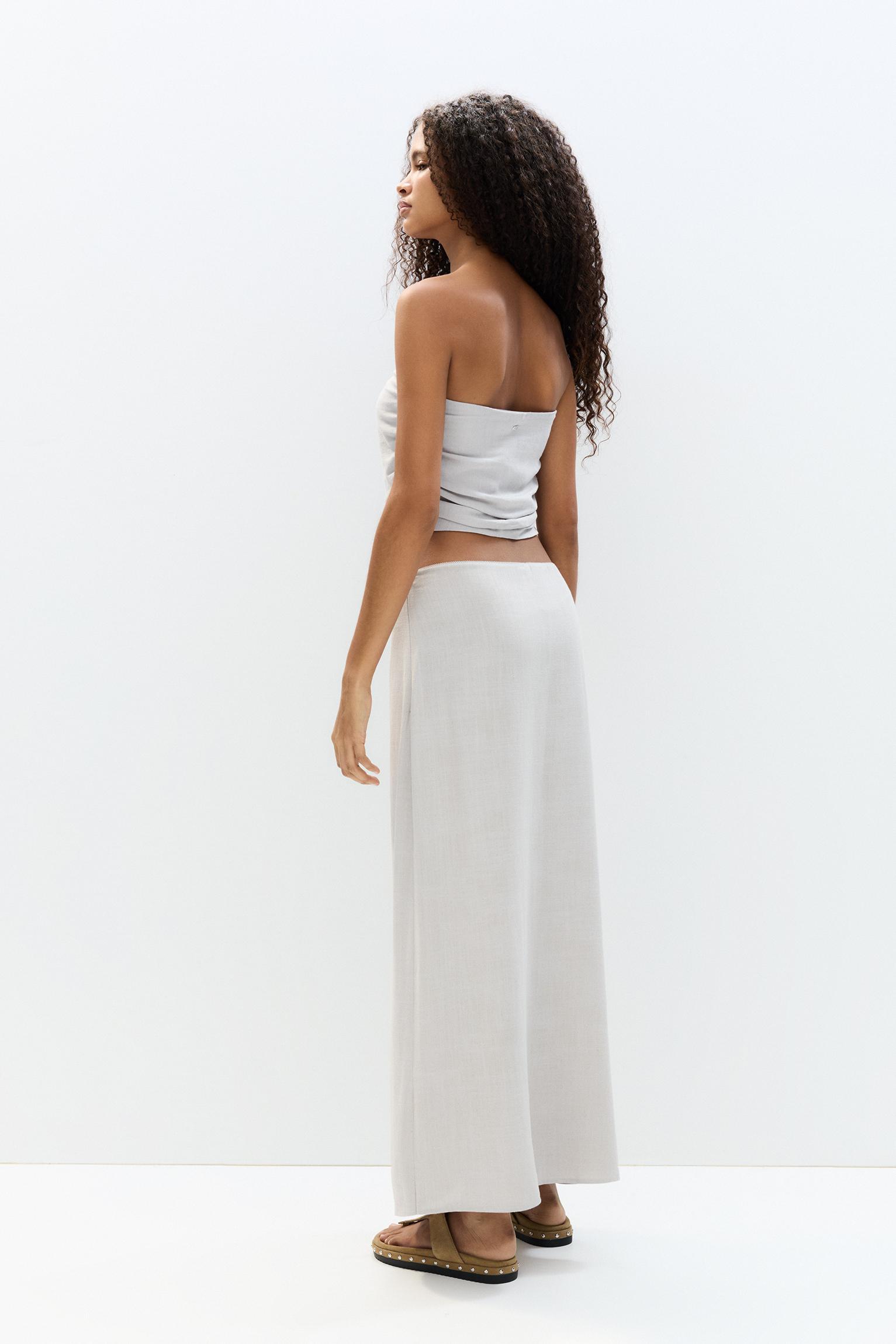 Rustic fabric bandeau top with gathered detail and side zipper fastening. Made of viscose (83%) and linen (19%). Total look