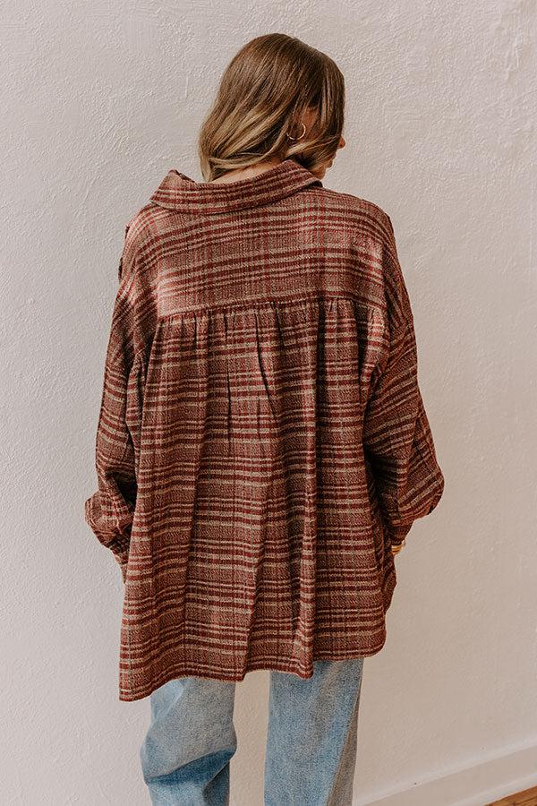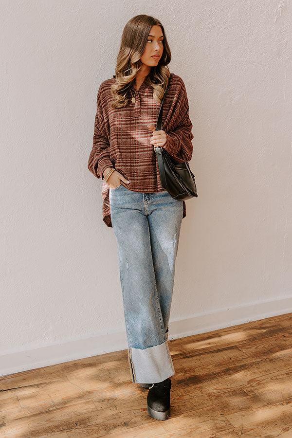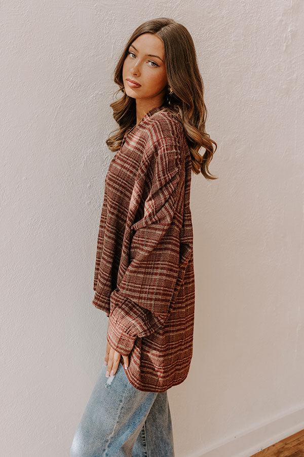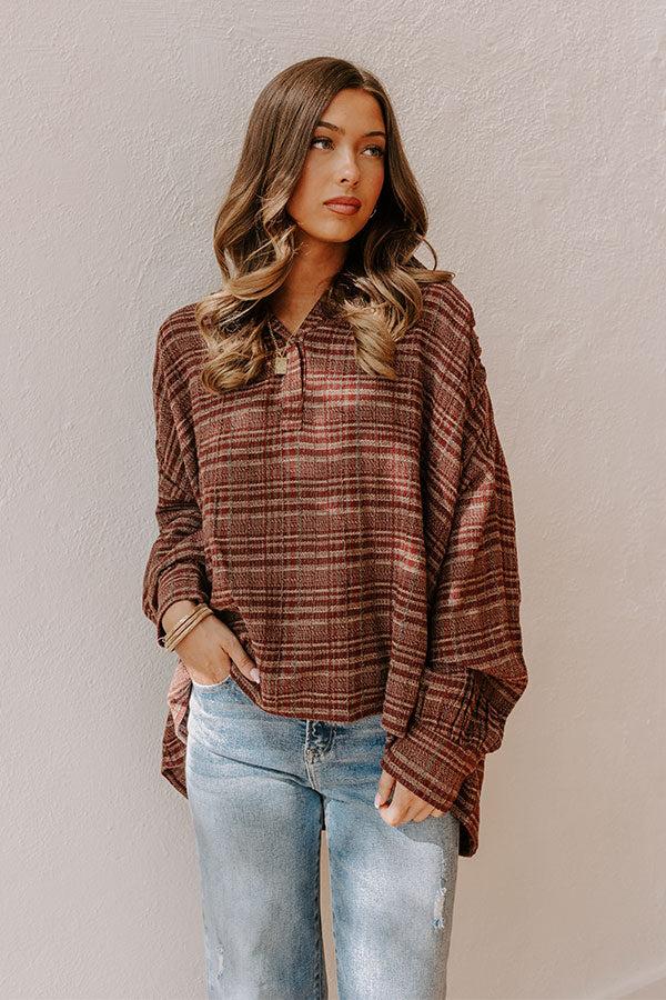 - Get ready to turn heads in a look that's all about seasonal style! This trendy oversized plaid top is the perfect mix of laid-back and polished, adding an effortlessly cool vibe to any outfit. - Unlined woven plaid material in merlot and taupe - A collared v-cut neckline with a hidden snap for additional coverage - Long sleeves with button closure cuffs - An oversized silhouette that ends in a high-low hemline