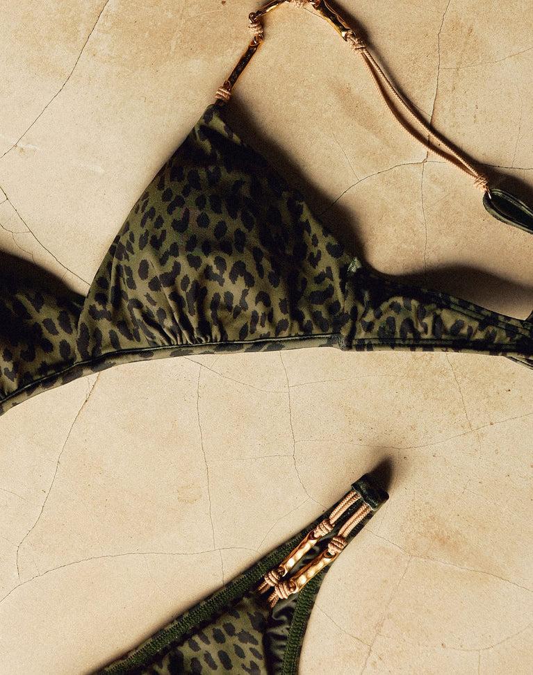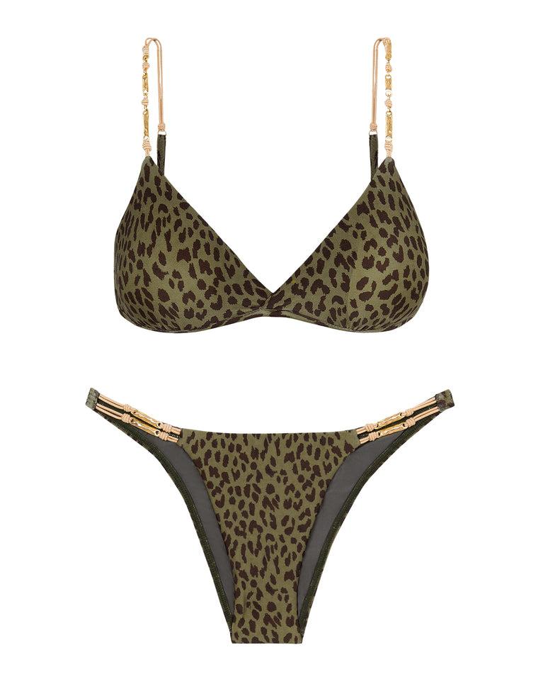 The ViX Ruth Kira Tri Top is a classic everyday triangle bikini top with a fixed bust, dual parallel shoulder straps adorned with 24k gold-plated asymmetrical bars and tie closures at back.Style the Ruth Kira Tri Top with a matching bottom and cover up for a beach-ready ensemble. Features: Fully lined Removable padding