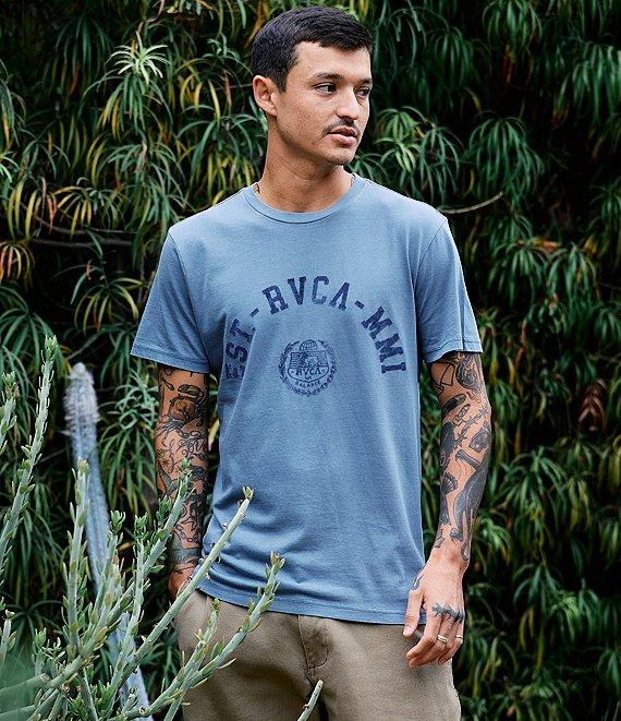From RVCA, this t-shirt features: Crew neckline Short sleeves "RVCA" logo, and verbiage on the front Screened inside neck Red stitching detail Pullover construction Slim fit Narrow cut Standard length Pigment-dyed jersey cotton Machine wash/tumble dry Imported.