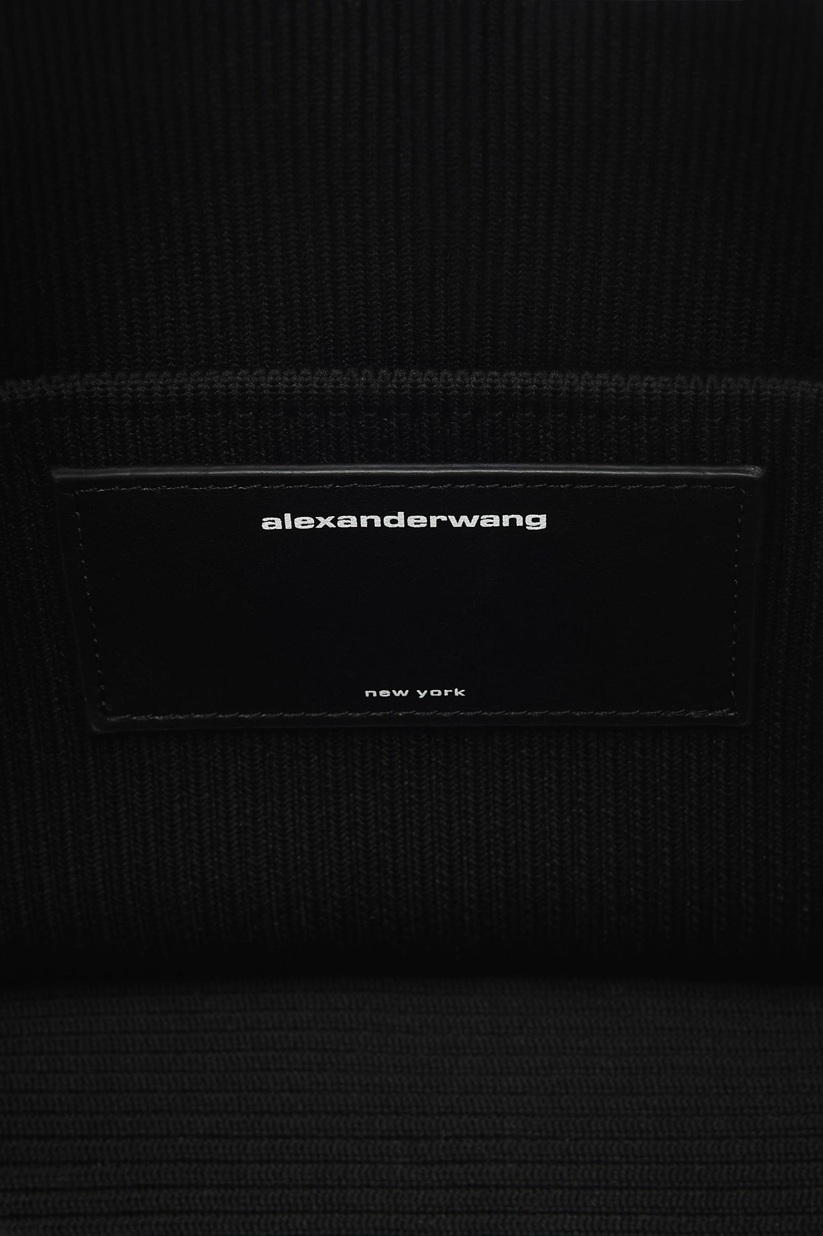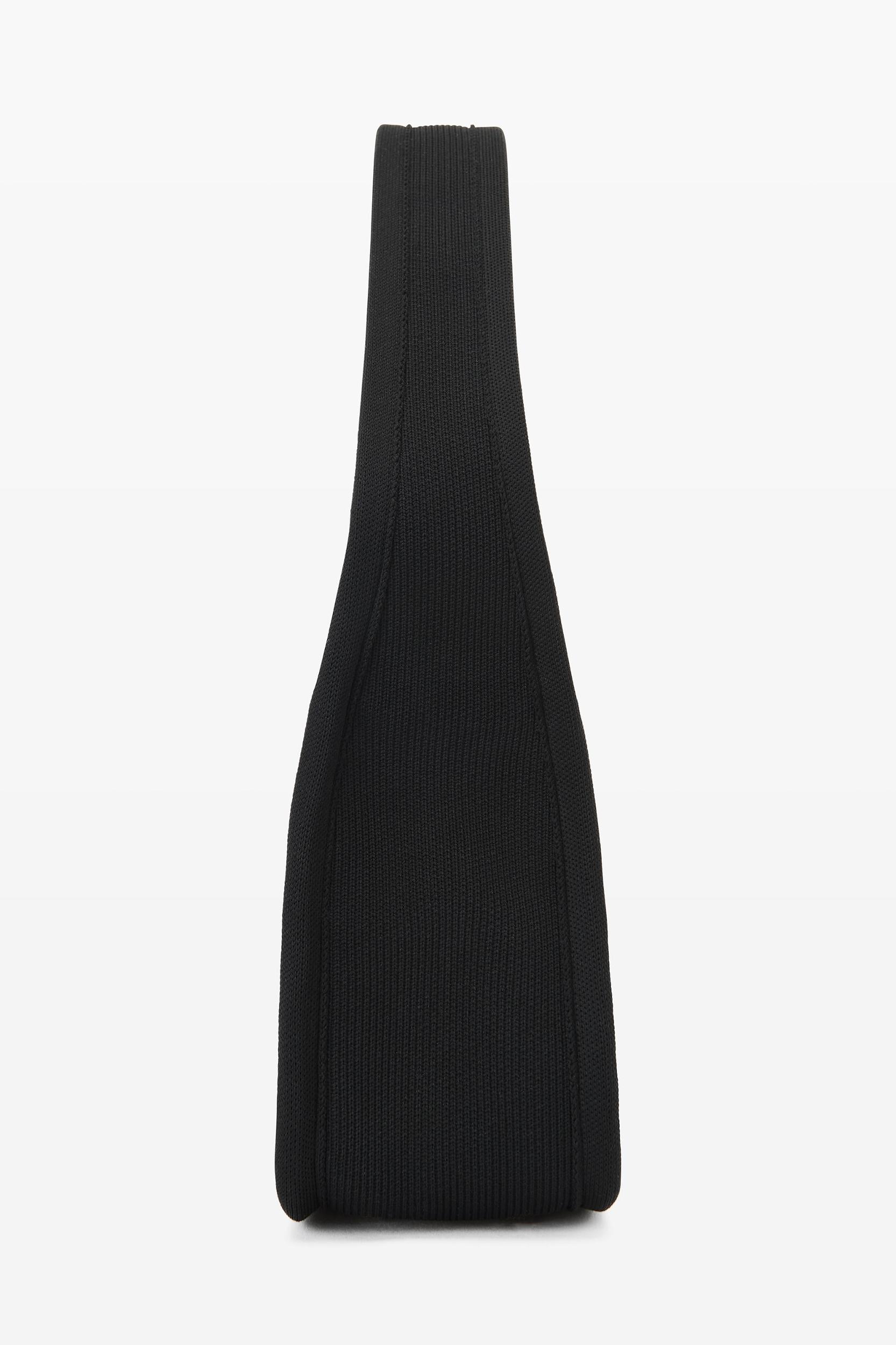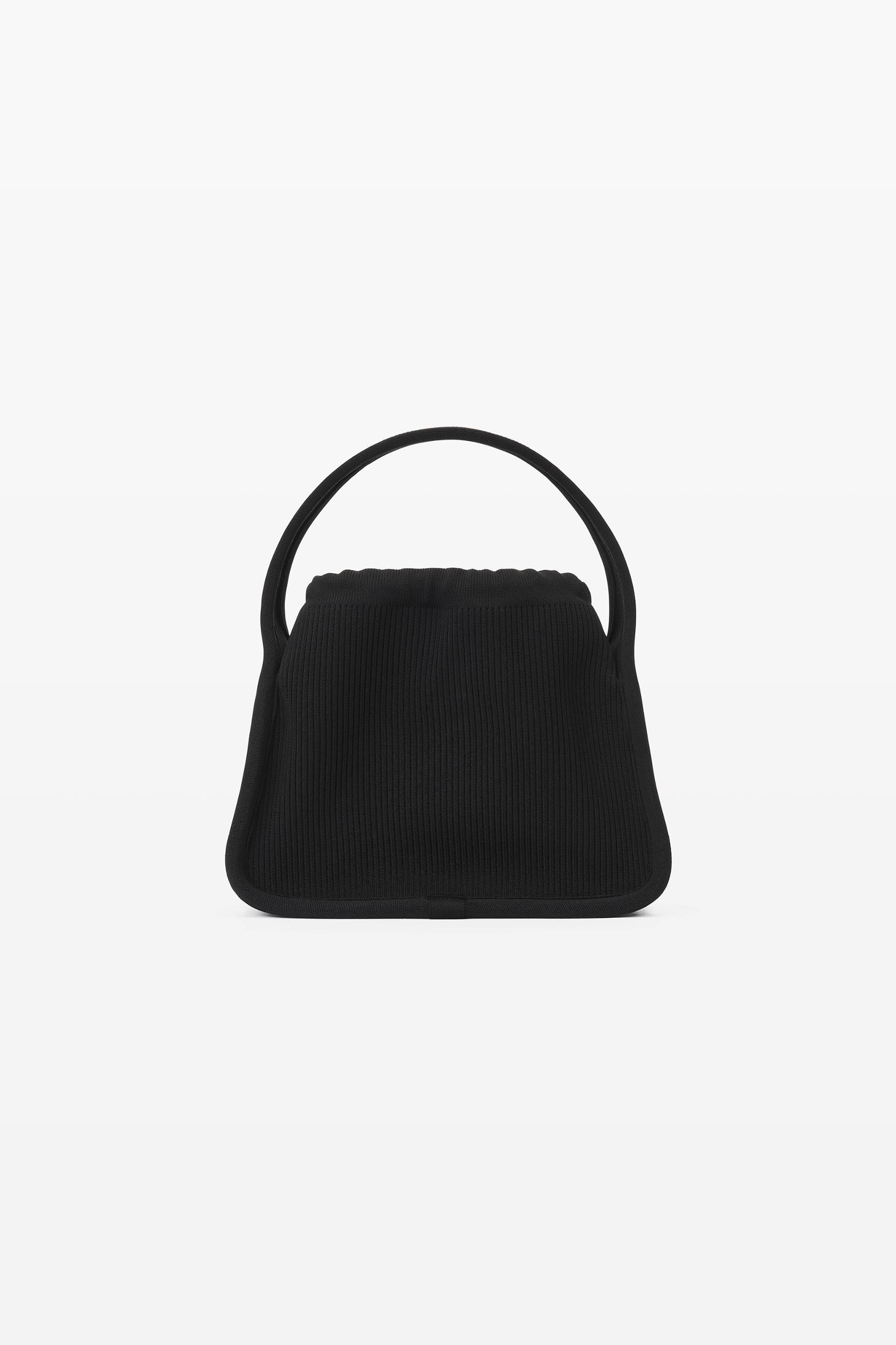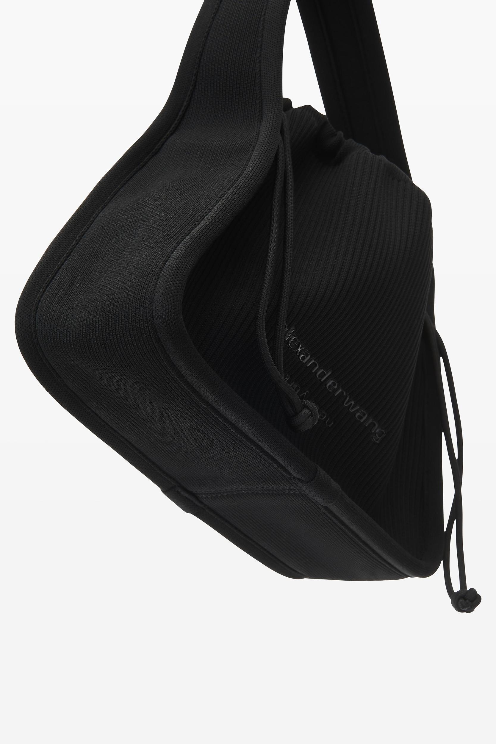 black small dust-bag purse with drawstring top closure and printed logo across front in ribbed nylon
