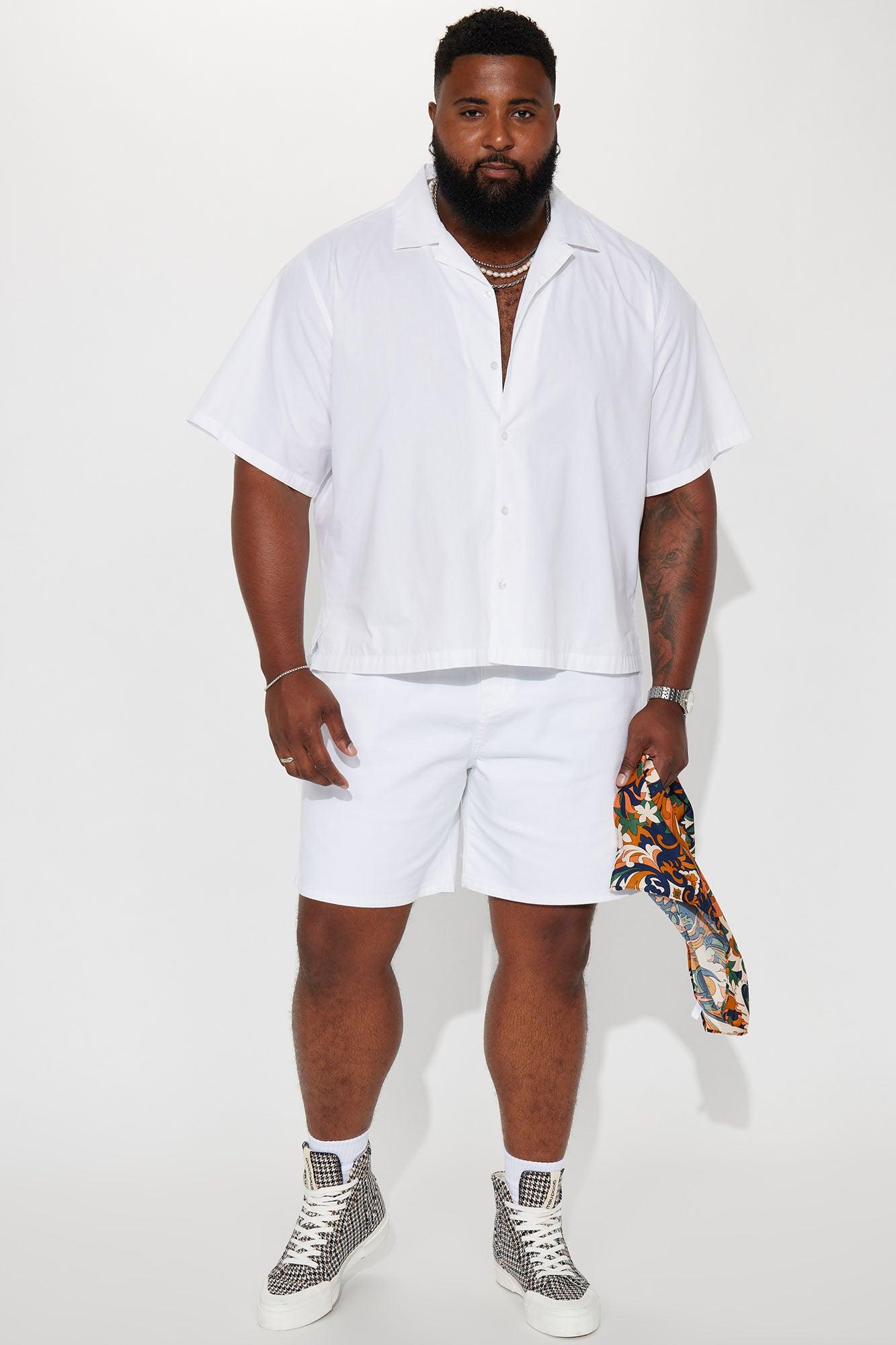 Available In White. Big & Tall: Height 6'5 - Wearing XXXL Fold Down Collar Front Button Closure Short Sleeve Bottom Side Slit 100% Cotton Imported California Proposition 65WARNING: Cancer and Reproductive Harm - www.P65Warnings.ca.gov.
