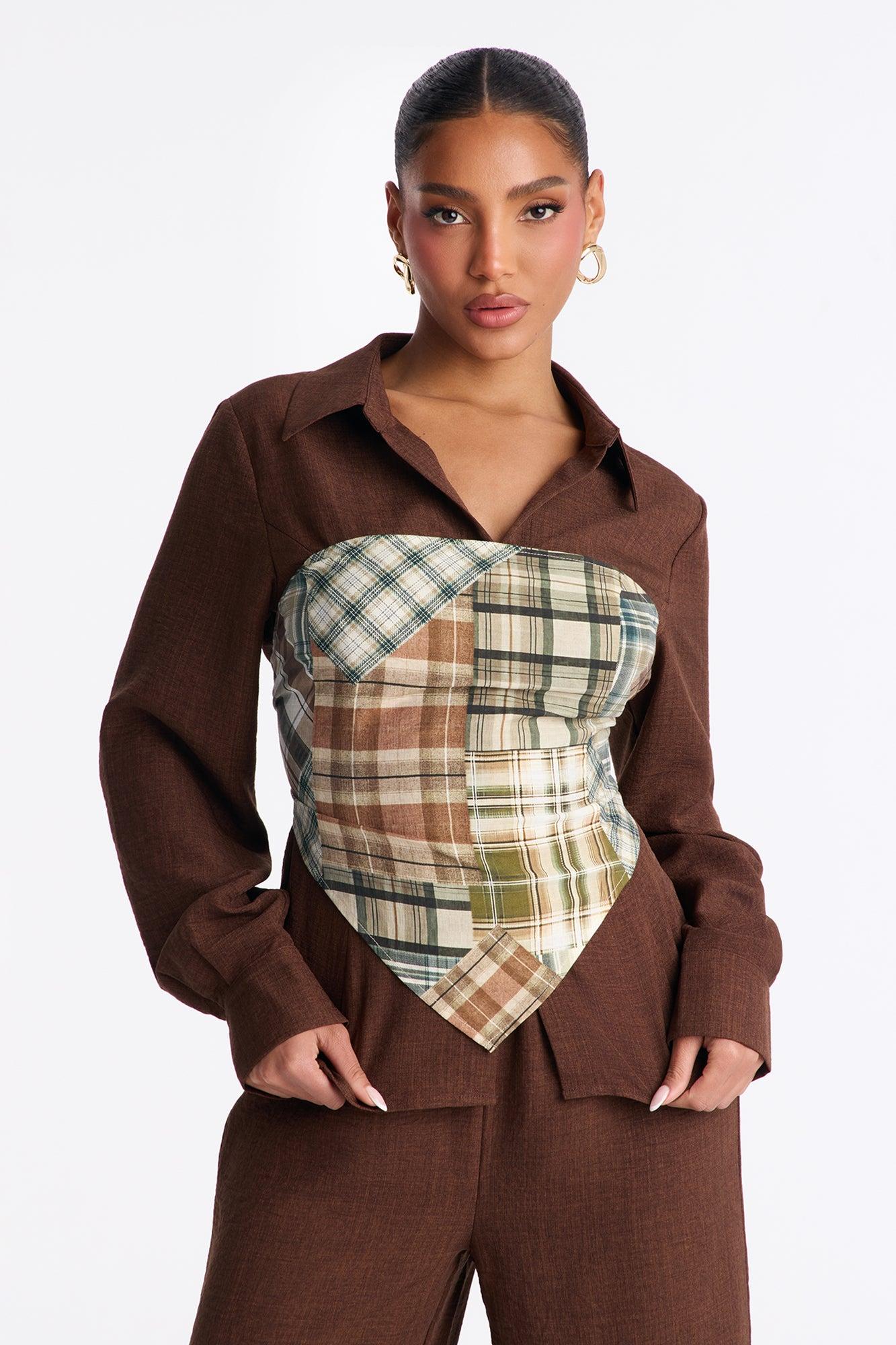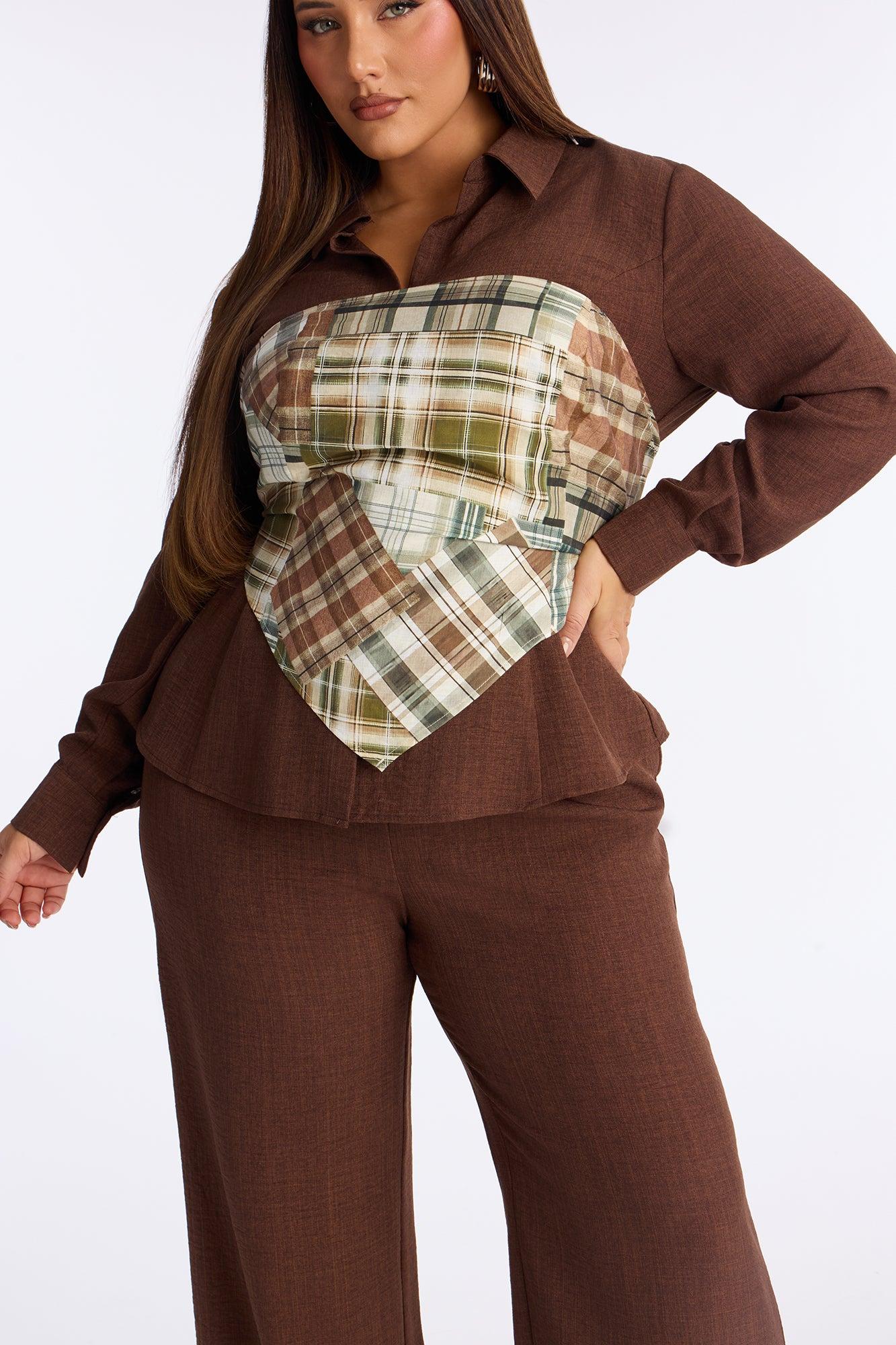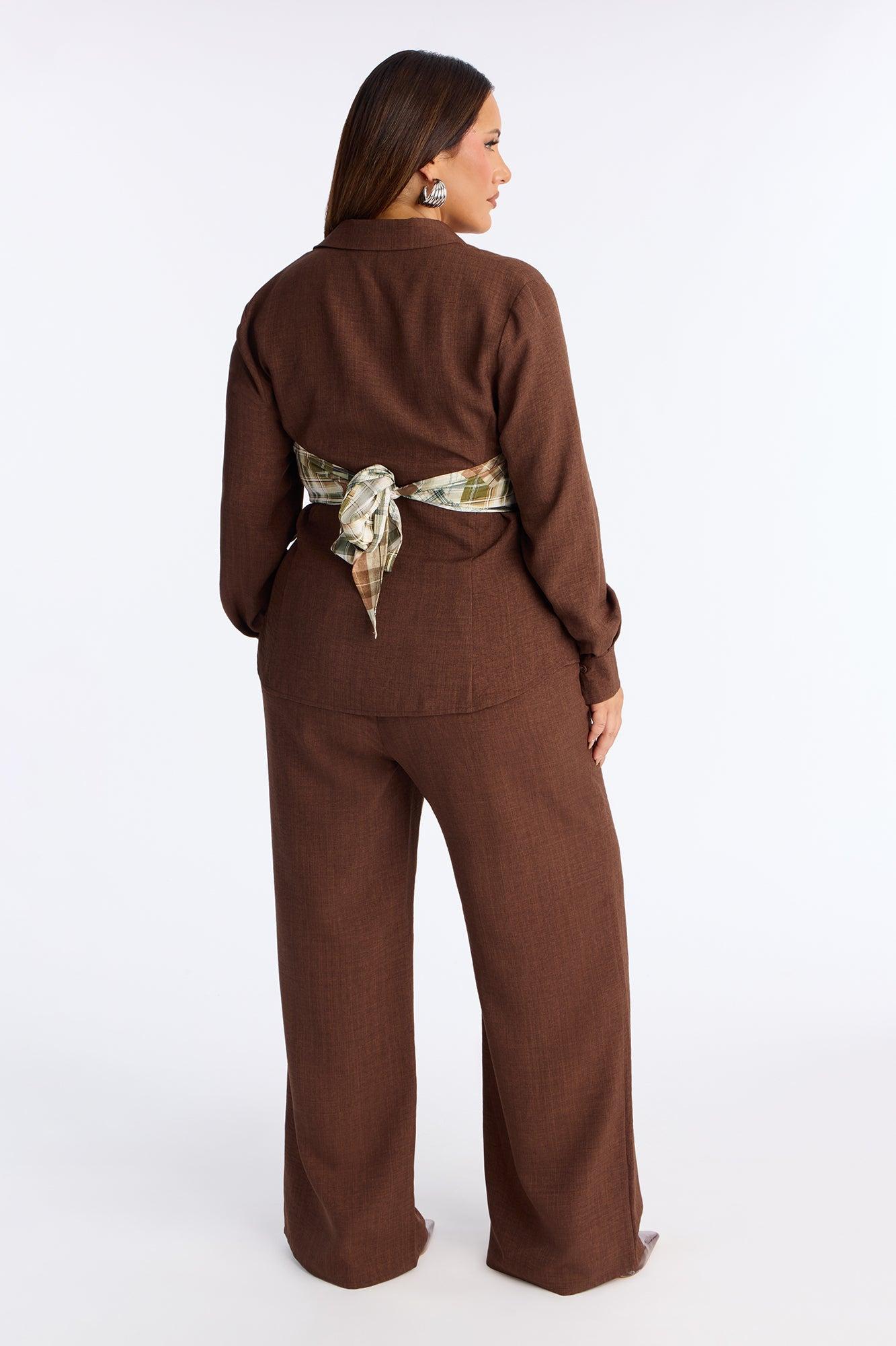 Available In Brown. 3 Piece Ensemble Button Up Shirt, Scarf, And Wide Leg Pant Set Stretch Inseam 33" Elastic Waistband Self : 100% Polyester Scarf : 97% Lyocell 3% Lien Imported
