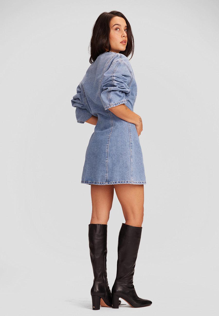 Strong proportions make Ryleigh an effortless statement with a sharp v neckline and button front detail. A long arched sleeve with dart details at the elbow compliments the short length of the dress.
