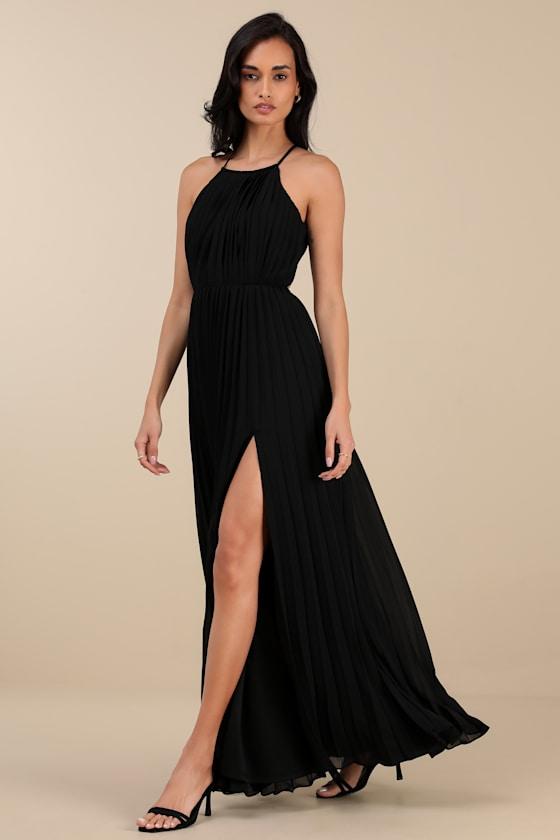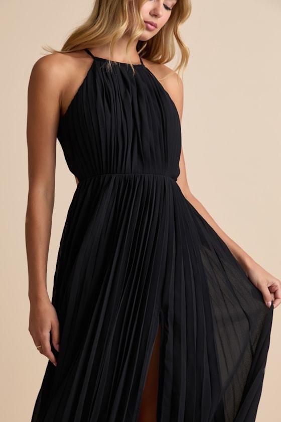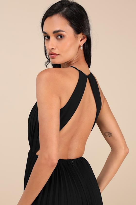 "Breathtaking" doesn't even begin to describe the exquisiteness that is the Lulus Rylie Black Pleated Backless Maxi Dress! This airy chiffon dress boasts a pleated design throughout the maxi silhouette, featuring a sleeveless bodice with an apron-style neckline and a button-loop closure that secures above the open back. The fitted waist tops a flowy A-line skirt with a flirty side slit. Elastic and hidden zipper/clasp at the back.