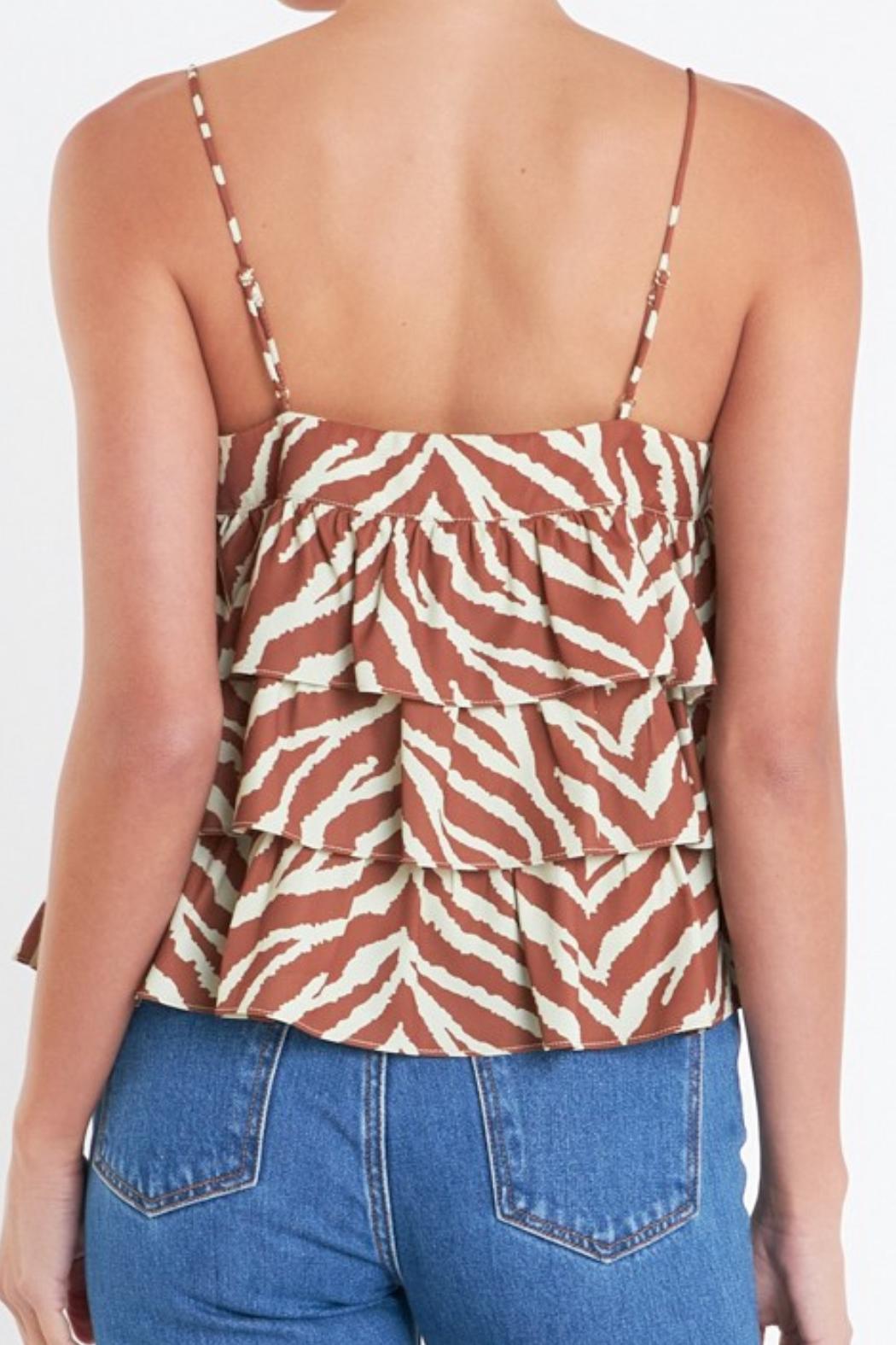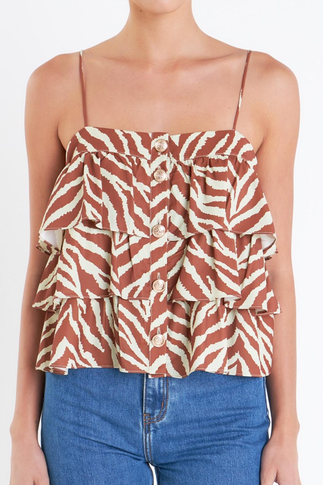 - Print - Sleeveless - Buttons at center front - Adjustable spaghetti strap - Tiered - Lined