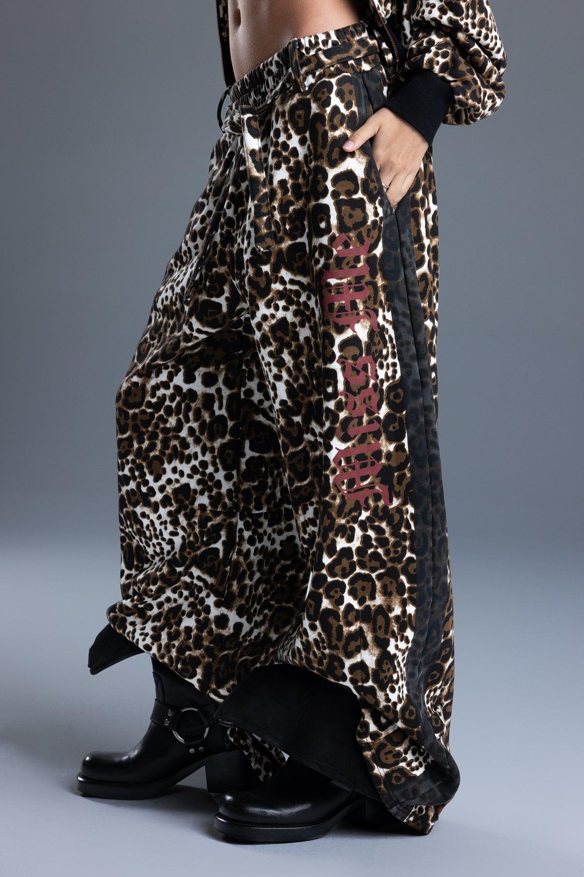 Relaxed fit, wide leopard sweatpants- Miss Me script detail- Elasticized waistband with wide exterior tie belt- Button-adjustable pant legs- Side contrast panel detailing- 3-pocket designModel is wearing size: SModel Measurements:Height: 5’9”Bust: 32AWaist: 24”Hips: 34”Fabric Content: Self: 100% CottonCare: Gentle machine wash inside-out with like colors in cold water. Tumble dry low.Style No. BMP0065L-MULTI BRN