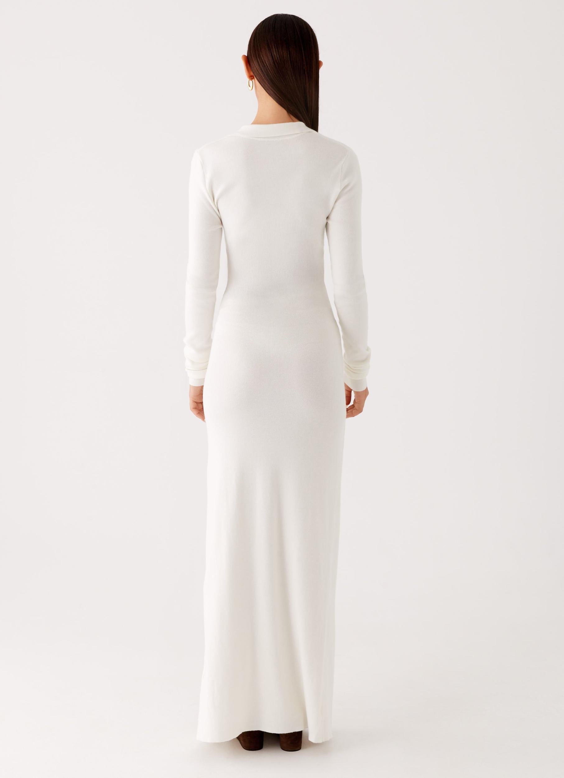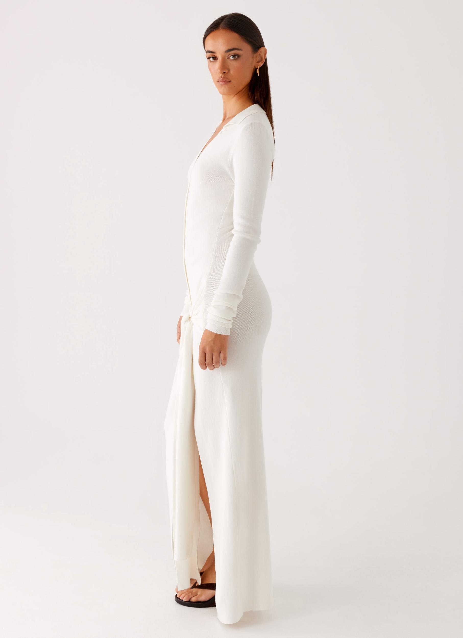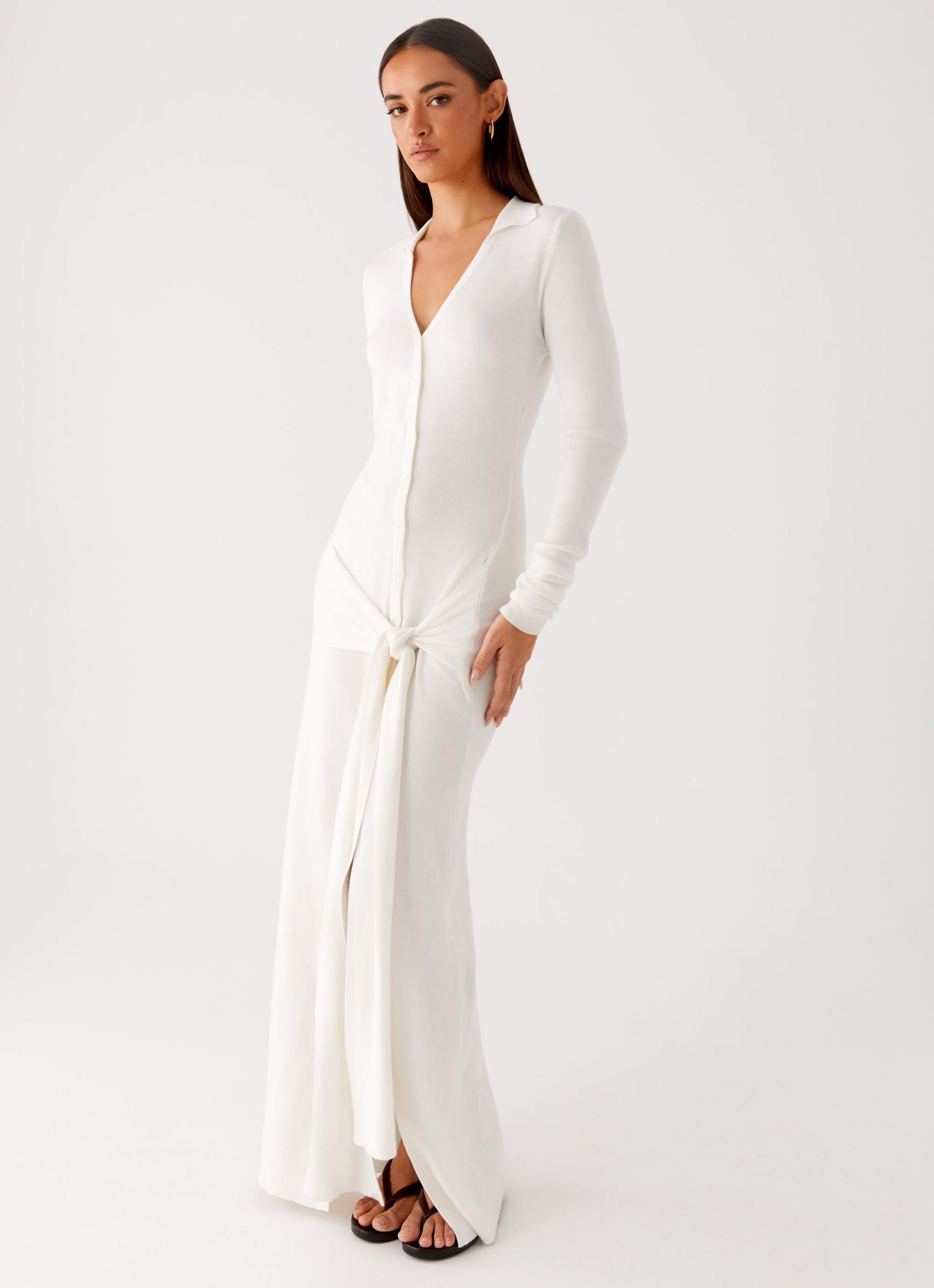 Peppermayo ExclusiveThe Sabetha Knit Maxi Dress is understated elegance with a modern twist. Featuring a unique side-collared neckline and a front side tie that cinches the waist just right, it's effortlessly chic and endlessly flattering.- Maxi Length - Single Collared Neckline - Front Buttons - Front Side Tie - Stretch Knit - Unlined - Front Split - 93% Rayon, 7% Spandex - Lining: 93% Rayon, 7% SpandexSize AU 8 / US 4 garment measurements:Bust: 78cm/30.7inWaist: 62cm/24.4inHip: 80cm/31.5inHem: 88cm/34.6inLength: 147cm/57.9inSleeve Length: 69cm/27.2inRoberta is 177cm and wearing a size AU 6 / and US 2