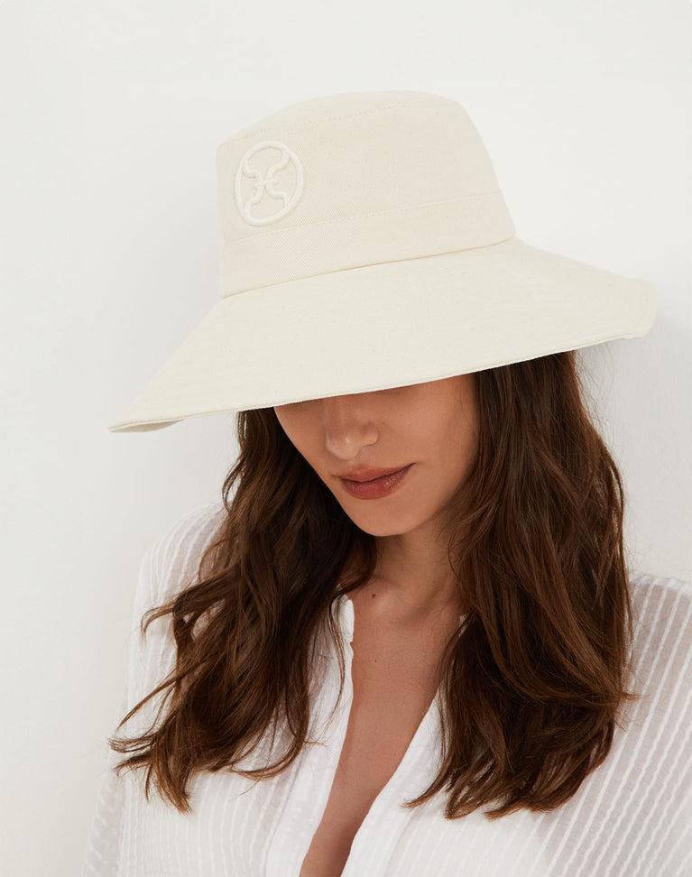 The ViX Sabine Hat is a canvas bucket hat featuring a tonal ViX logo embroidered at the front. With a wide brim for enhanced sun protection, it combines functionality and style effortlessly. Style the Sabine Hat with your favorite swim and cover up for a vacation-ready look. Features: Flexible wide brim Tonal matching