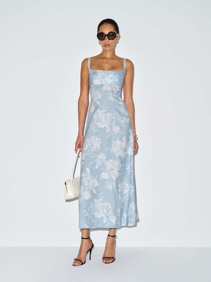 Easy breezy. Shop the Sabine Linen Dress from Reformation, a maxi dress with a straight neckline, adjustable straps, and a smocked back.