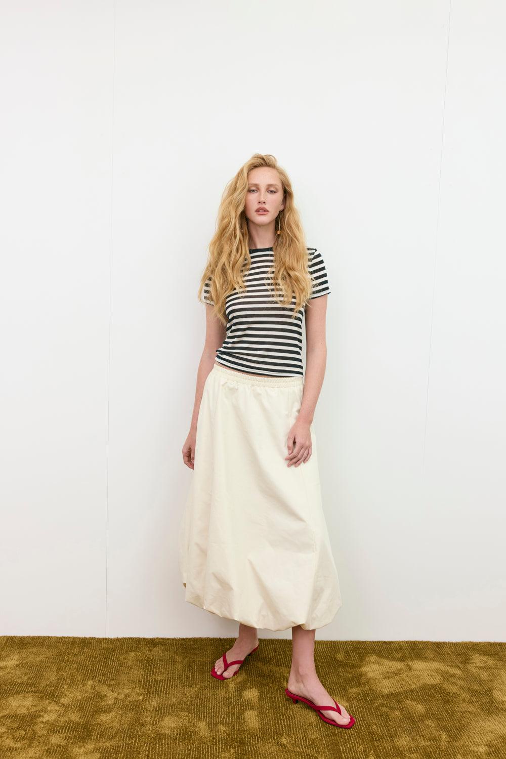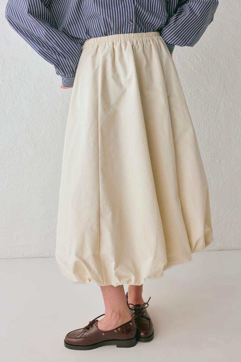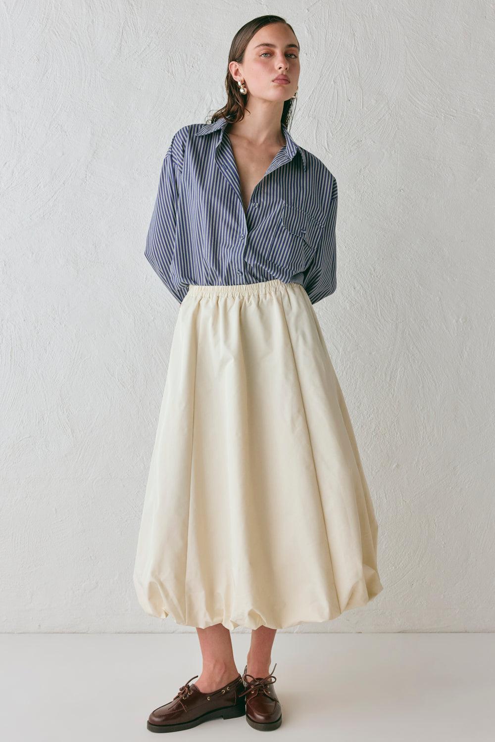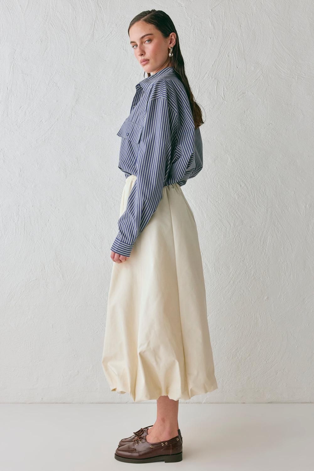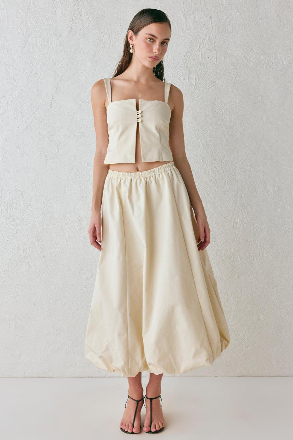 The Sabrin Bubble Midi Skirt in Cream features an elastic waist and a bubble hem. Designed in Australia.