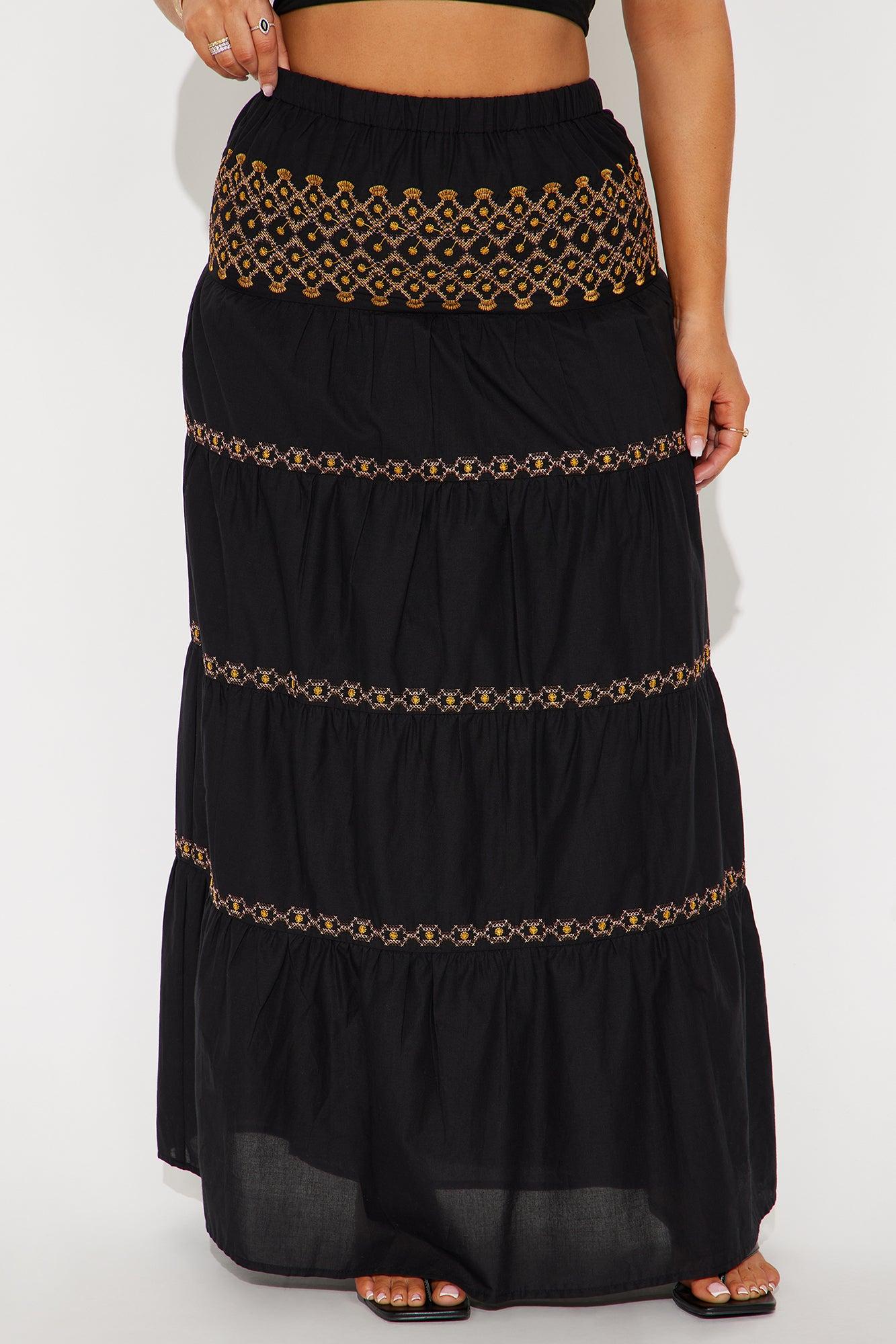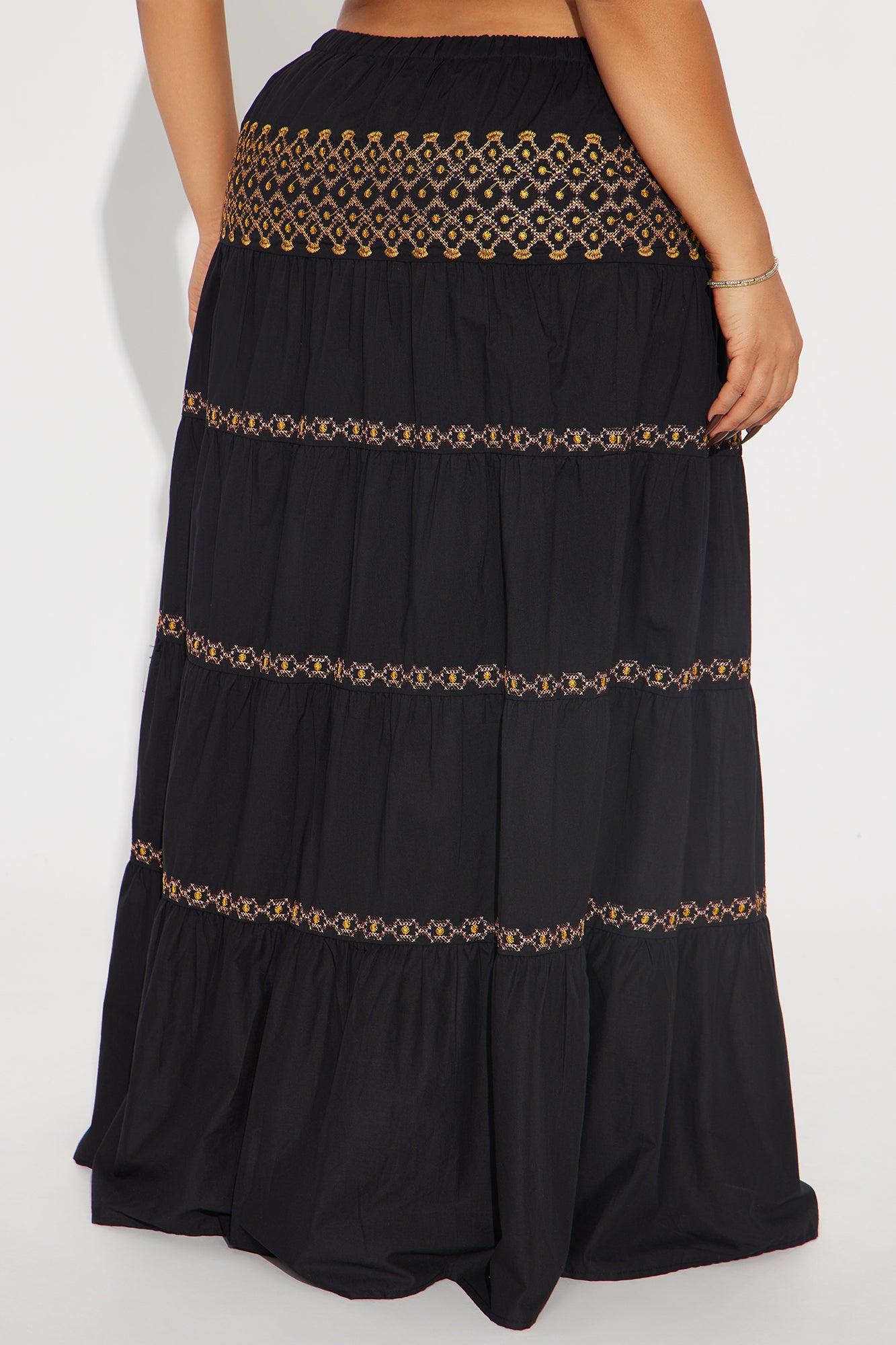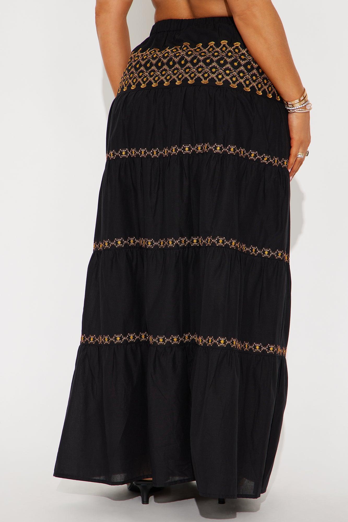 Available In White/combo And Black/combo. Tiered Maxi Skirt High Rise Elastic Waistband Embroidery Detail Full Lining Non Stretch Self : 100% Cotton Lining : 100% Cotton Imported California Proposition 65 WARNING: Cancer and Reproductive Harm - www.P65Warnings.ca.gov.