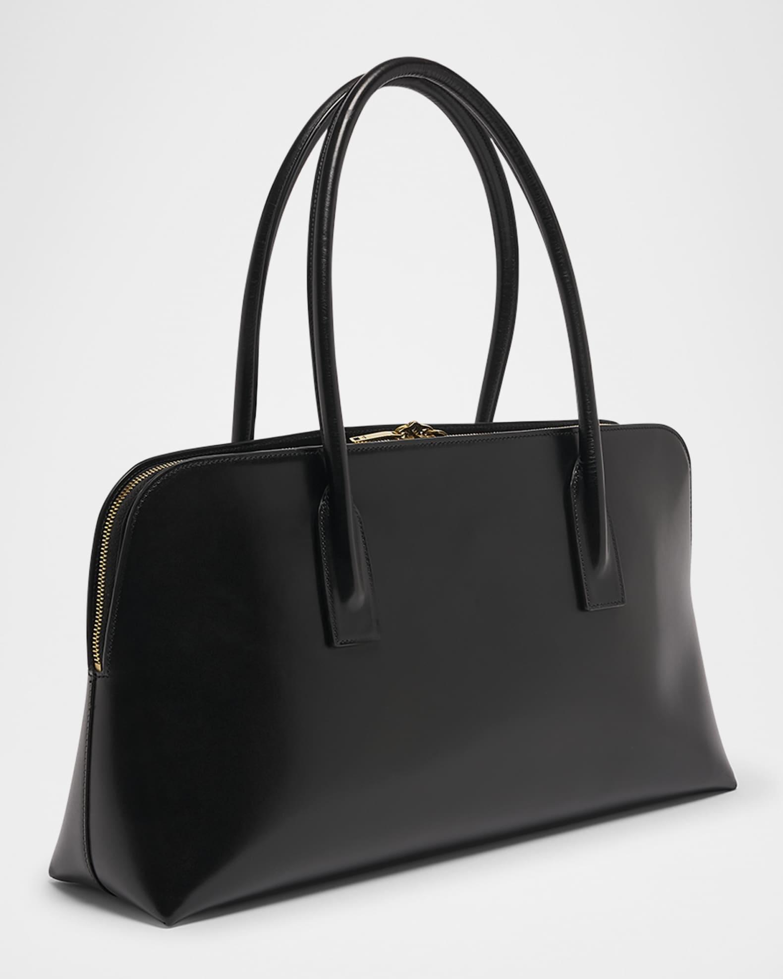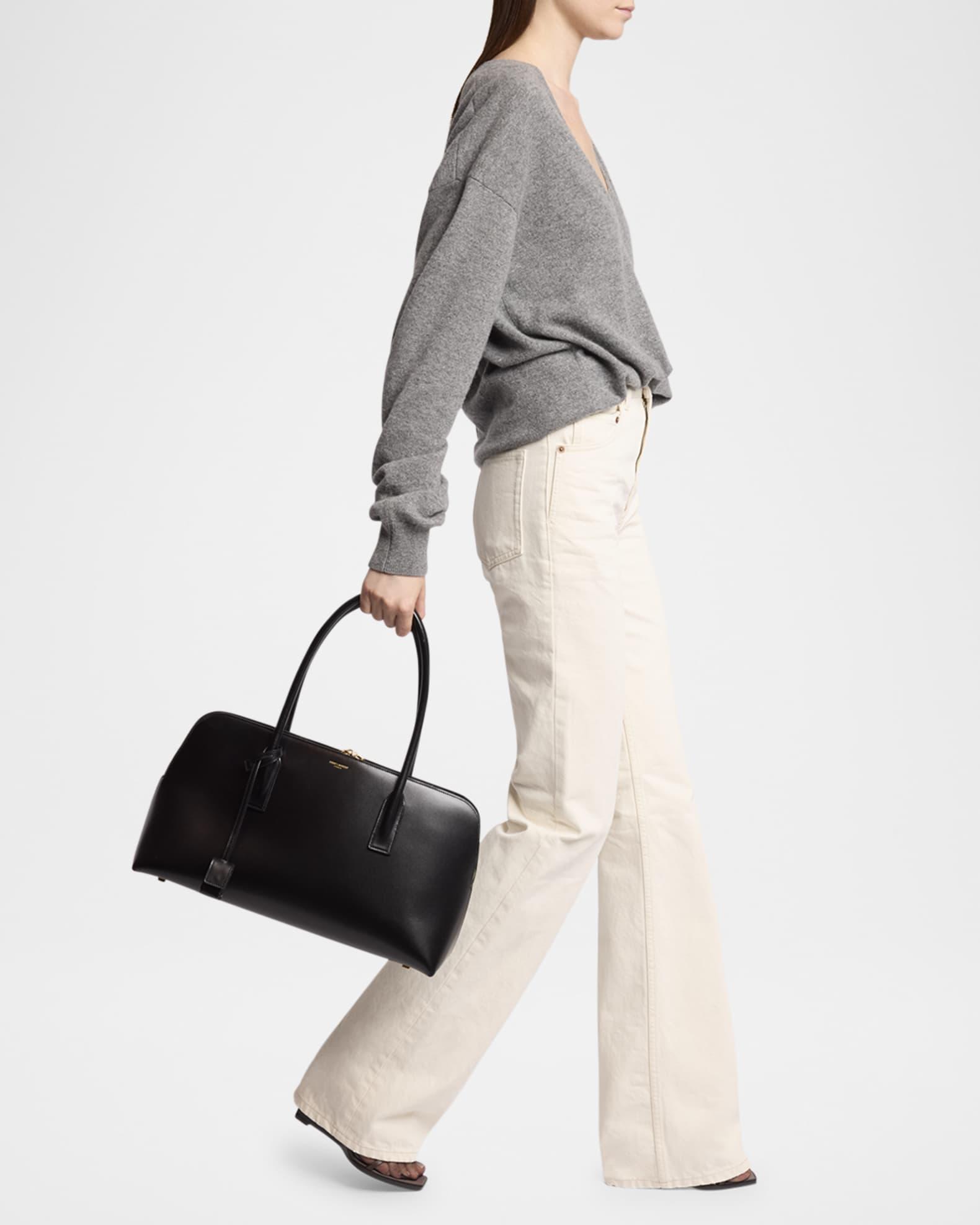 Saint Laurent's "Sac de Jour" bowling top handle bag is crafted of smooth leather and showcases classic sophistication Rolled top handles with keyring and padlock tag Open top Center zip compartment divides interior; one slip pocket with snap closure Feet protect bottom of bag Light bronze hardware Approx. 8.6"H x 16.1"W x 1.1"D Made in Italy Proposition 65 warning for California residents