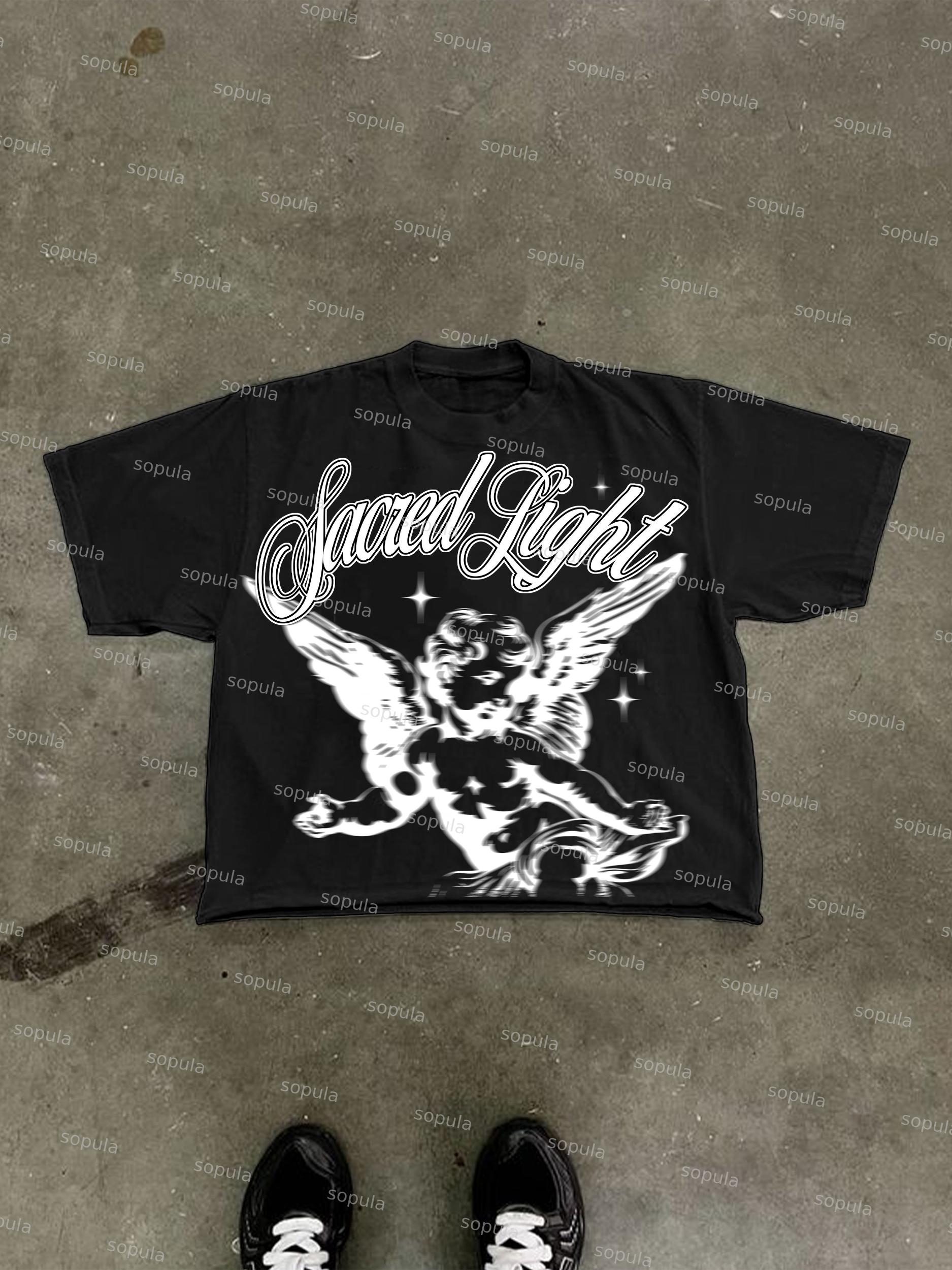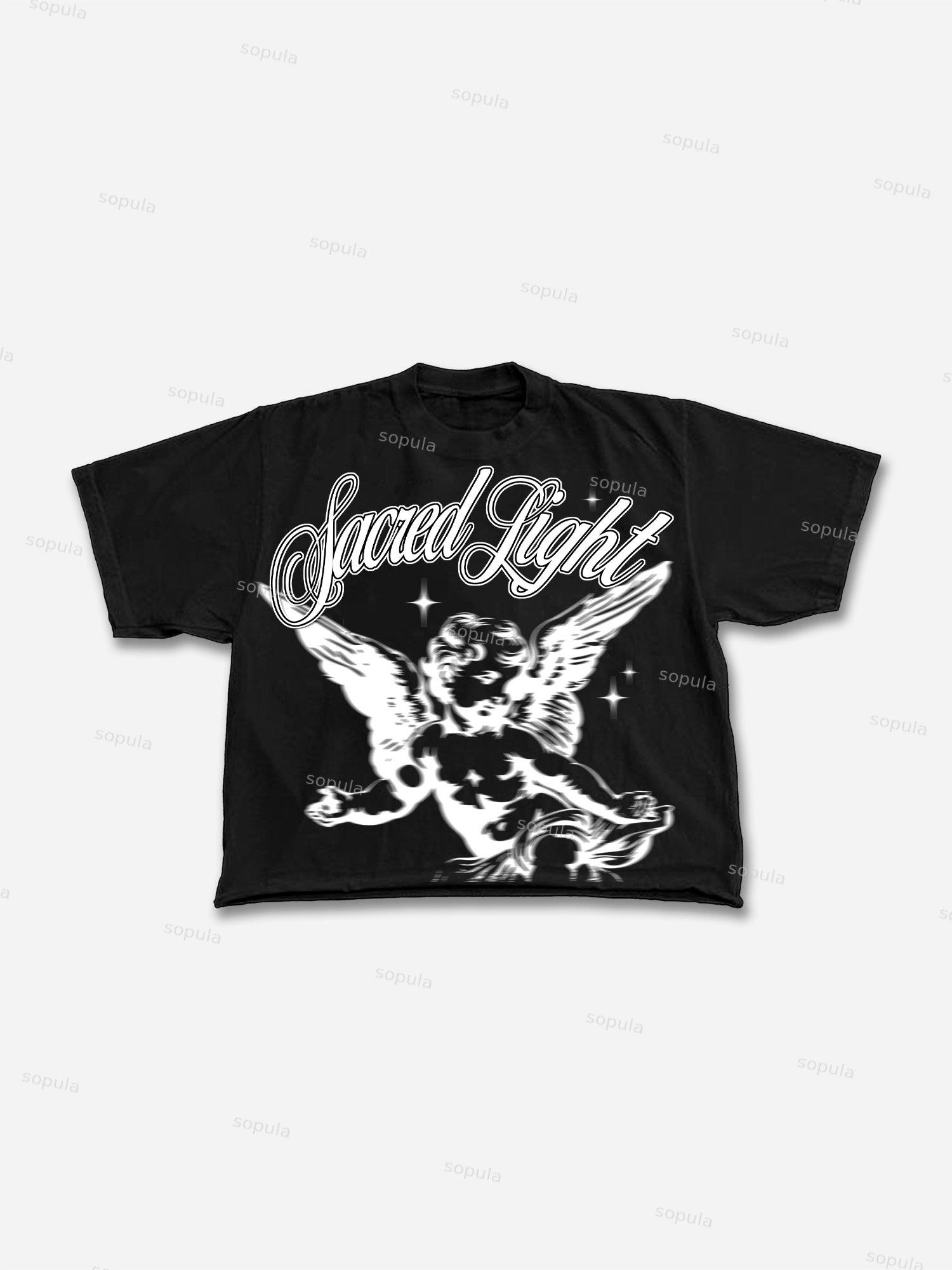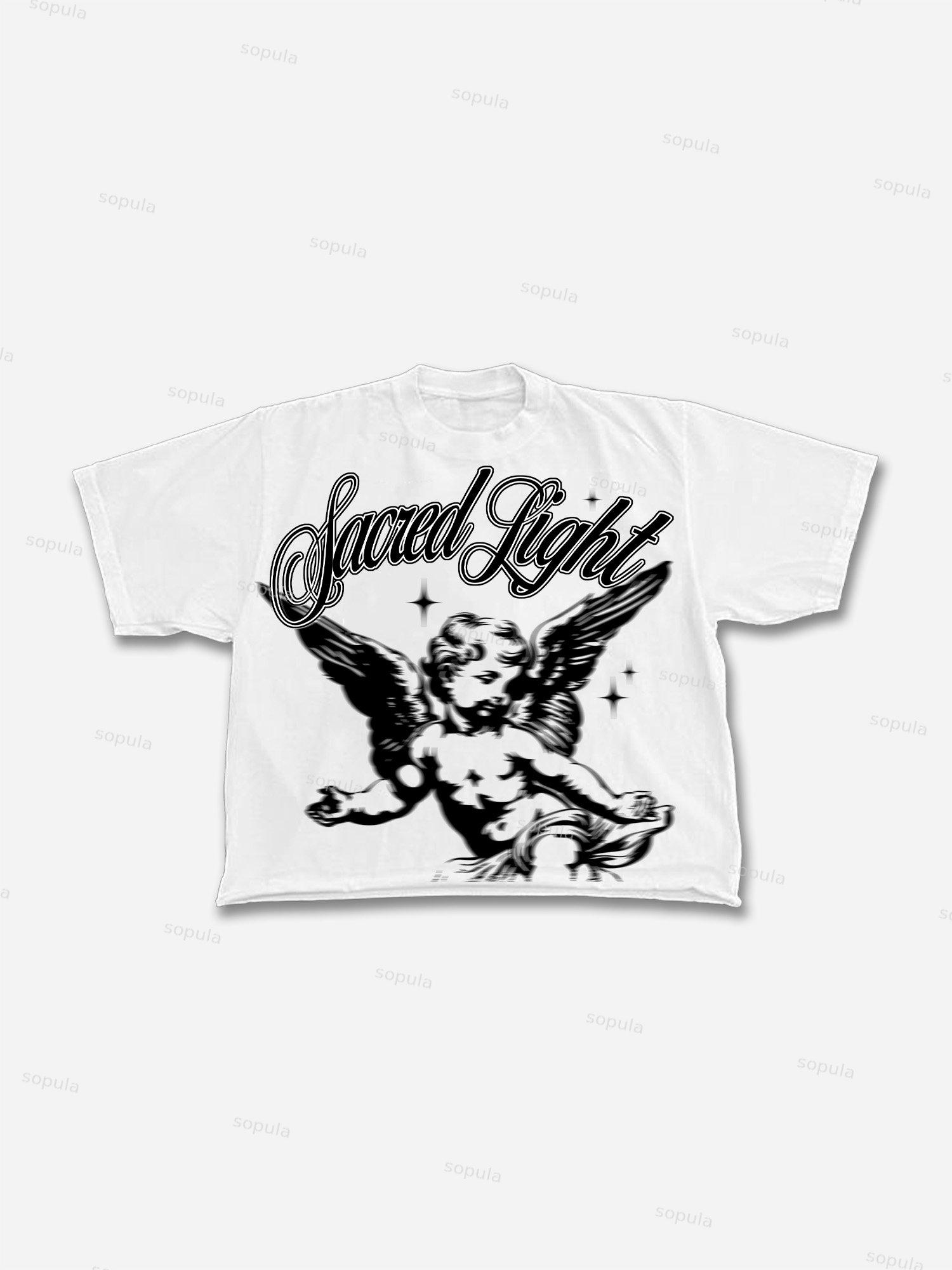 SPU: CP-232078-WJY Fabric: 100% Cotton Fabric Weight: 220g Pattern: Sacred Light Angel Graphic Process: Printed Gender: Women,Men Season: Summer Size Range: S-2XL Color: Black,White Print Position: Front