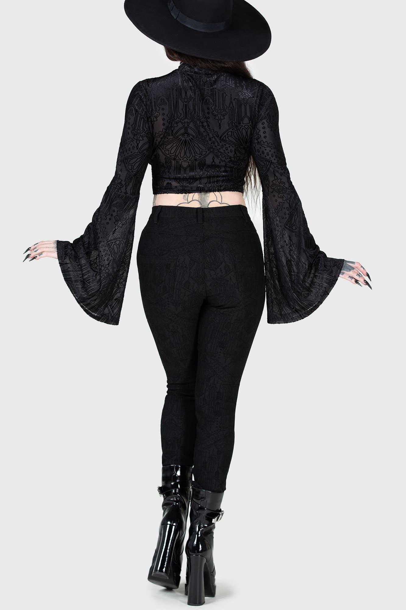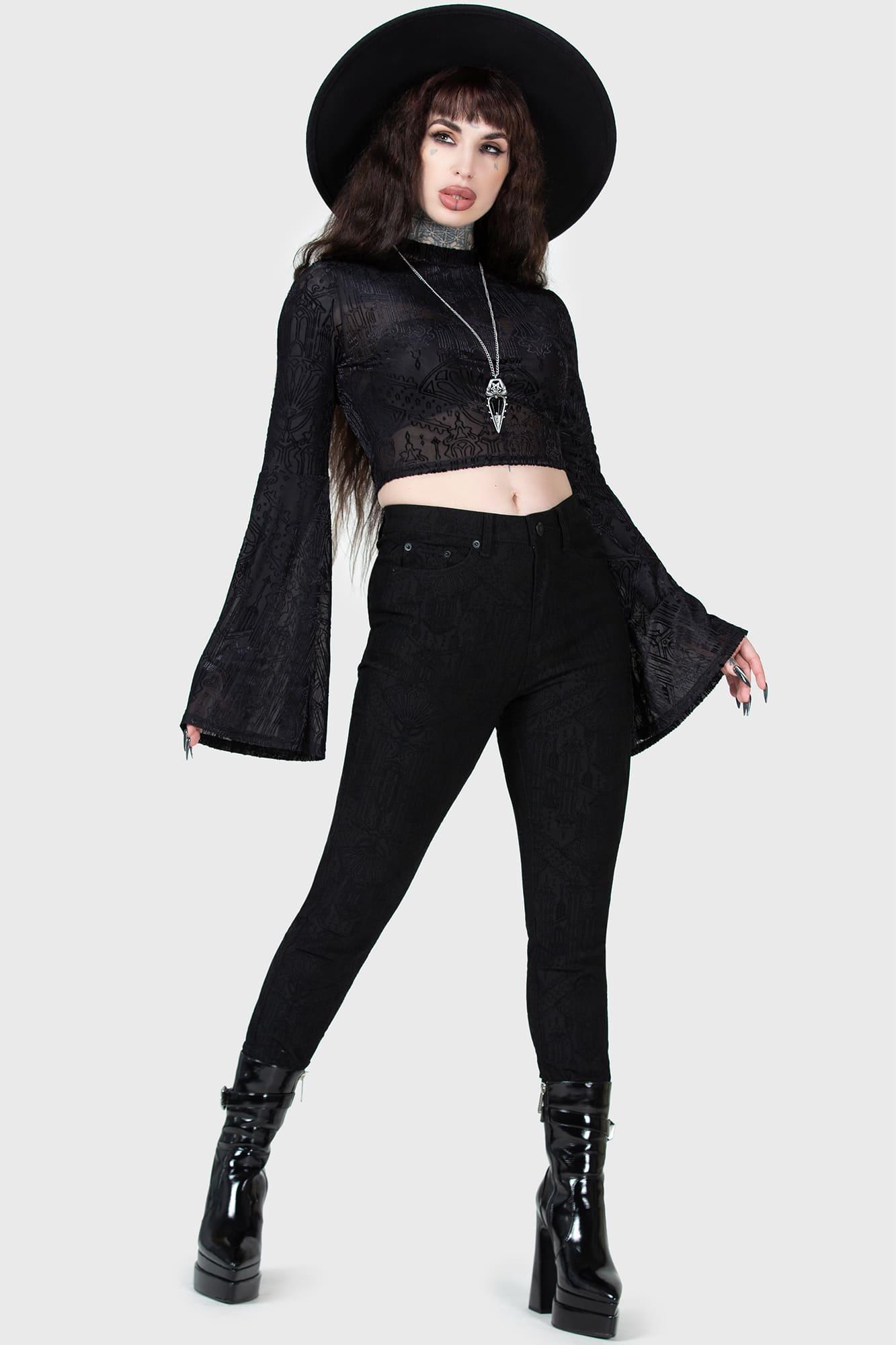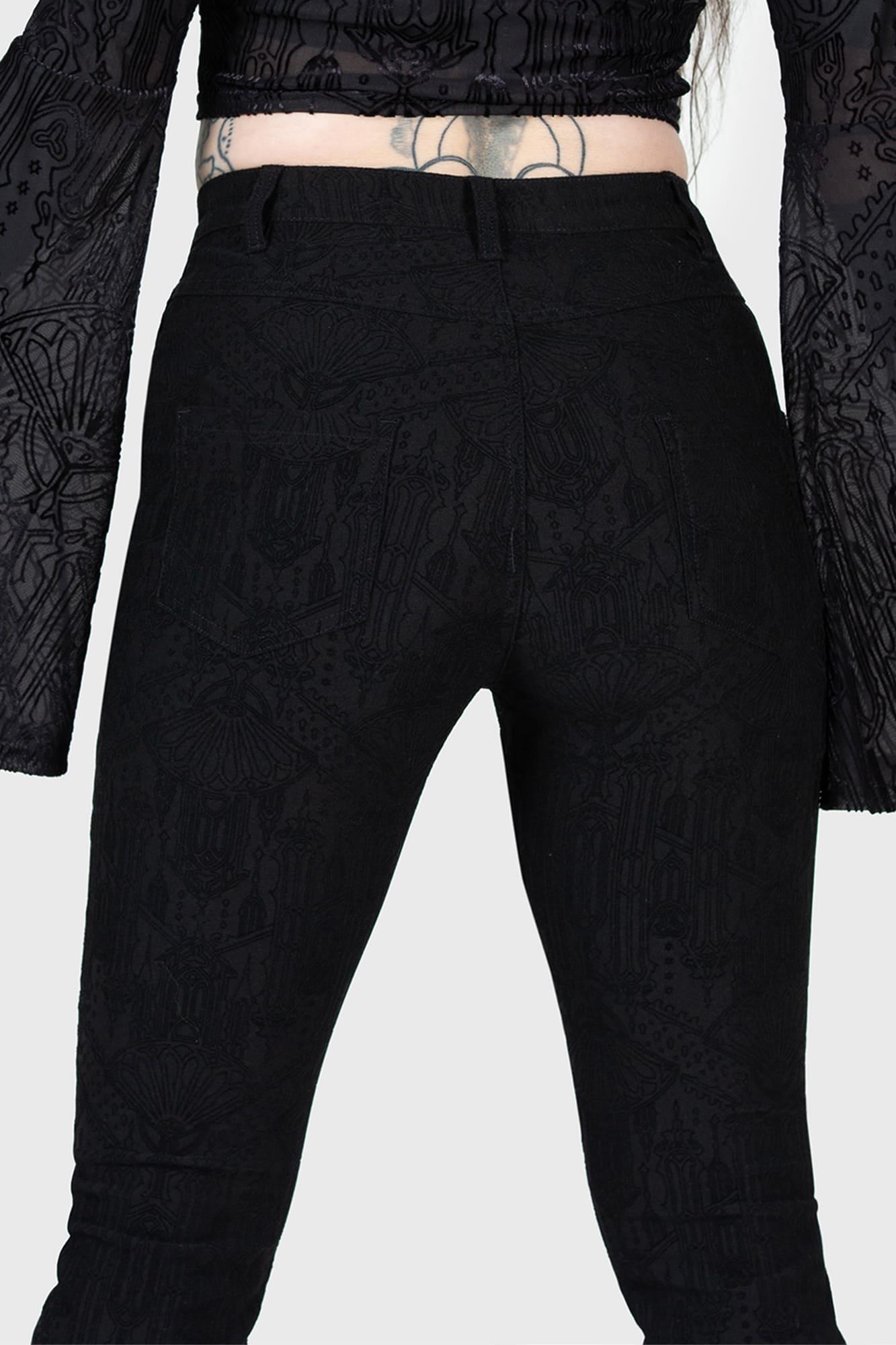 SACRED SINNER.- Soft, stretch fabric.- Cathedral velvet design.- Front + back pockets.- Zip + button closure.- Skinny fit.With KILLSTAR branding, Fabric 1: 71% Viscose 26% Polyamide 4%Elastane Fabric 2: 95% Polyester 5% Elastane.Machine wash cold (30°c) / Do not bleach / Do not tumble dry / Do not iron / Do not dry clean. Imported.