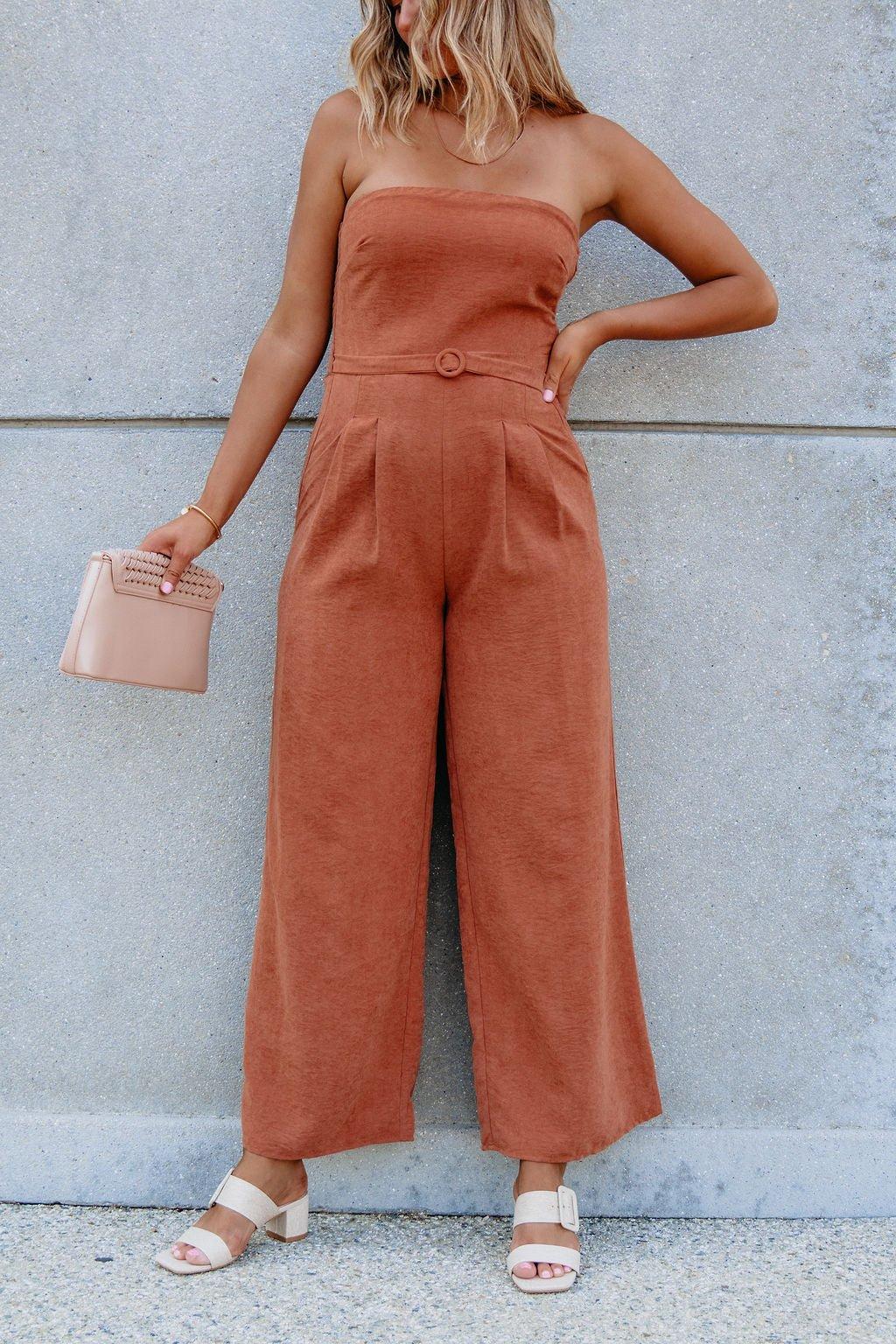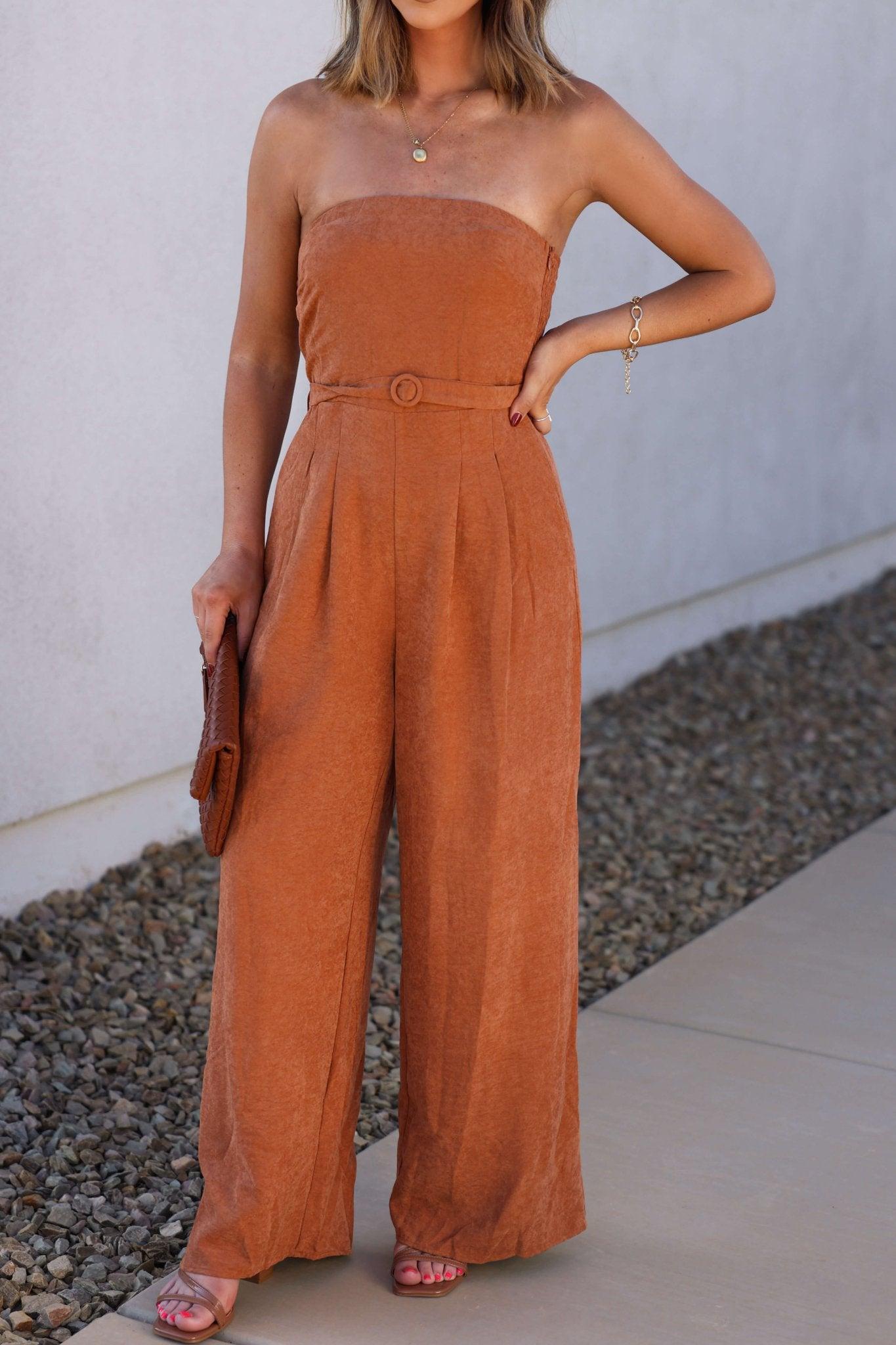 Bold, effortless, and ready for anything—the Sadie & Sage Rust Strapless Belted Jumpsuit brings sleek sophistication to the season. Designed with a strapless neckline and flattering wide-leg silhouette, this one-and-done look features pleated detail and an attached belt that cinches the waist. Pair it with heels and statement earrings for a night out, or layer with a blazer for a polished daytime vibe.