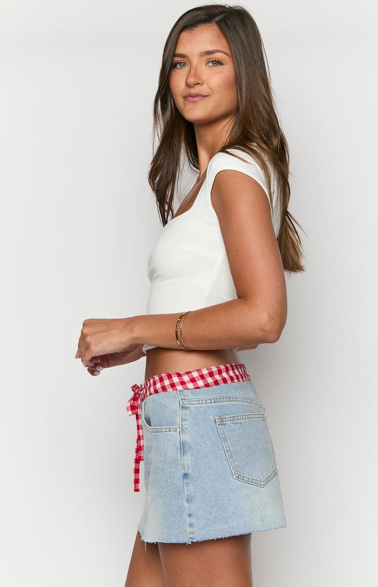Gingham Contrast Denin Mini Skirt How to style:Bring a playful vibe to your outfit with our Sadie Denim Low Rise Mini Skirt! Featuring a contrasting red gingham waist and made in a light wash denim, this skirt is the not-so basic piece you've been looking for. Pair with a fitted white crop top and boots for a fun, casual look! Finish your look with some red accessories to tie it all together. Features: Mini length Raw hem Light wash denim Mid-rise fit Contrasting red gingham waist Mid weight denim material Slight stretch