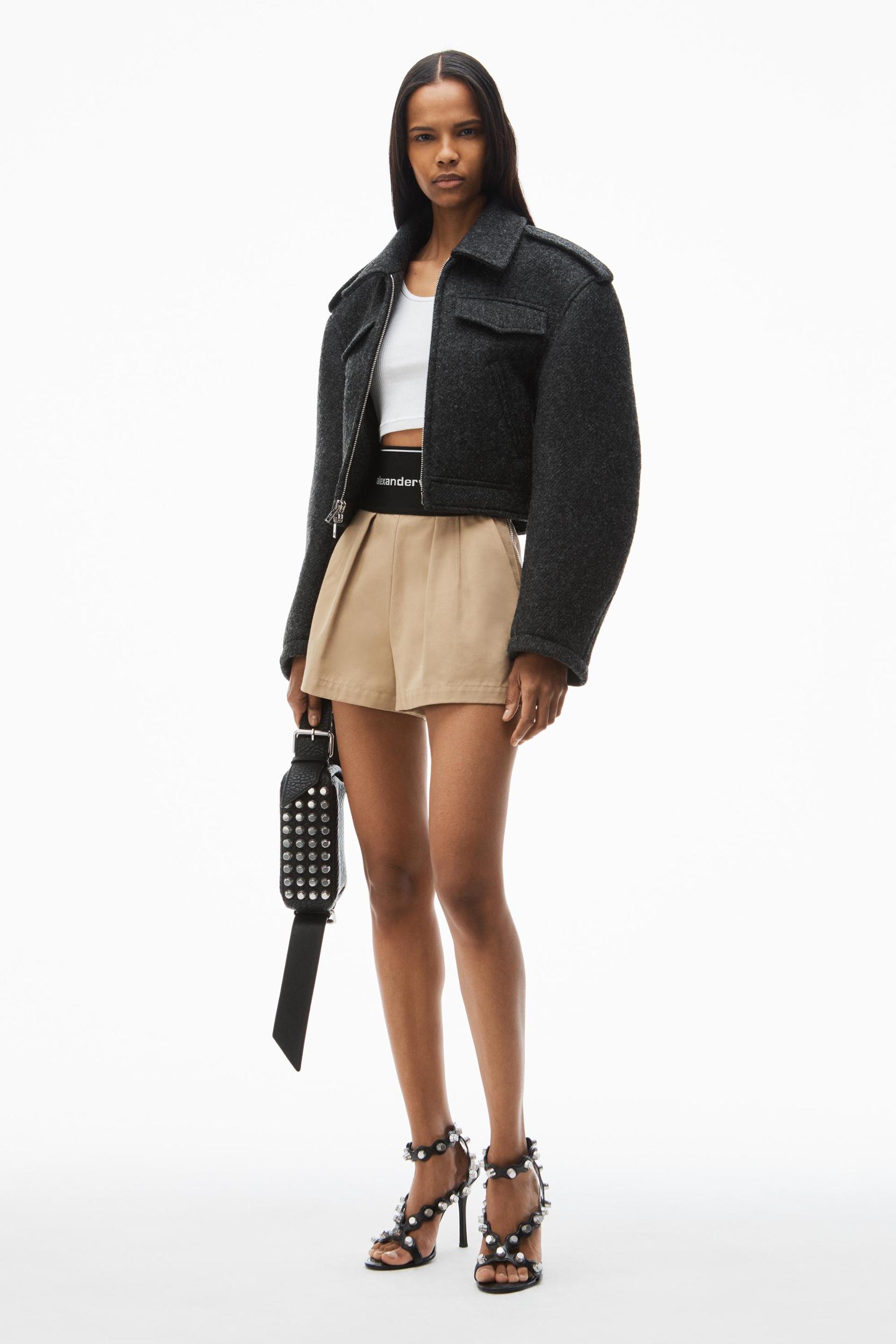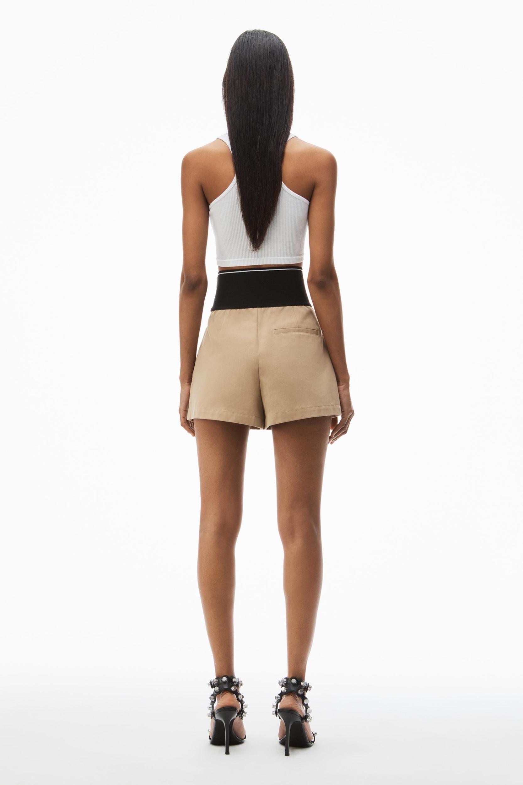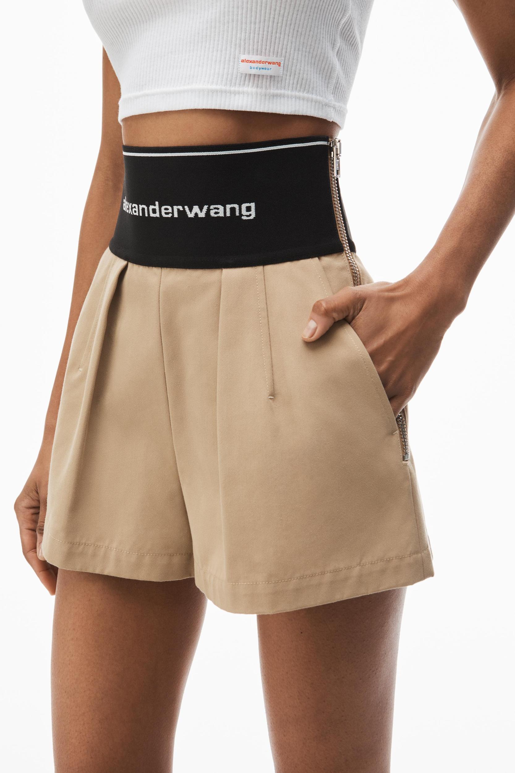 high-waisted tailored camel cotton twill safari shorts with an elastic logo waistband, side pockets and exposed metal zip closure at left side seam