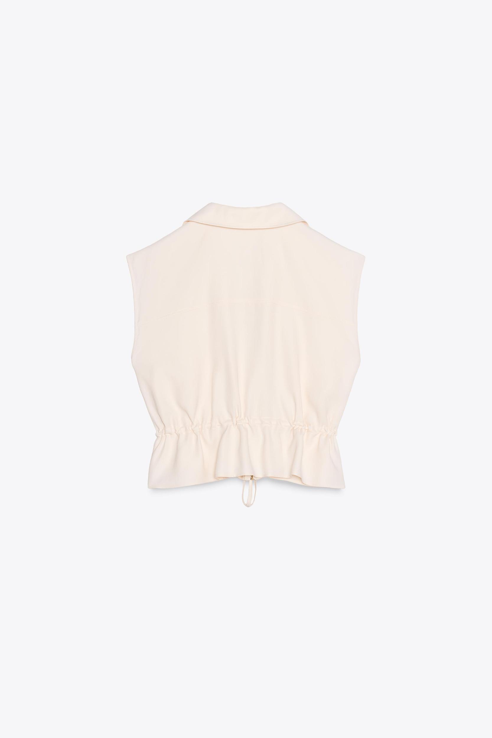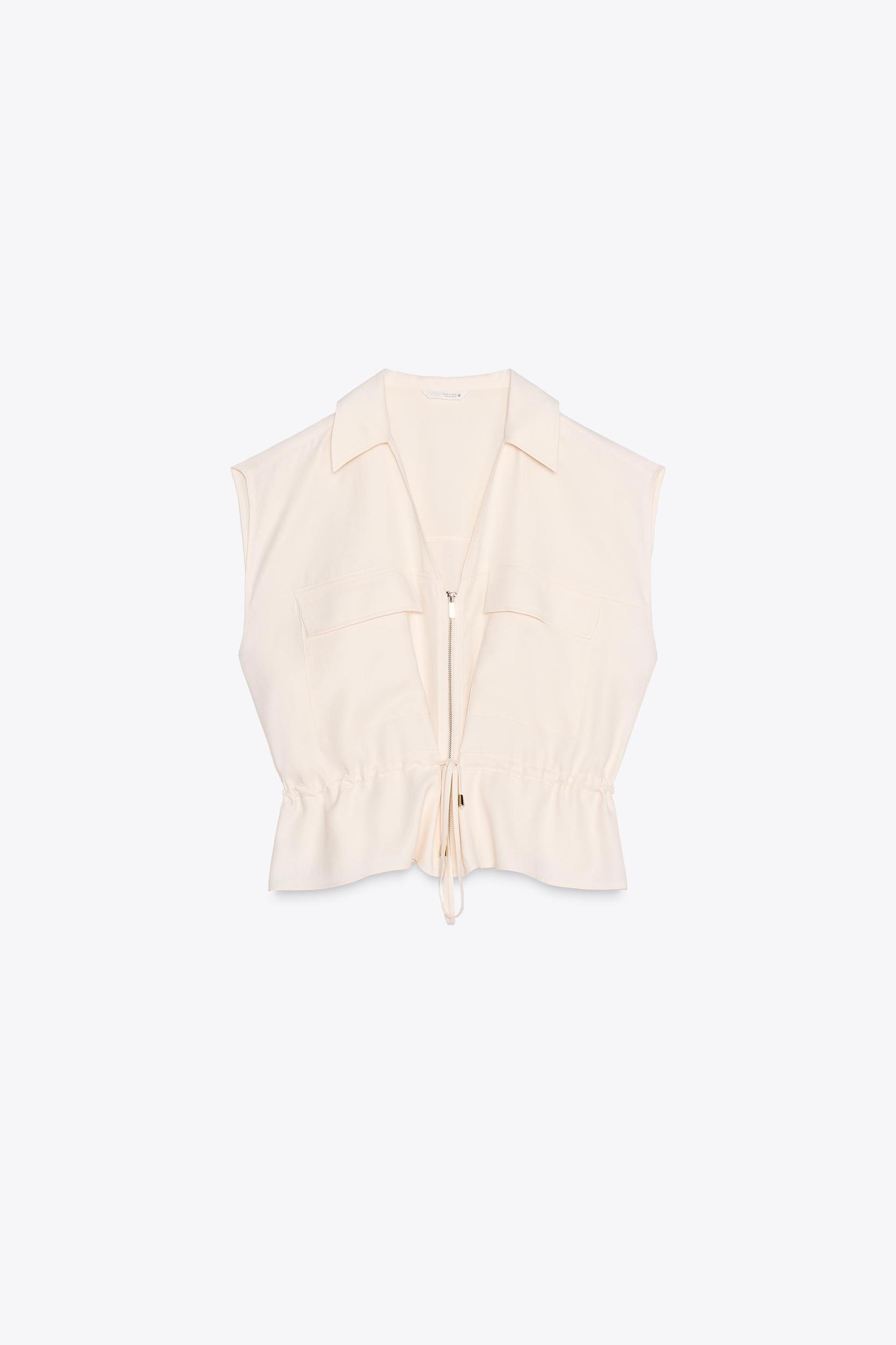 Lapel collar top with V-neck and sleeveless design. Front patch pockets with flaps. Adjustable drawstring waist. Front zip closure.
