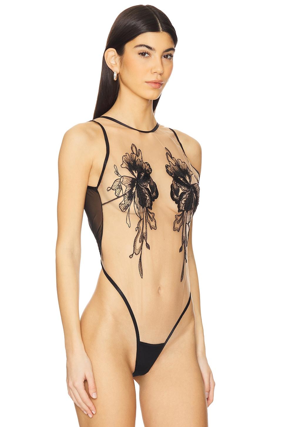 Self 1: 100% recycled polyesterSelf 2: 90% polyamide, 10% elastaneSelf 3: 100% viscose. Made in China. Machine wash. Halterneck S-hook closure. Cut-out detail at back and thong design. Sheer mesh fabric with embroidery at breast. Garment is intentionally sheer, undergarments will show through. Revolve Style No. BEBE-WS6. Manufacturer Style No. 42532.