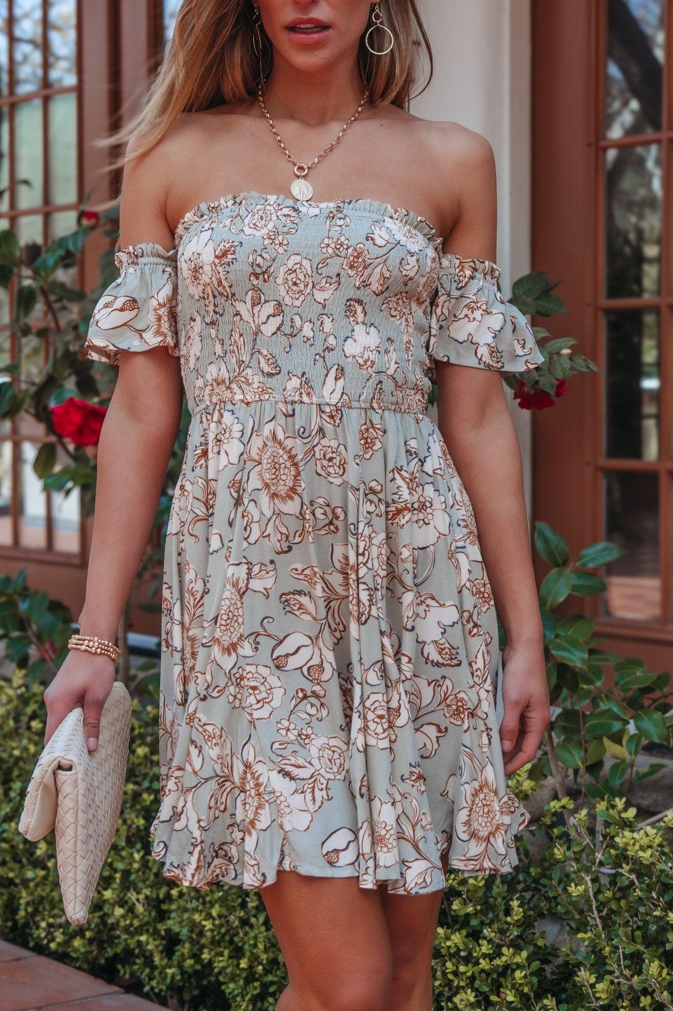 Our Sage Floral Print Off the Shoulder Mini Dress is a feminine and flirty piece perfect for any occasion! Designed with an off-the-shoulder silhouette and a square neckline, this dress exudes effortless charm. The smocked bodice provides a flattering, flexible fit, while the allover floral print adds a touch of romance. Ruffle detailing enhances the playful, flowy look, making it ideal for brunch, date nights, or vacation strolls. Pair it with strappy sandals and dainty jewelry for the perfect chic ensemble!