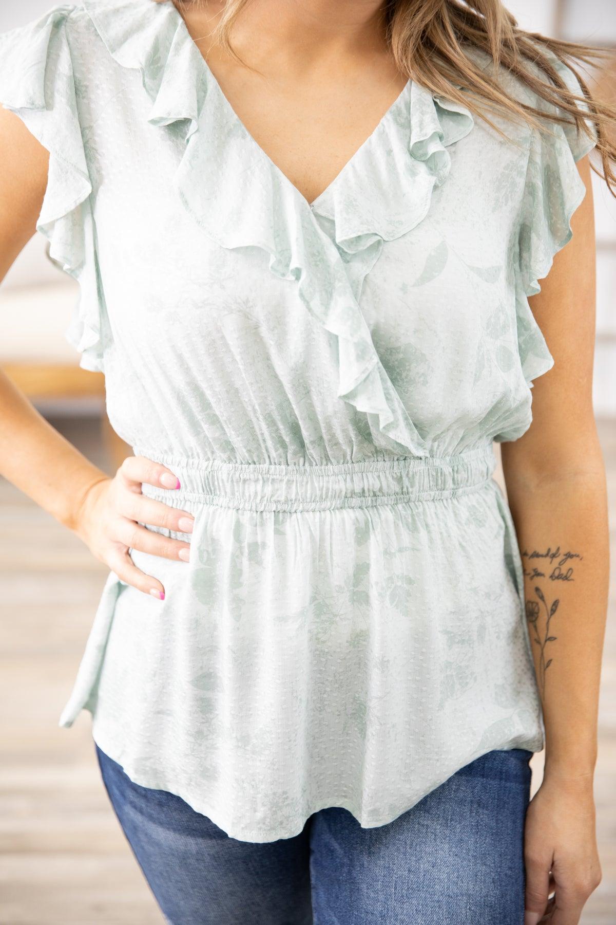 Product Details Colors: Sage Print: Leaf Collar: Surplice Sleeve: Cap Sleeves Hemline: Straight Material and Care 100% Rayon Hand Wash Cold Hang Dry Size and Fit Small: Bust 32" Waist 27/30" Length 25" Medium: Bust 34" Waist 29/32" Length 26" Large: Bust 36" Waist 31/34" Length 27" Model is 5'9 and wearing a size medium