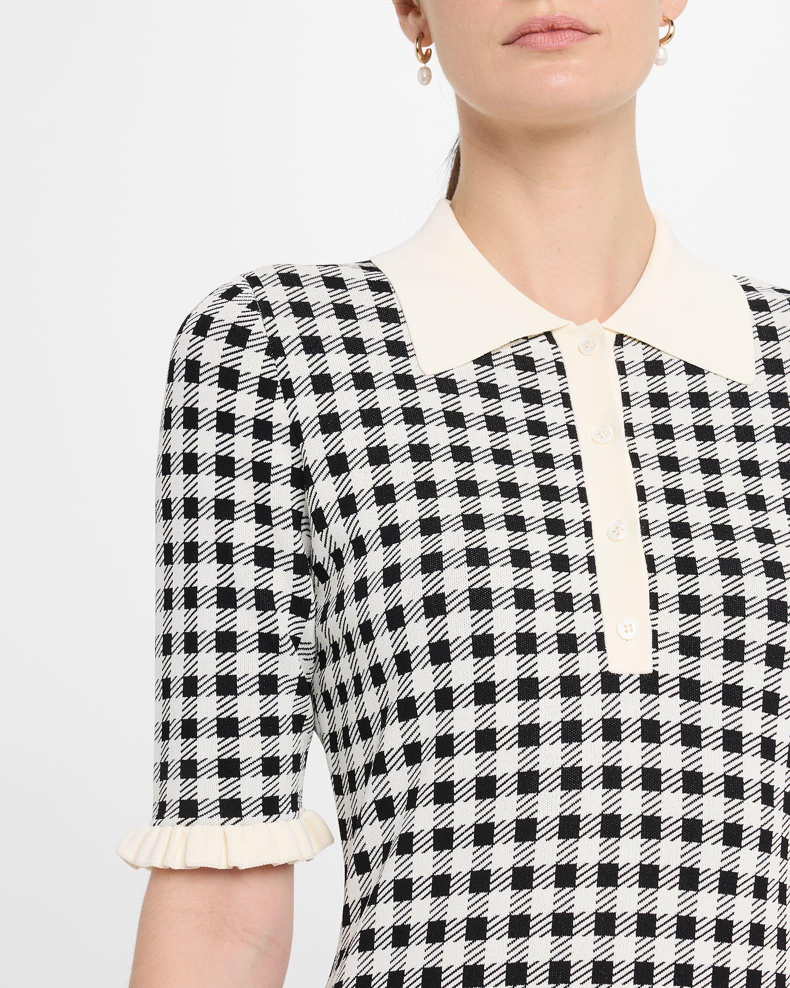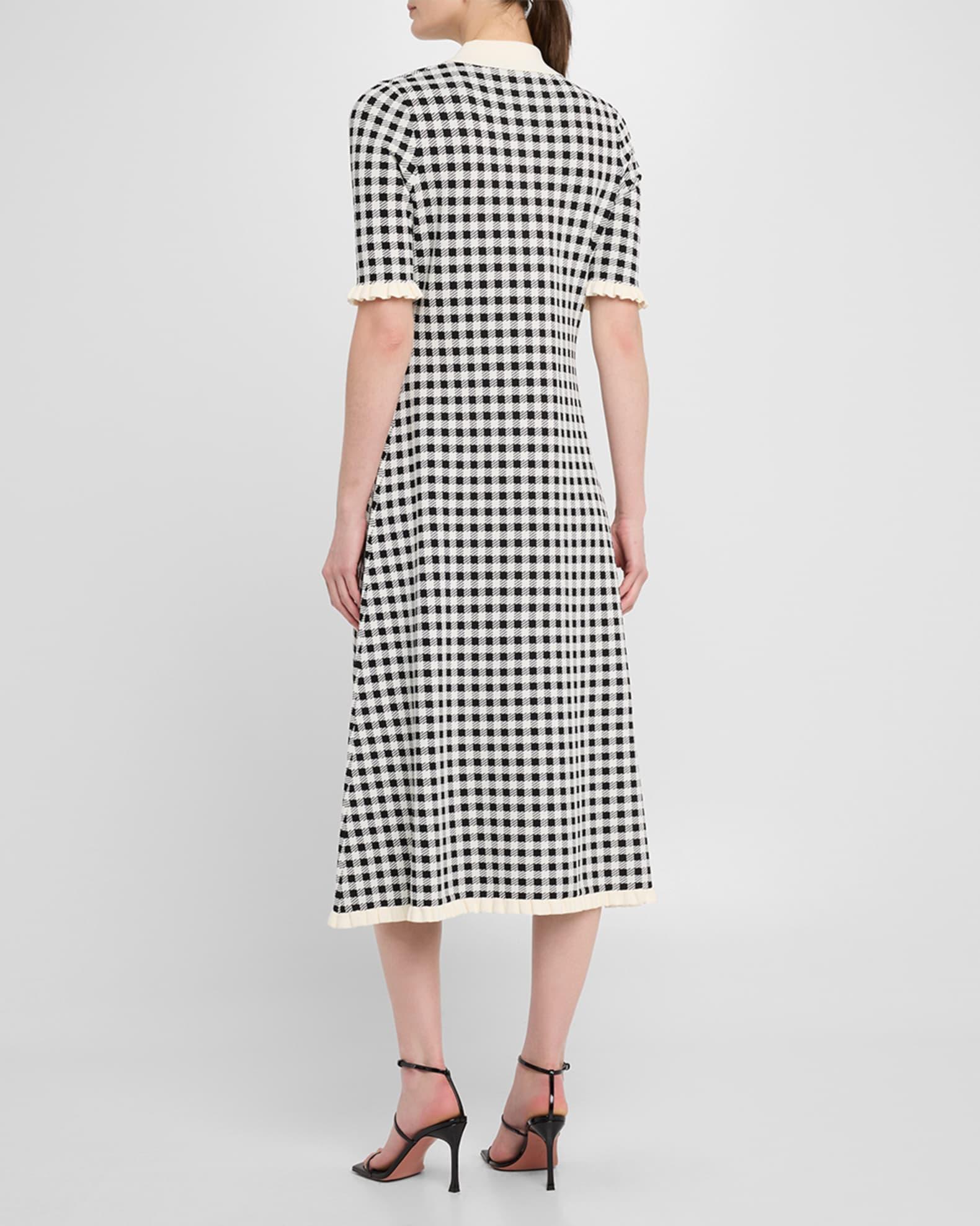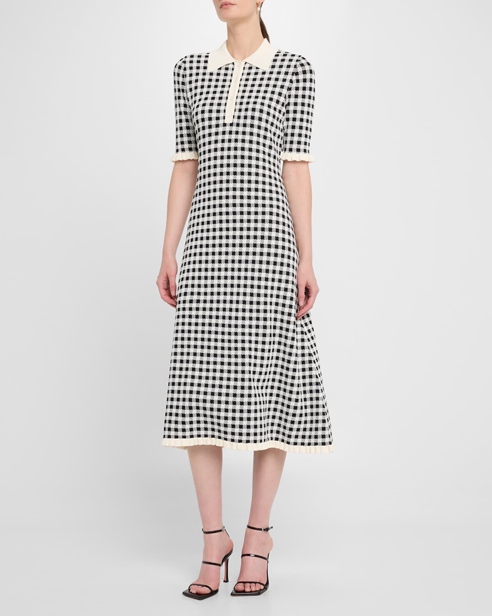 Sea "Saige" gingham-print knit midi dress finished with ruffled trim Point collar; button-placket Short sleeves A-line silhouette Hem falls below the knee Slipover style Viscose/Elite® polyester Imported