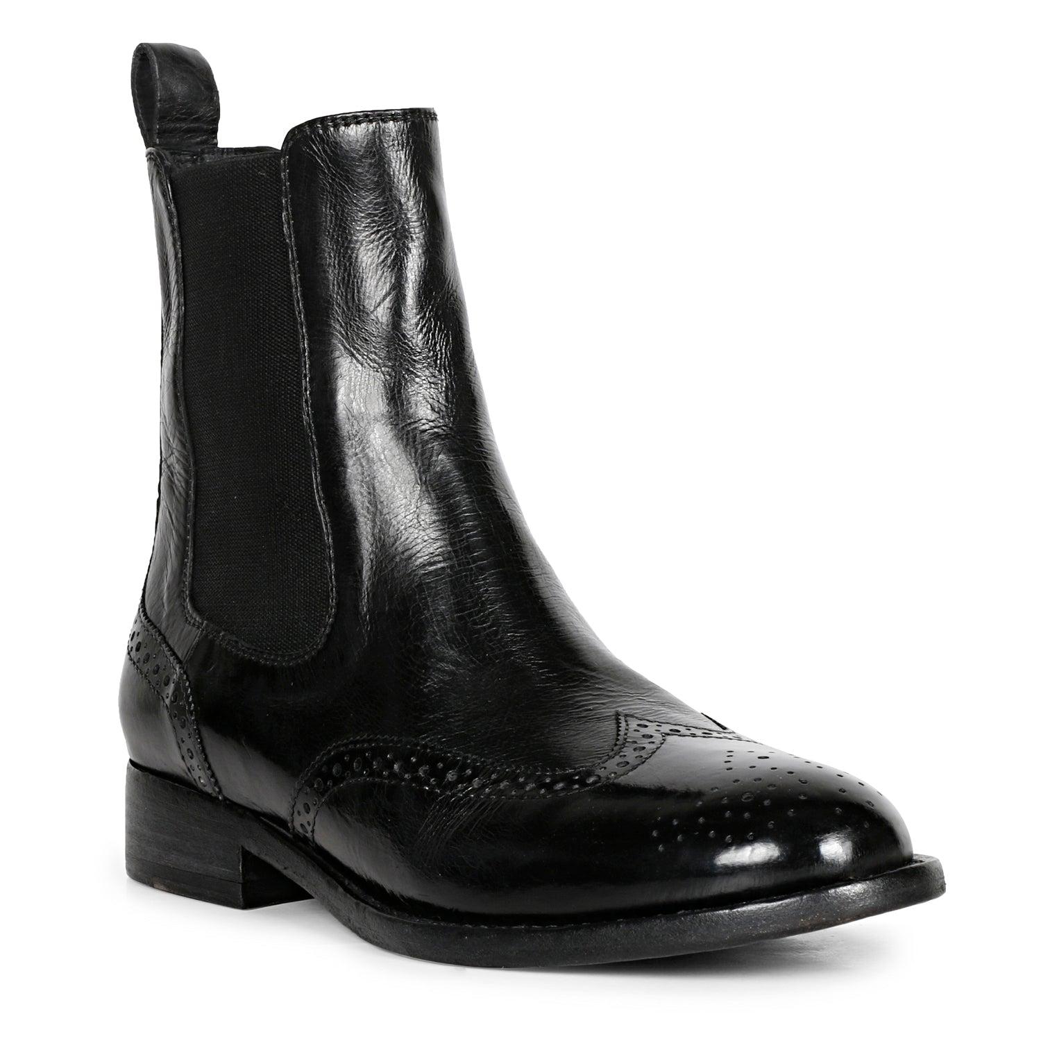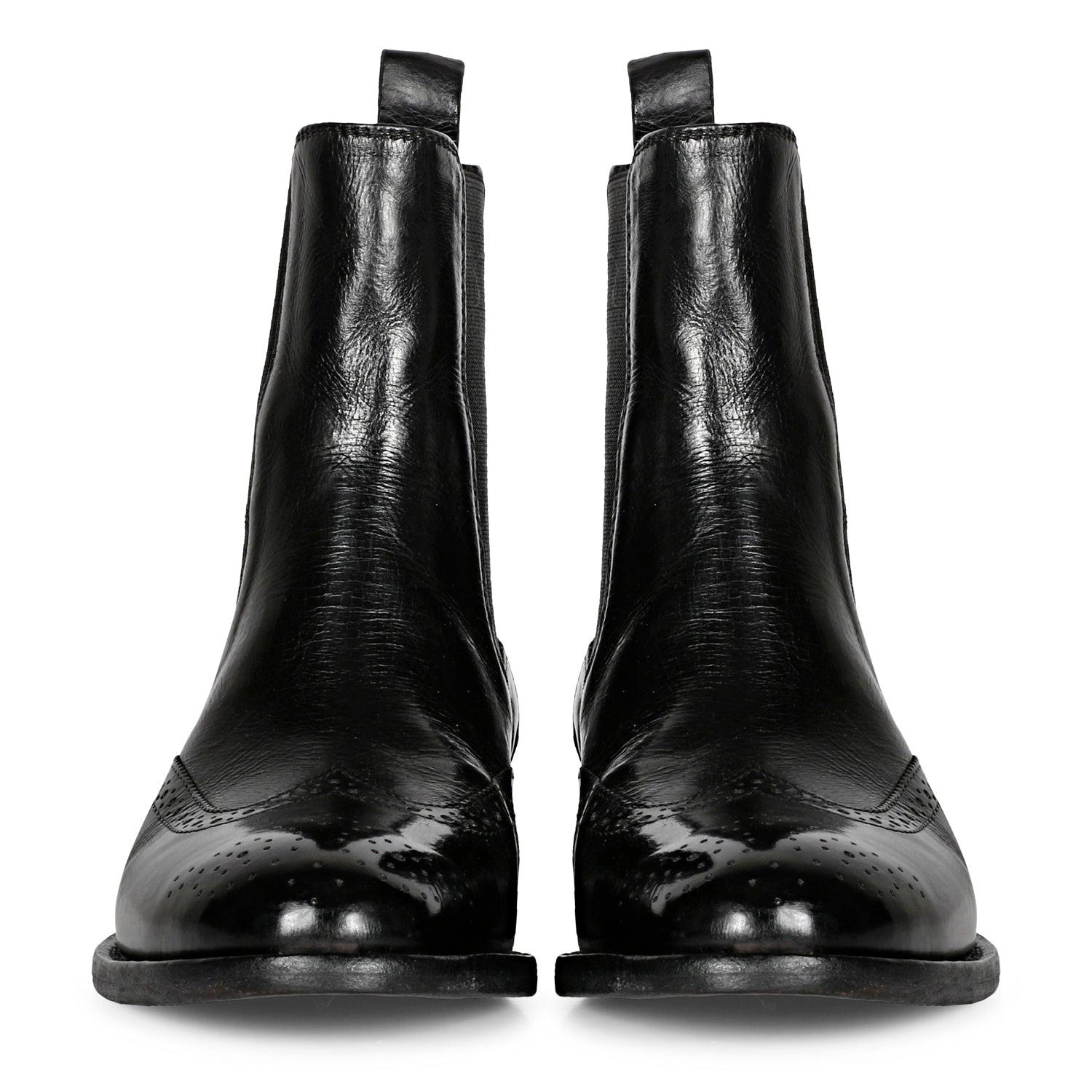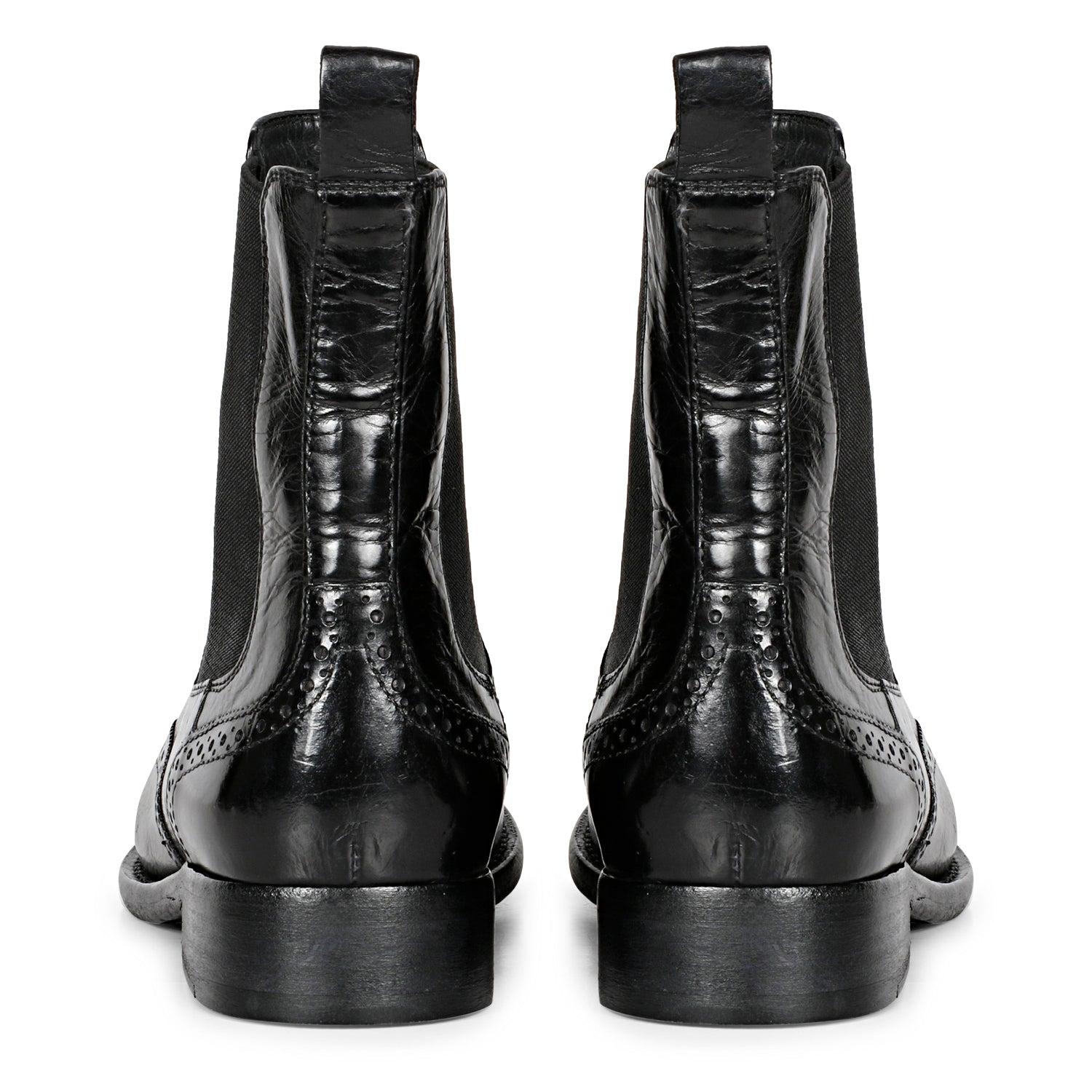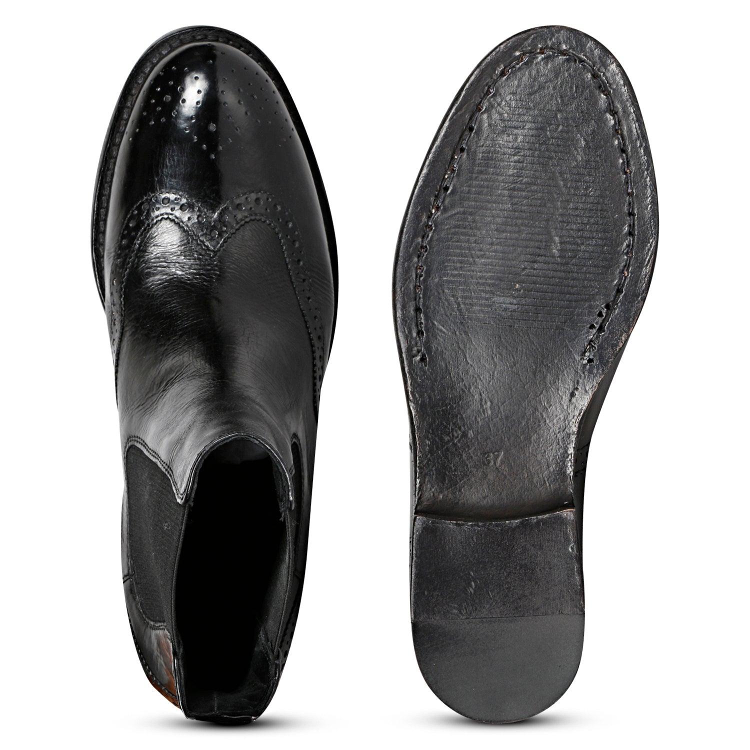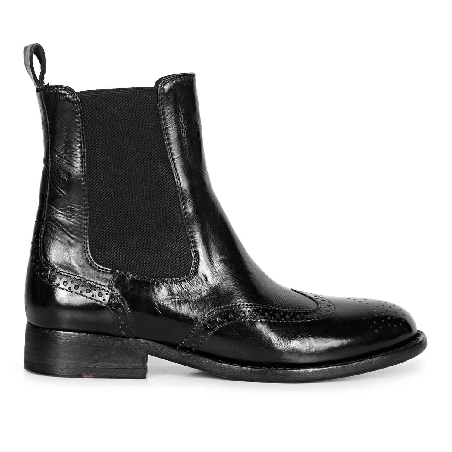 SaintG Santina Black Leather Brogue Chelsea Boots: Elegant Comfort and Classic StyleElevate your footwear collection with the SaintG Santina Black Leather Brogue Chelsea Boots. Designed for both sophistication and comfort, these boots feature a refined brogue detail and high-quality materials for a chic and versatile addition to your wardrobe.Key Features:Premium Materials: Crafted from black calf milled leather, these boots offer a luxurious look and feel. The leather lining and padded footbed ensure all-day comfort, making them perfect for both casual and formal occasions.Hand-Finished Italian Leather Sole: The Santina Chelsea Boots sit on a meticulously hand-finished Italian leather sole, providing durability and a polished finish. The soft genuine leather interior maximizes comfort and breathability.Convenient Design: Slip on and off with ease thanks to the elasticated sides and leather pull tab. This design ensures a snug fit and hassle-free wear.Elegant Brogue Detail: Detailed with classic brogue accents, these boots add a touch of timeless elegance to your ensemble. Ideal for enhancing both professional and stylish looks.Shaft Measurements:Size 36: Shaft Height 150mm, Shaft Circumference 239.8mmSize 37: Shaft Height 138mm, Shaft Circumference 245mmSize 38: Shaft Height 156mm, Shaft Circumference 250.2mmSize 39: Shaft Height 159mm, Shaft Circumference 255.4mmSize 40: Shaft Height 162mm, Shaft Circumference 260.6mmSize 41: Shaft Height 165mm, Shaft Circumference 265.8mmHeel and Sole Heights:Heel Height: 1 cmSole Height: 2 mmExperience unmatched elegance and comfort with the SaintG Santina Black Leather Brogue Chelsea Boots. Perfect for adding a sophisticated touch to any outfit, these boots are a must-have for every stylish wardrobe.