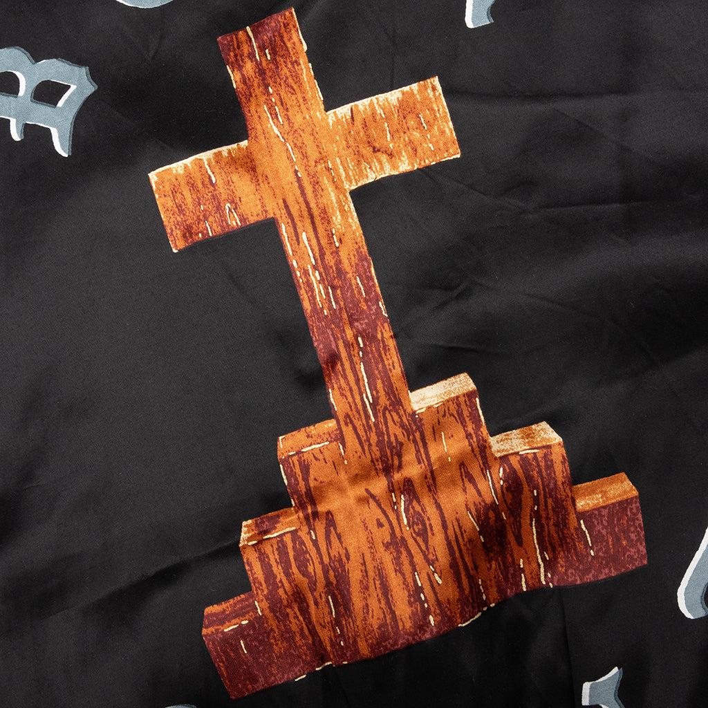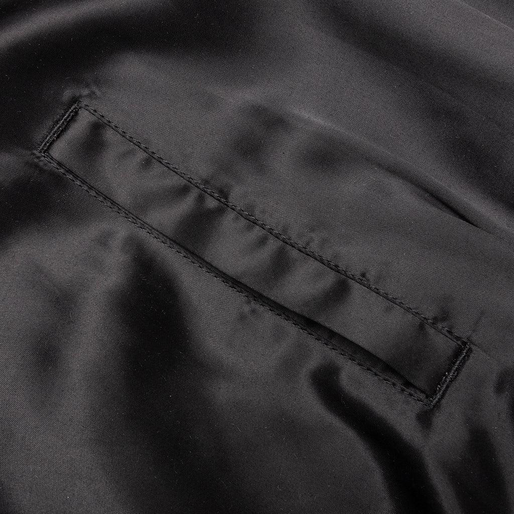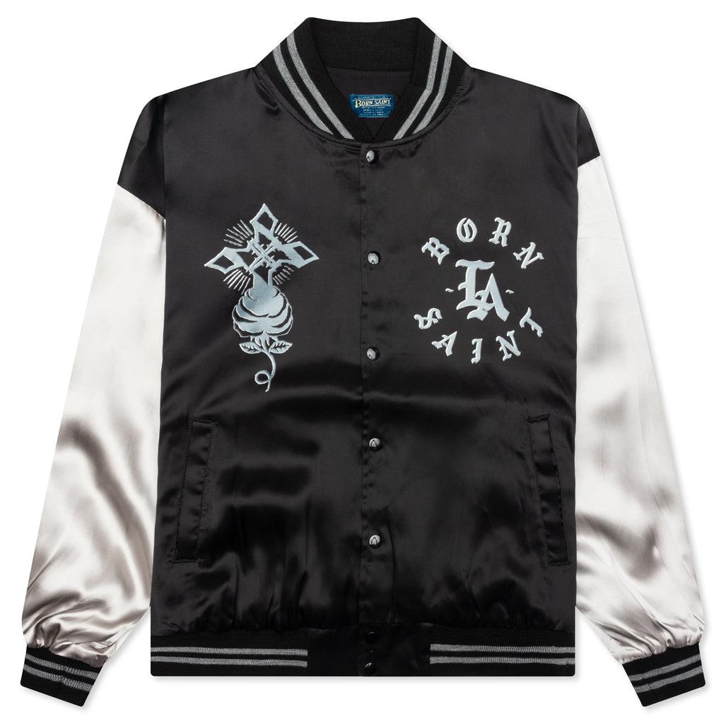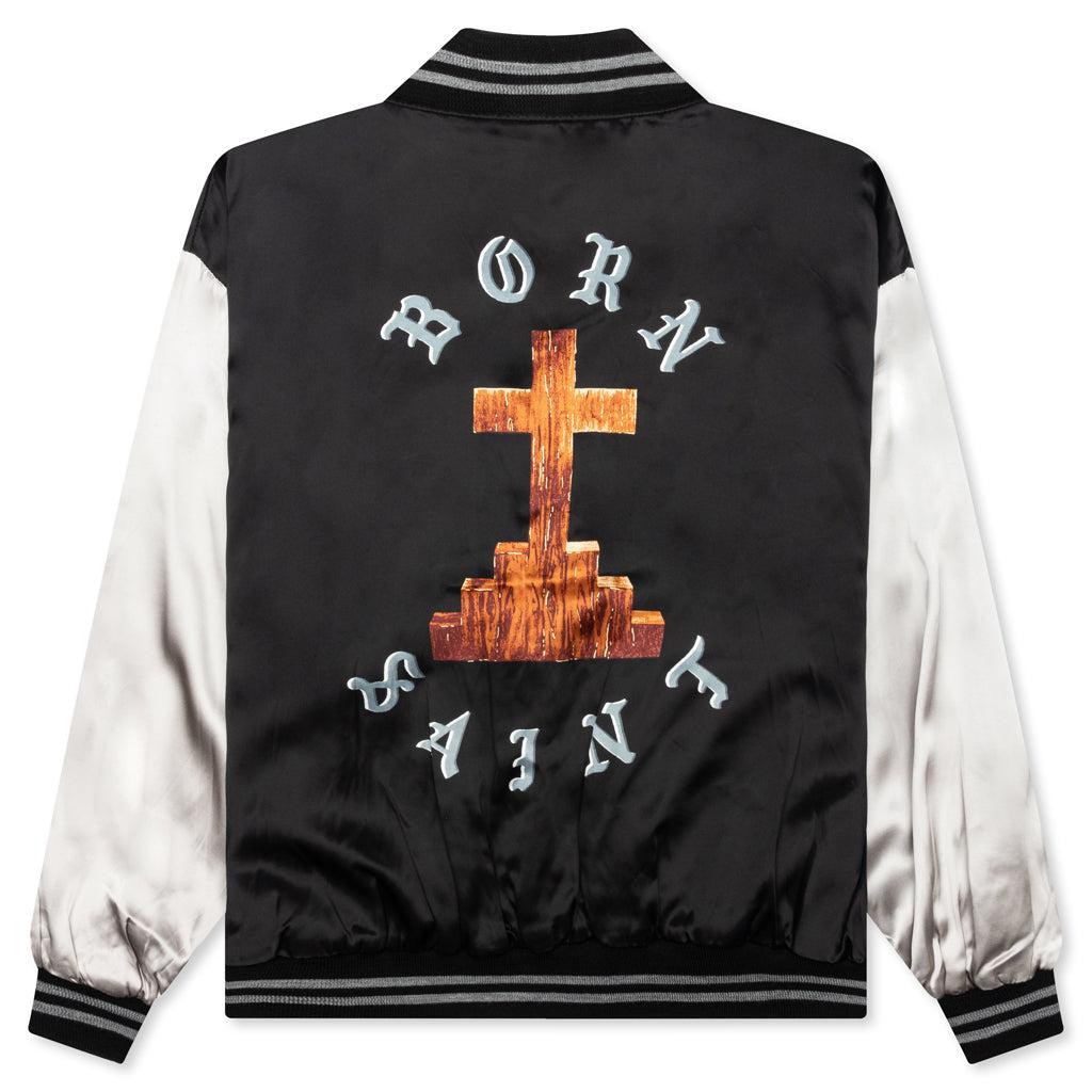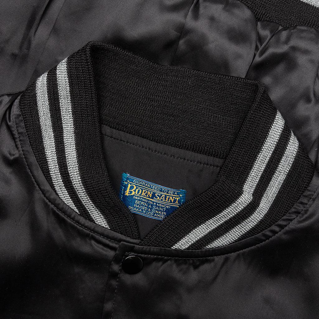 The Saint Michael x Born X Raised Satin Jacket in Black/Grey. This jacket features a rib knit collar and button fastening for a classic look. It showcases embroidered detailing and a screen-printed graphic on the back. Rayon construction Rib knit collar Button fastening Embroidered detailing Straight hem Screen printed graphic Style No: SM-YS8-0000-C12