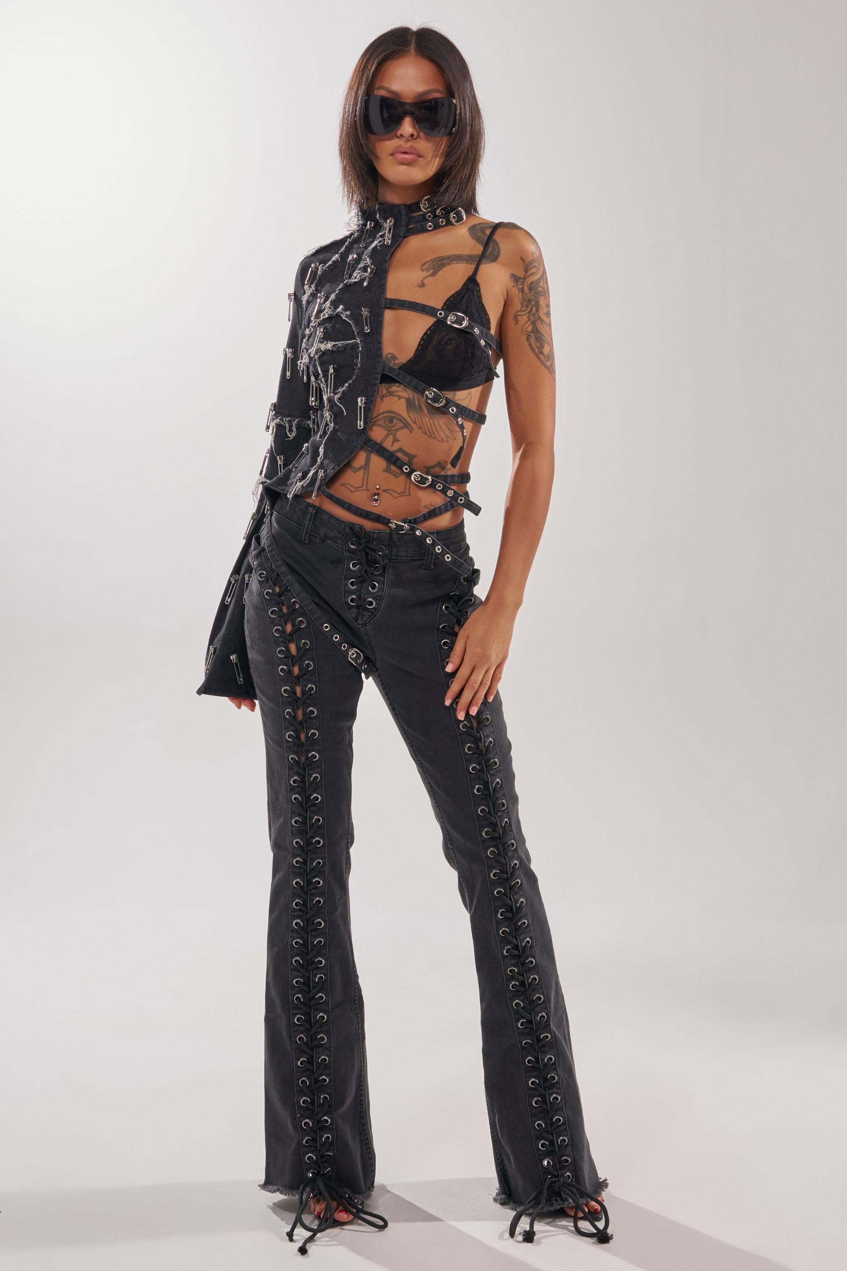 The AKIRA Label Saint Sernin One Shoulder Blouse reimagines deconstructed design with a daring, avant-garde edge. Crafted from black denim with raw, frayed seams, this asymmetrical top features a single long sleeve adorned with safety pin embellishments and multiple adjustable buckle straps that wrap around the body. The exposed back and structured neckline add a bold, architectural feel, blending punk inspiration with couture detailing. Pair it with fitted pants or a leather mini to complete a striking, high-fashion statement look. - 98% Cotton, 2% Spandex- Spot Clean Only- Slight Stretch- Imported (all measurements approximate from size small)- 18” Shoulder to Hem- 27” SleeveProduct ID: 1070186 (all measurements approximate from size 1X)- 21” Shoulder to Hem- 27.5” SleeveProduct ID: 1070190