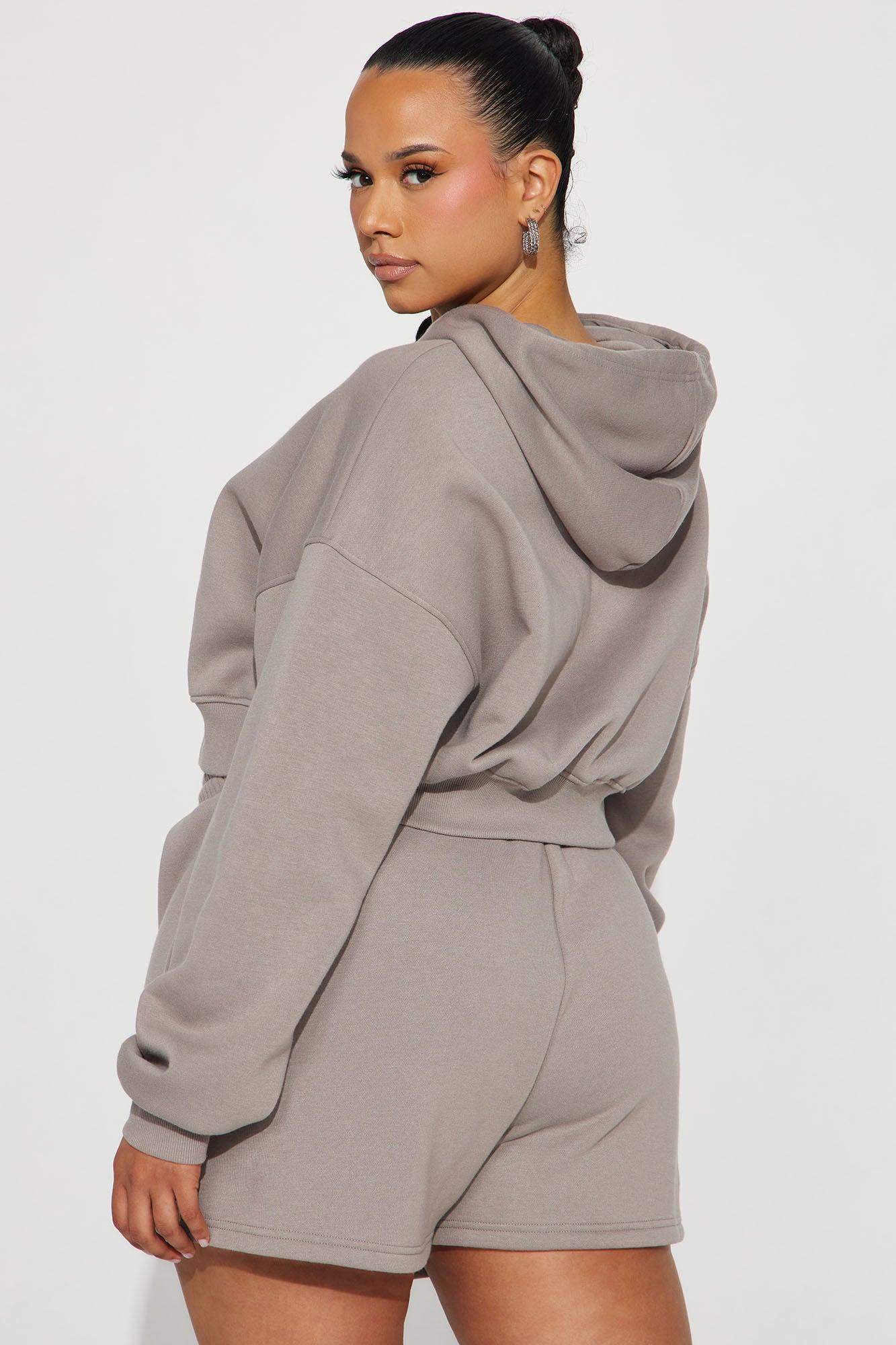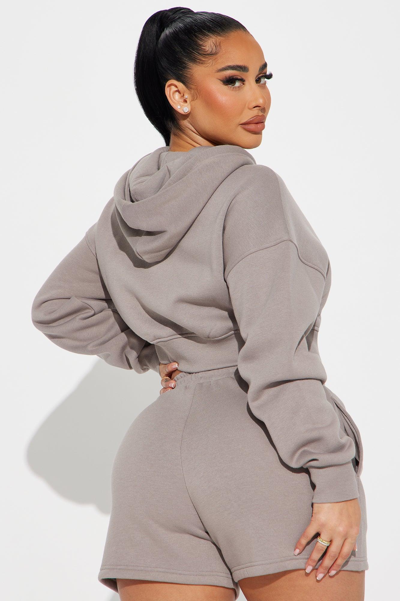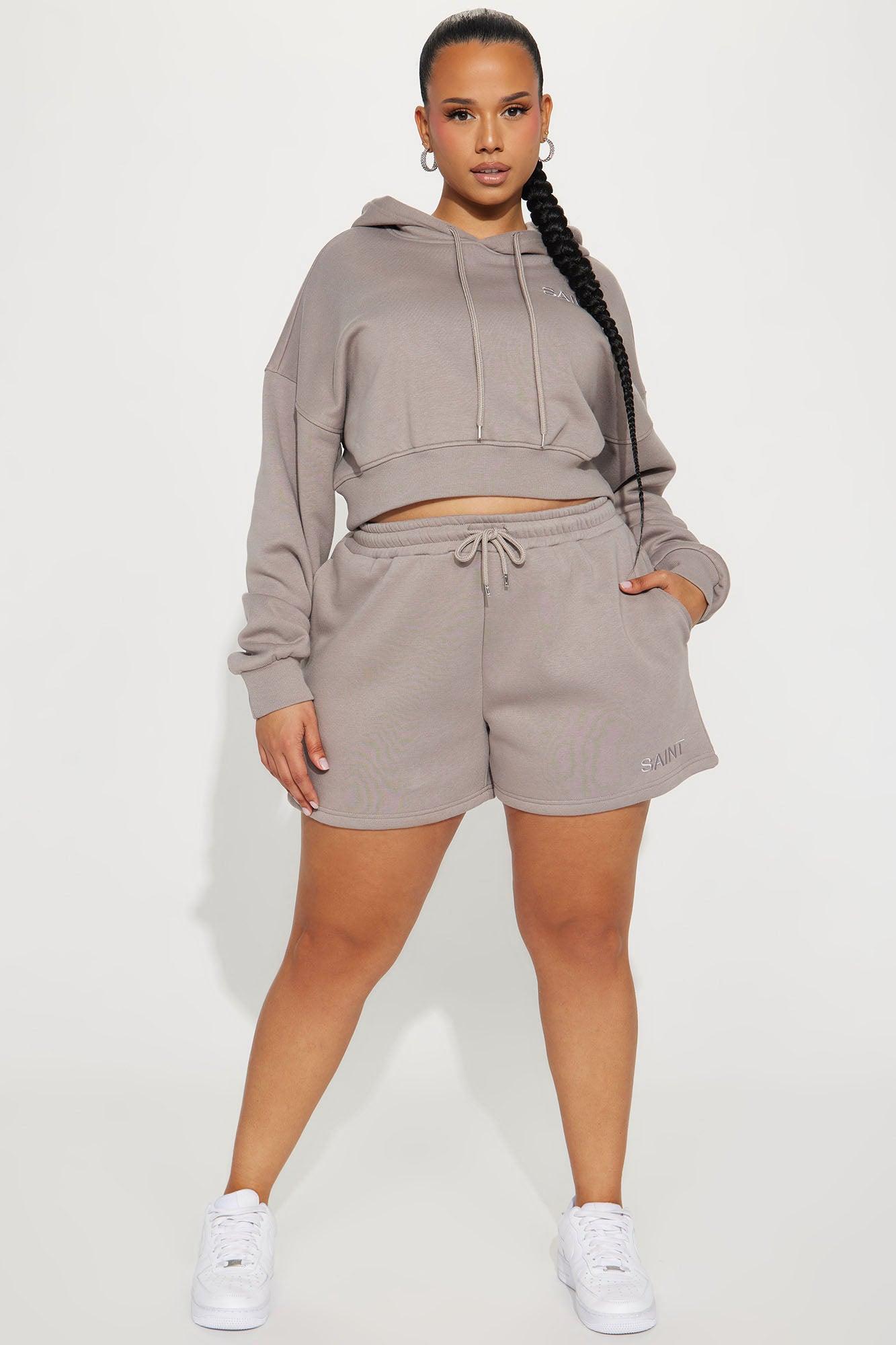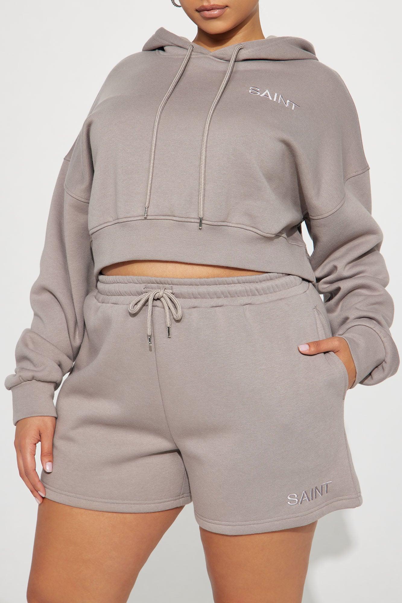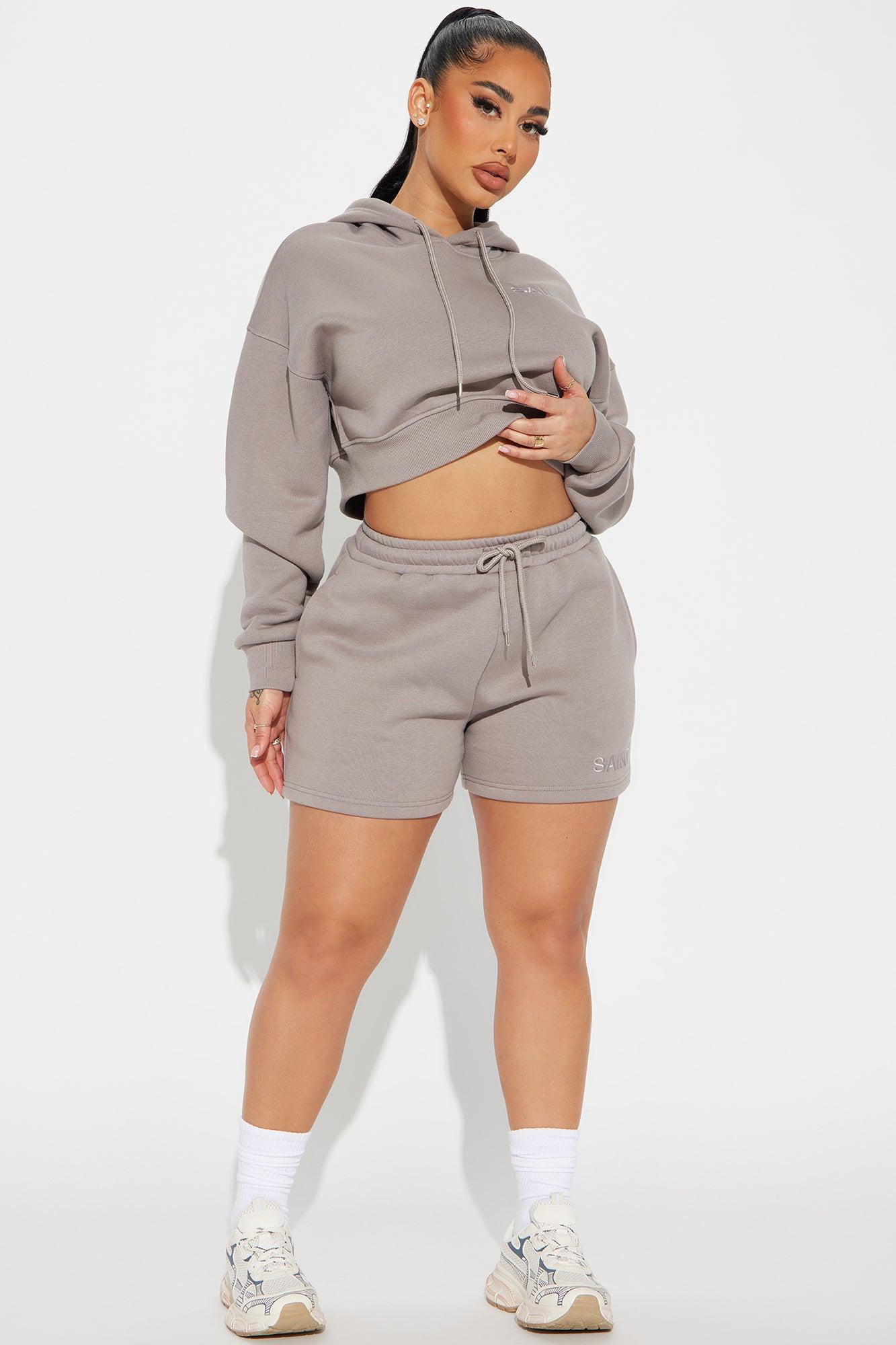 Available In Stone. Short Set Sweatshirt Hoodie Cropped With Cut Hem Kangaroo Pocket Embroidery On Top And Bottoms Sweat shorts Elastic Waistband Drawstring Waist Stretch 52% Cotton 48% Polyester Imported California Proposition 65WARNING: Cancer and Reproductive Harm - www.P65Warnings.ca.gov.