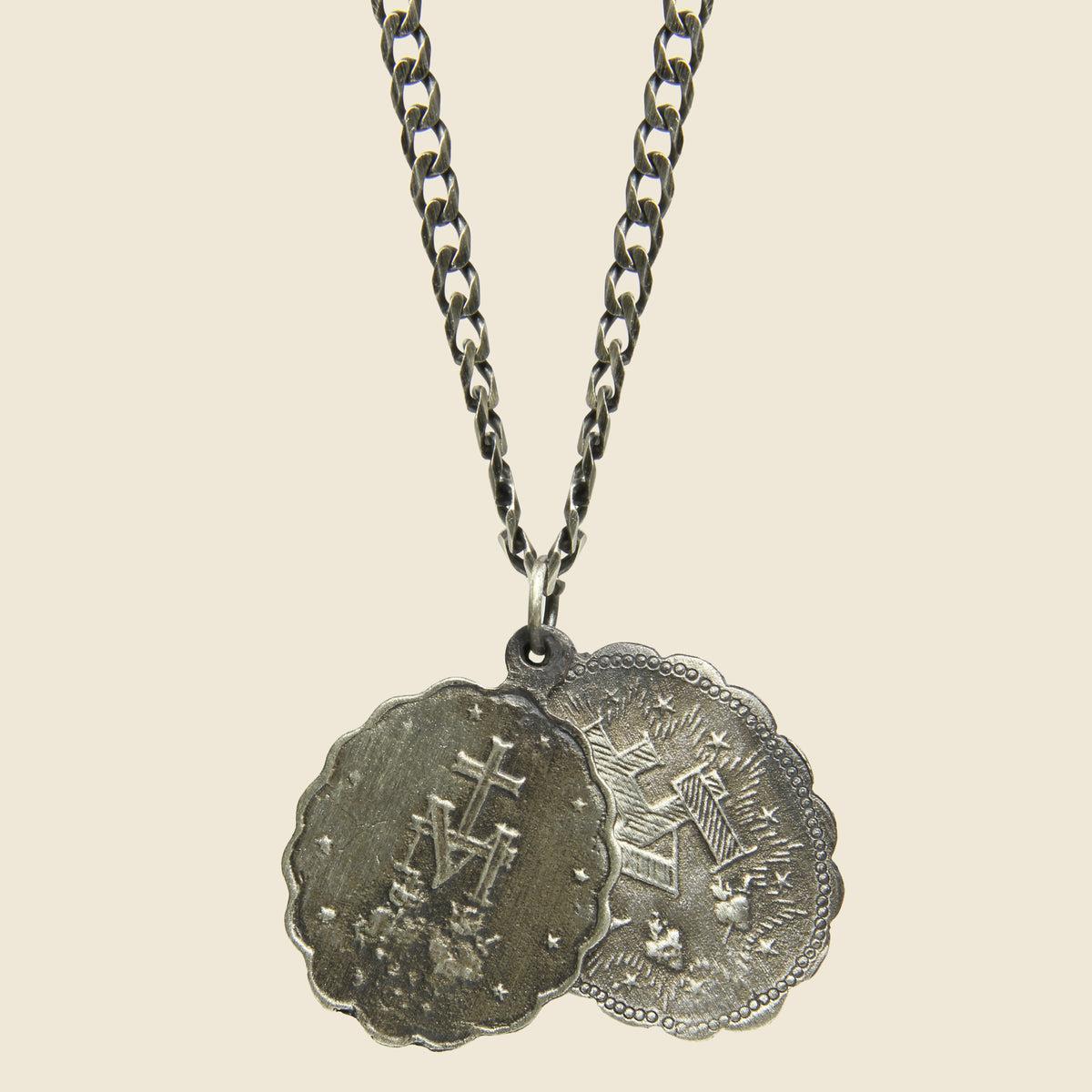 The Saints Necklace from Miansai features intricate depictions of "Our Lady of Victory" on two sterling silver pendants hanging on a delicate 25" chain. Handmade in the US using a special antique reproduction process. The Saints Necklace is timeless and made to last through the generations. American-handmade 25" chain
