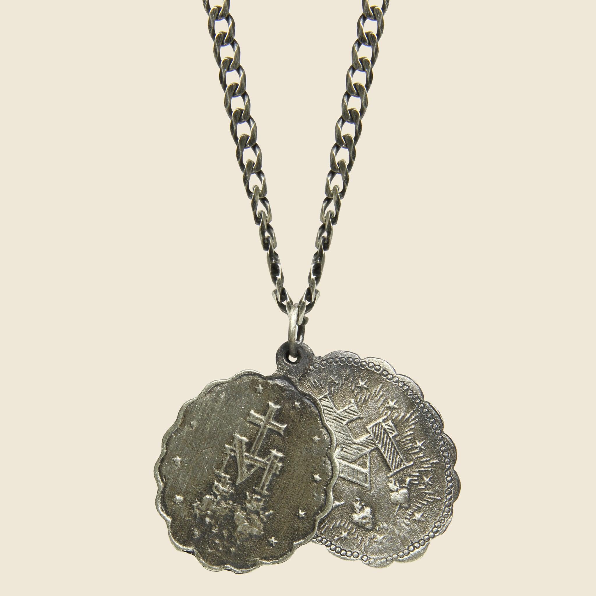 The Saints Necklace from Miansai features intricate depictions of "Our Lady of Victory" on two sterling silver pendants hanging on a delicate 25" chain. Handmade in the US using a special antique reproduction process. The Saints Necklace is timeless and made to last through the generations. American-handmade 25" chain necklace Etched designs Scalloped-edge saint pendants Lobster clasp closure Made in USADimensions: Chain: 25 1/2" | Pendant: 3/4" x 1/2"