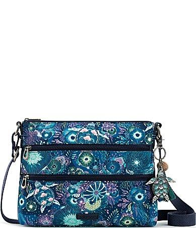 From Sakroots, the Basic Zip Top Royal Blue Seascape Crossbody Bag features:Polyester twillAntique silver hardwarePolyester liningZip closureAdjustable webbing strapTwo multifunction pockets and one zip pocket insideTwo zip pockets and one back zip pocket outsideDurable, water repellent, and stain resistantCritter keychainApprox. 12.25 L x 2.75 W x 9 H bag; 23 strap dropImported.