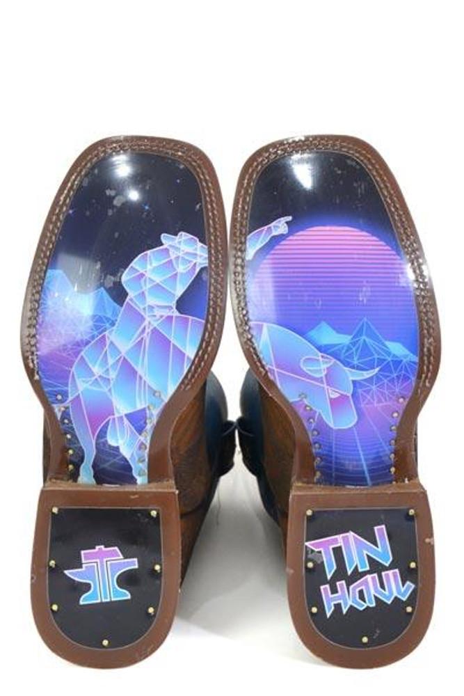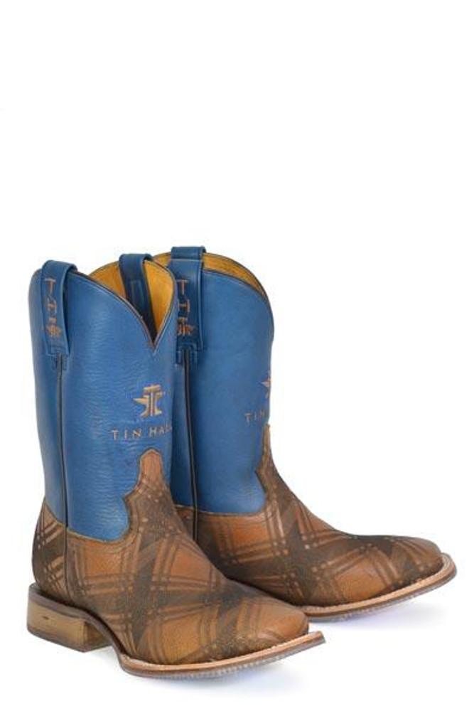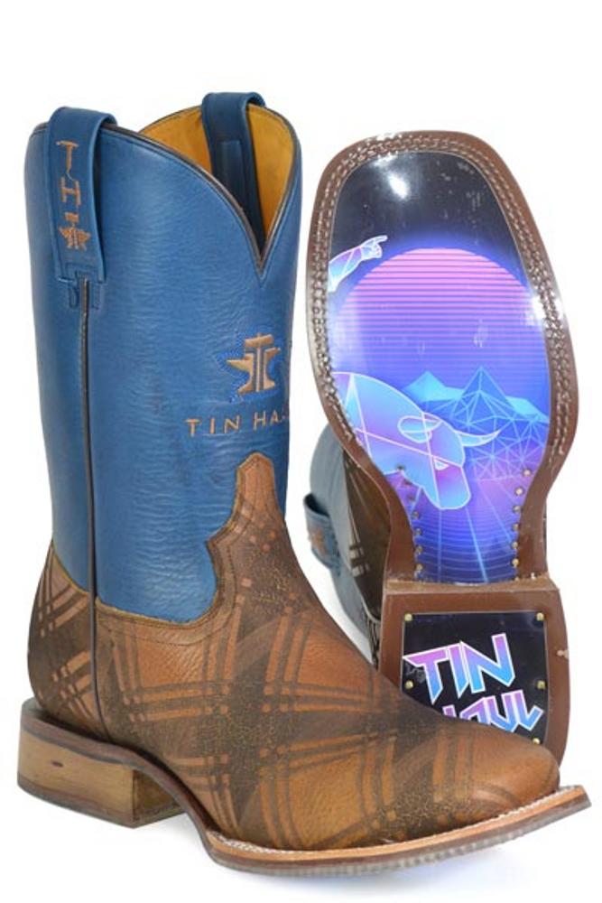 SALE Tin Haul® Men's Criss Cross Tan/Blue Upper Geo Rider Sole Square Toe Boots