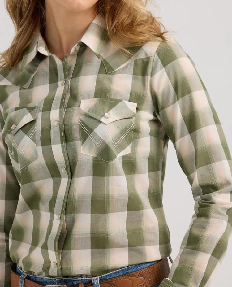 SALE Wrangler® Ladies' L/S Olive Green Plaid Essential Snap Shirt