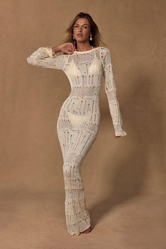 From the Amalfi Coast to the beaches of Bali, cool girl status will follow you from shore to shore with this sheer crochet cover-up. The chic maxi silhouette features strategic distressing and dainty sequin details throughout, along with a boat neckline, long sleeves, and two adjustable straps that cross the alluring open back. Throw it over any bikini and pair with shades for a look that is ready to strut.