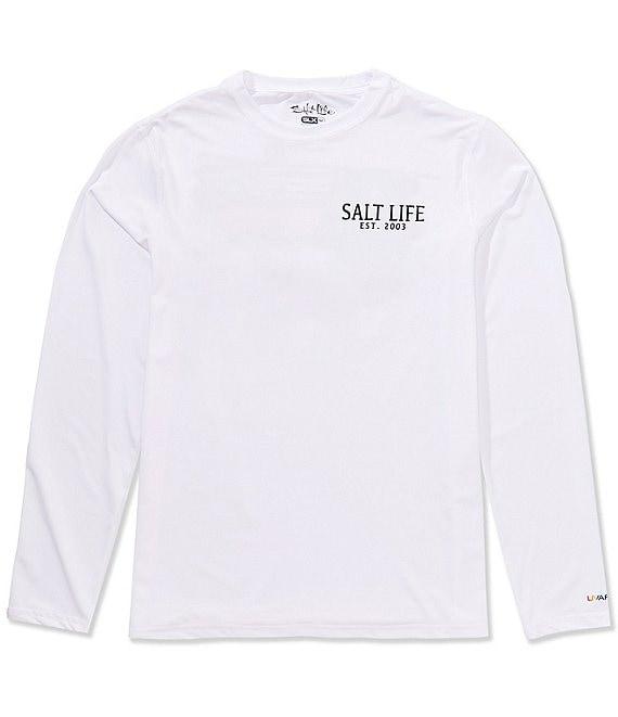 From Salt Life, this t-shirt features: Crew neckline Long sleeves Americana surf board design and "Salt Life" logo graphic Pullover styling Polyester/spandex Machine wash/tumble dry Imported.