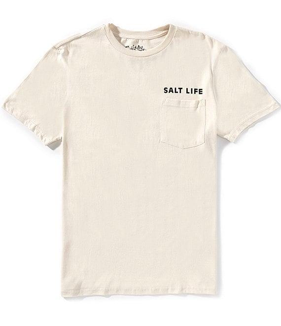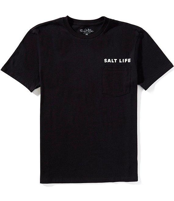 From Salt Life, this t-shirt features: Crew neckline Short sleeves Left side patch pocket Logo printed above chest pocket Graphic on the back Classic fit Pullover construction Cotton Machine wash/tumble dry Imported.