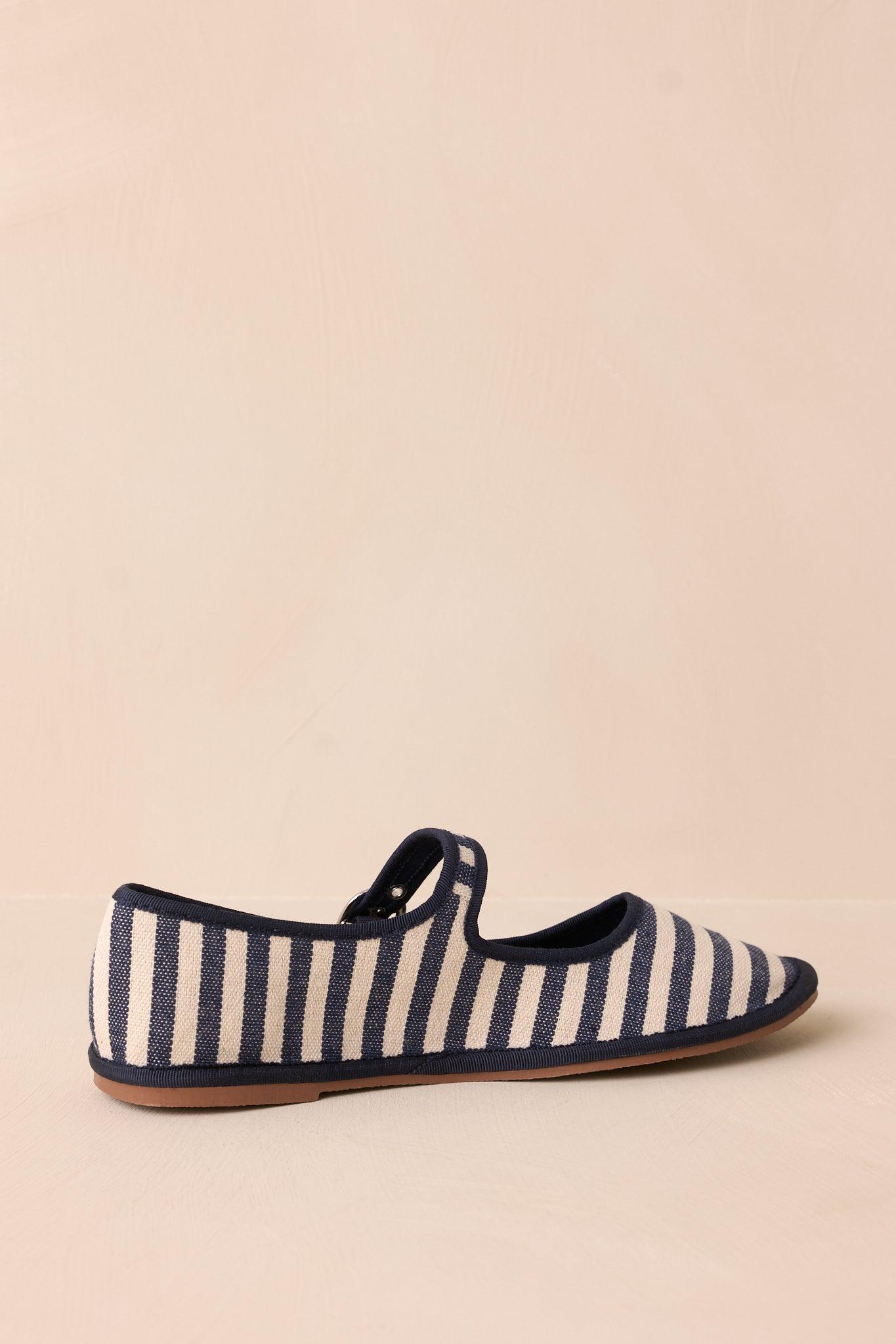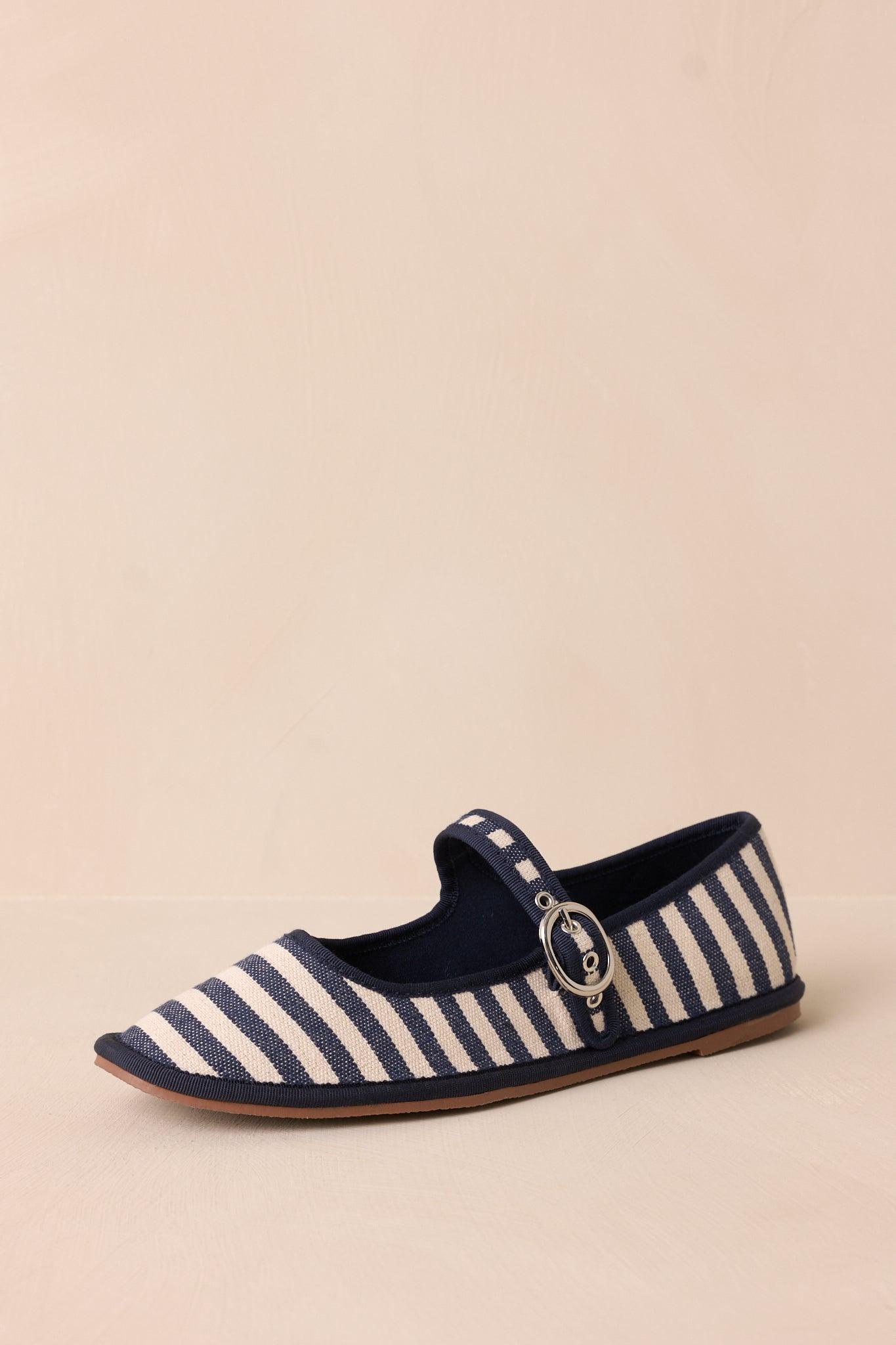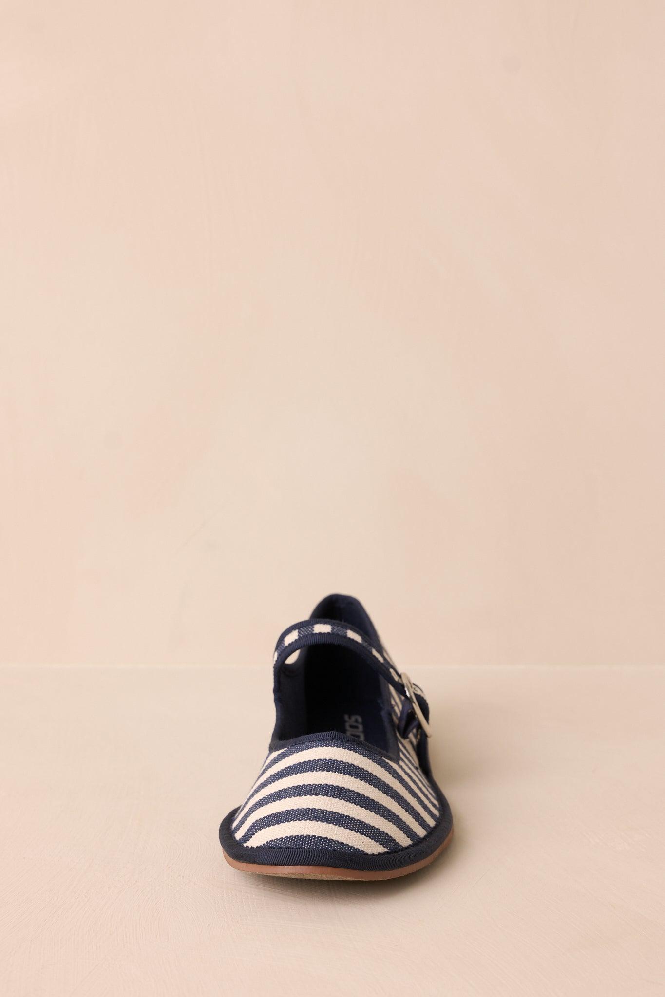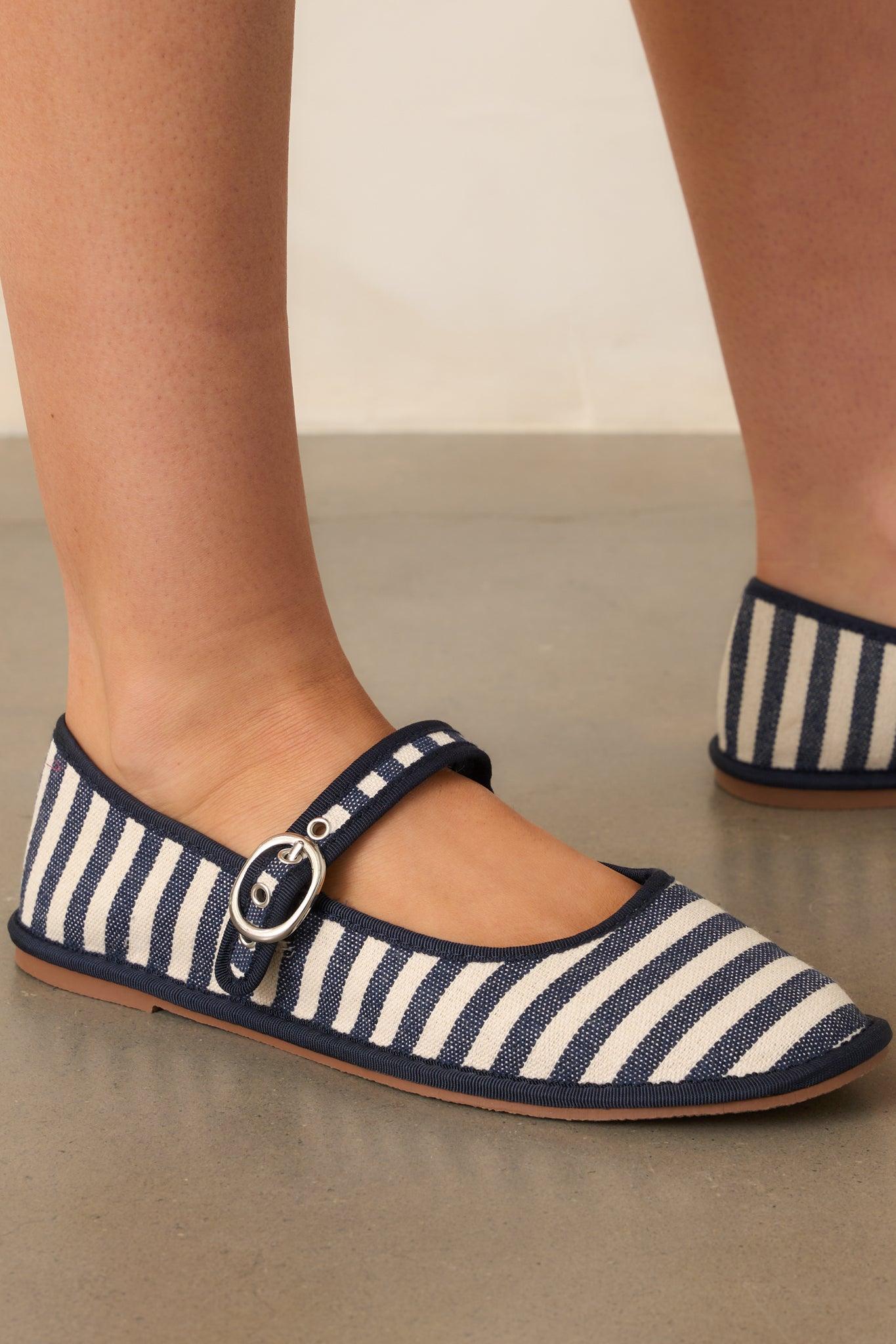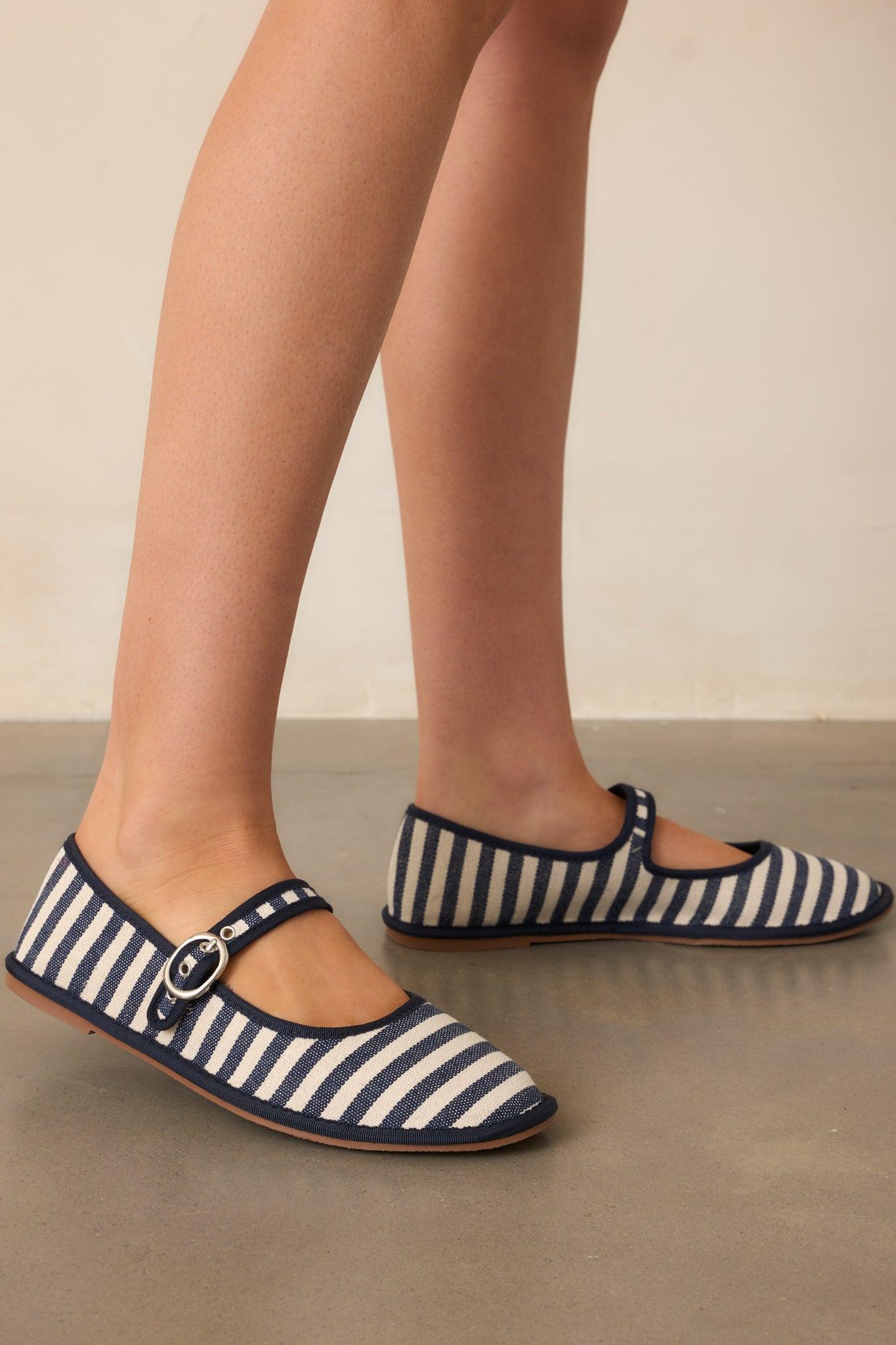 Take a leisurely stroll by the coastline in our Saltwater Stroll Navy Stripe Mary Jane Flats. With their classic navy and white stripes and comfortable Mary Jane style, these flats provide both style and comfort. Perfect for a day by the water, these flats are a must-have for any fashion-forward woman. These navy and white striped flats feature a cloth material, navy blue detailing around the edges, a brown sole, a buckle across the foot strap, and a rounded toe. All Man Made Materials Manufactured in China Designed in The USA True To Size