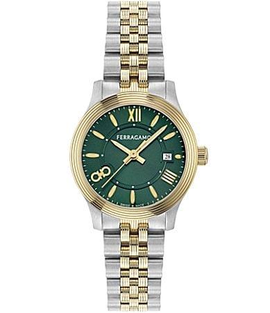 From the Ferragamo Duo Collection. A timeless FERRAGAMO timepiece, the Duo bracelet watch features a rich green guilloch dial with a double Gancini symbol at eight oclock to emphasize brand identity. To complete the look, a stainless steel two-tone bracelet fastens with a deployment buckle. Swiss quartz movement Fixed bezel Sapphire crystal Screw-down crown Green dial Baton hour markers Date display at 3 oclock Second hand Stainless steel Deployant buckle Made in Switzerland FEATURES Water resistant to 3 ATM Model number: Sfac00424 SIZE Round case: about 28mm (1.1) Stainless steel bracelet: about 14mm (0.5) ABOUT THE BRAND Italian designer Salvatore Ferragamo began his journey in 1927 with a vision of creating the worlds most beautiful shoes. The label expanded to menswear in the 1970s, and remains famed for its made-in-Italy pieces. The craftsmanship inherent in its shoes is also found in accessories like sunglasses, belts and ties. The brands signature Gancini logo-a backwards horseshoe-can be found on its classic loafers and fine leather goods. Men Accessories - Watches > Ferragamo > Saks Fifth Avenue > Barneys. FERRAGAMO. Color: Two Tone.